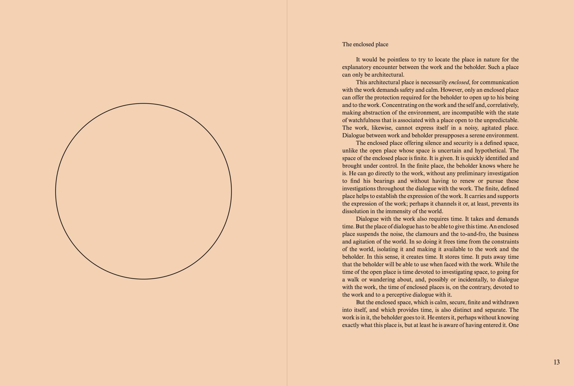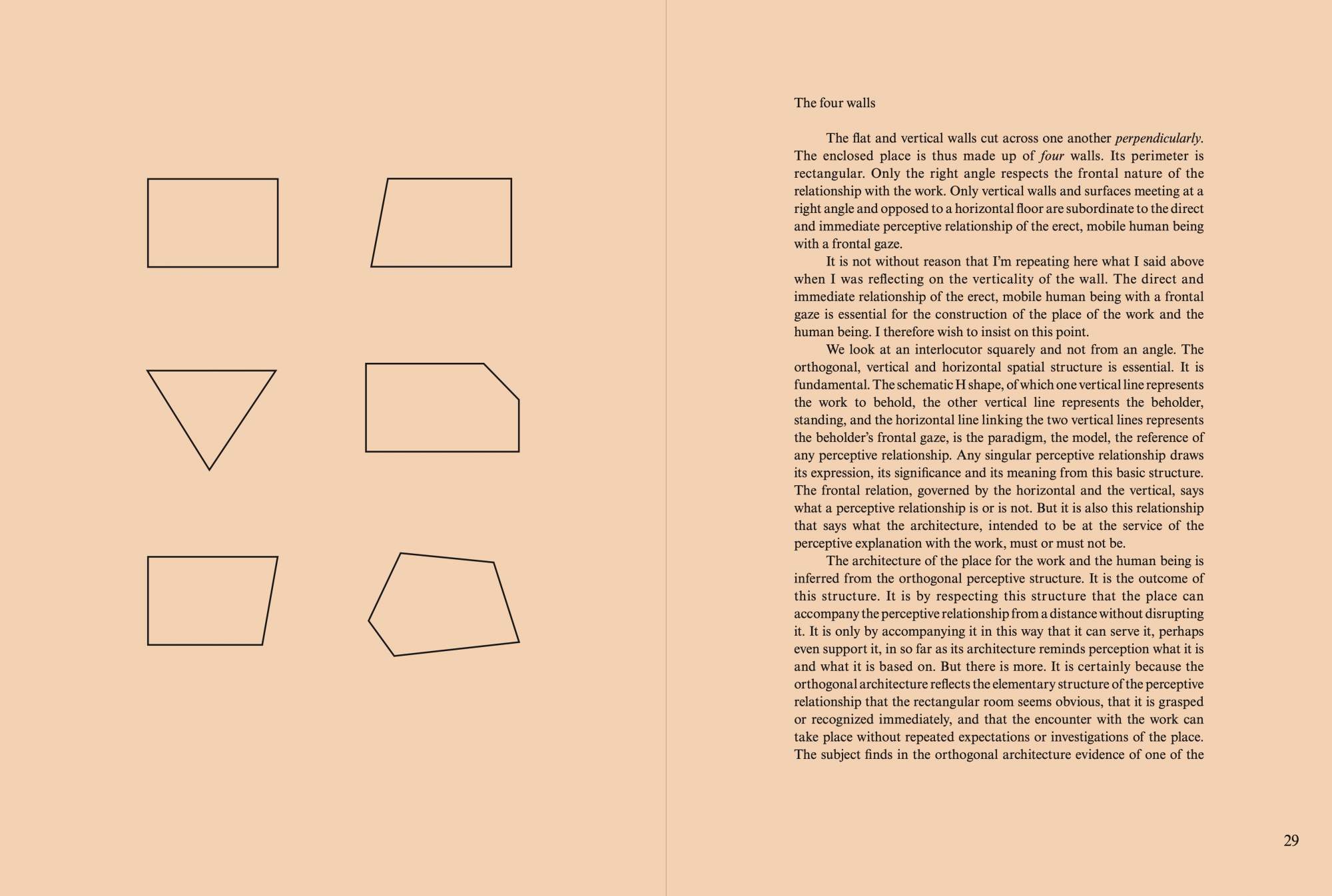 In his influential 1986 text, now translated into English for the first time, Swiss artist Rémy Zaugg (1943–2005) laid out fundamental ideas on the art museum. For him, the museum is an everyday tool that enables the encounter between viewer and work—raising the question of the kind of architecture appropriate for such a space. The text systematically addresses the floors, walls, and ceilings, as well as the proportion of the rooms, the position of the entrances, and the arrangement of the halls in the building. Against the backdrop of the postmodern gimmickry of new museums designed by self-obsessed architects, Zaugg advocates for a complete reflection on the museum’s function in order to arrive at a suitable architecture.