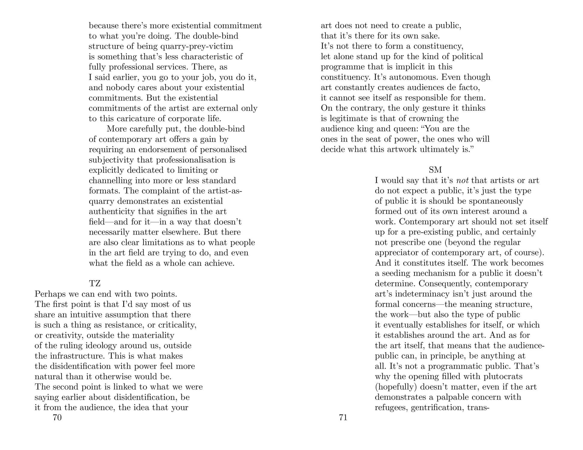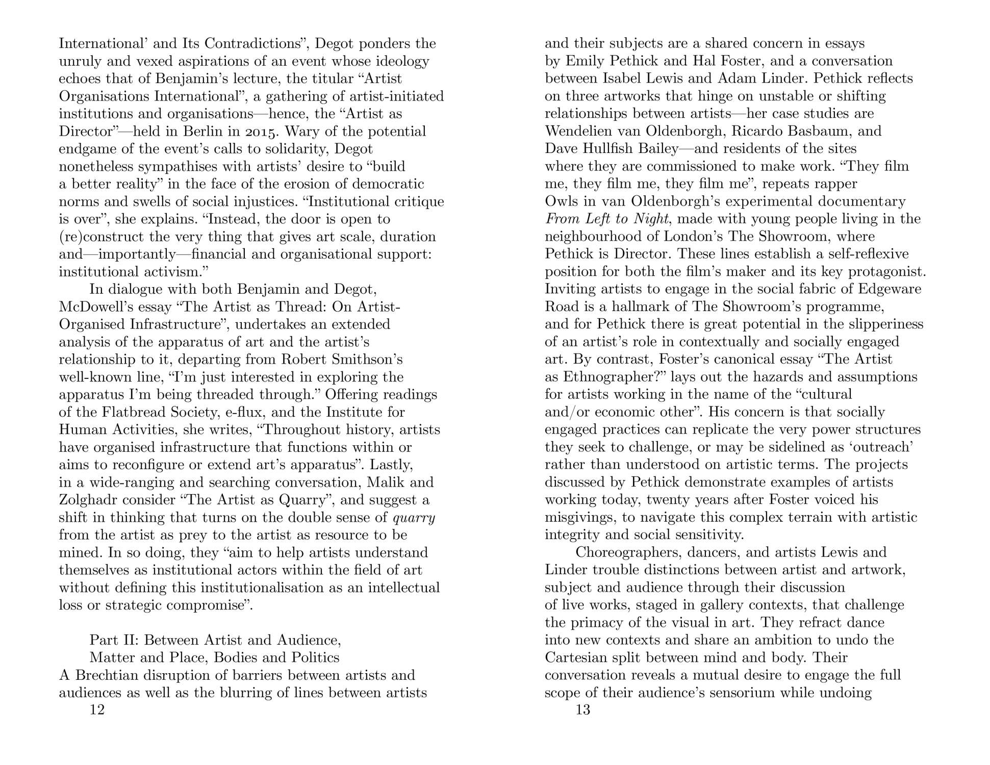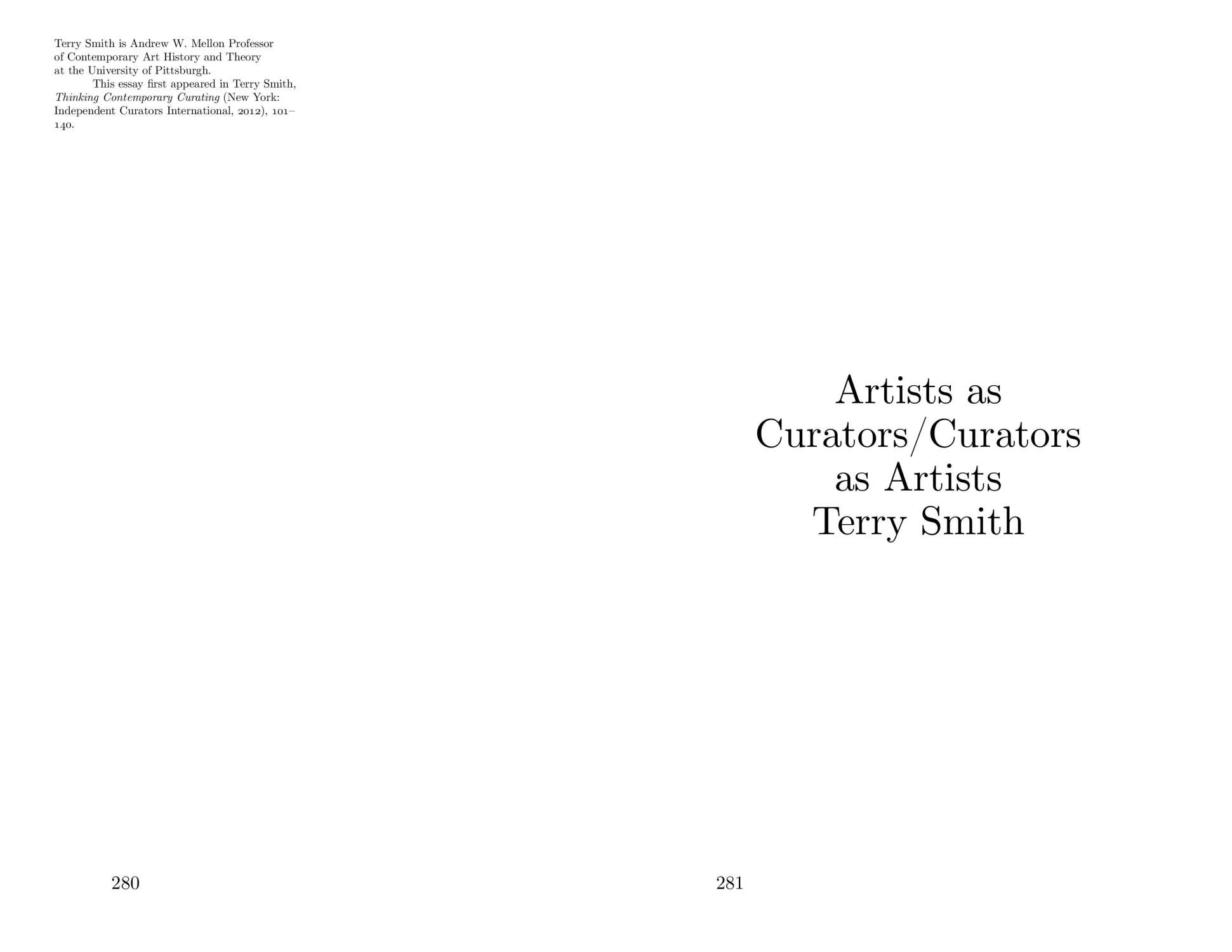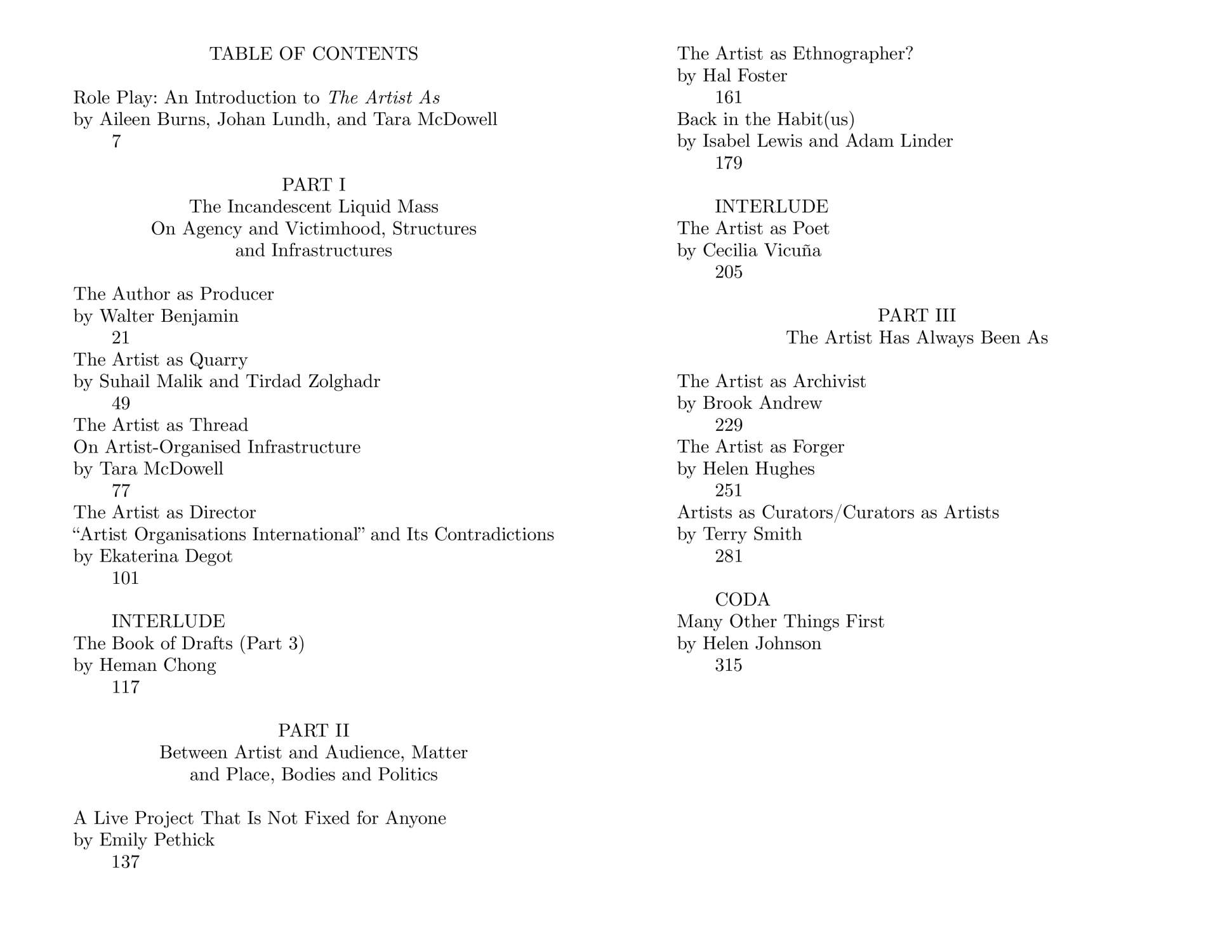 Does the way artists work today impact the ecology of art? Has the pluralism of art given way to a pluralism of roles that artists may occupy? What are the contemporary conditions of labor producing this new state of affairs, and what re-skilling does it ask of artists? These are some of the questions addressed in The Artist As, which comprises a number of contributions that seek to understand or explain the ways artists move through the world, and how that movement might necessitate other roles to pursue a project, a position, a politics, or a practice. For any given project, the artist may act as producer, quarry, thread, director, writer, orchestrator, ethnographer, choreographer, poet, archivist, forger, curator, and many other things first. Rather than self-identify solely as painters or sculptors, artists are now free to occupy specific roles temporarily, in what could be described as a kind of “occupational drag,” which is taken from Elizabeth Freeman’s term “temporal drag.”