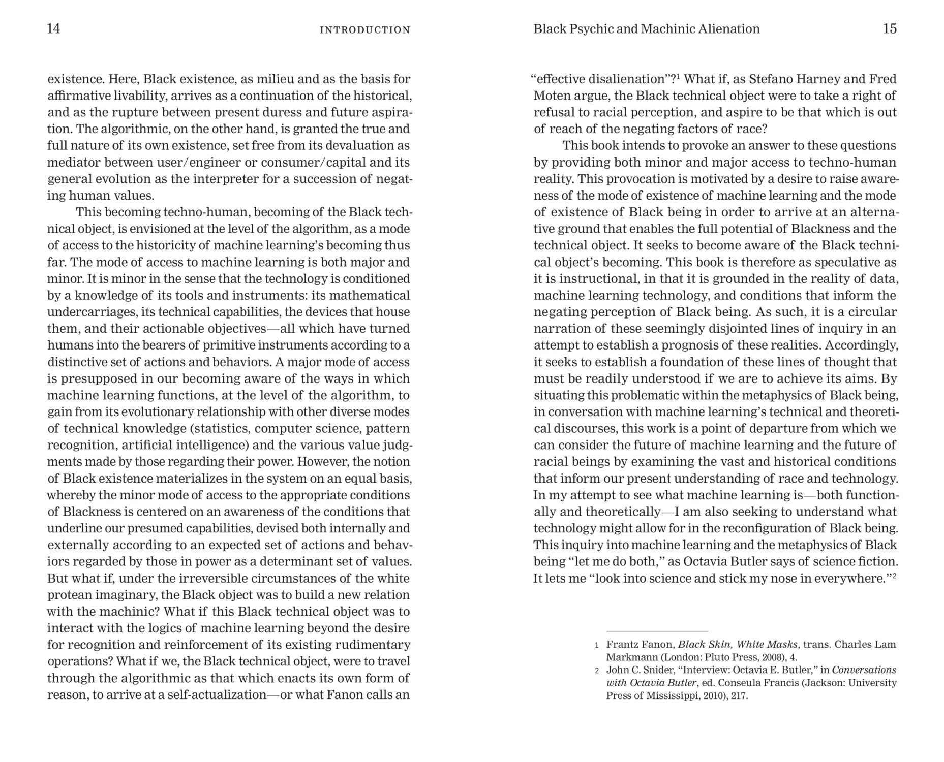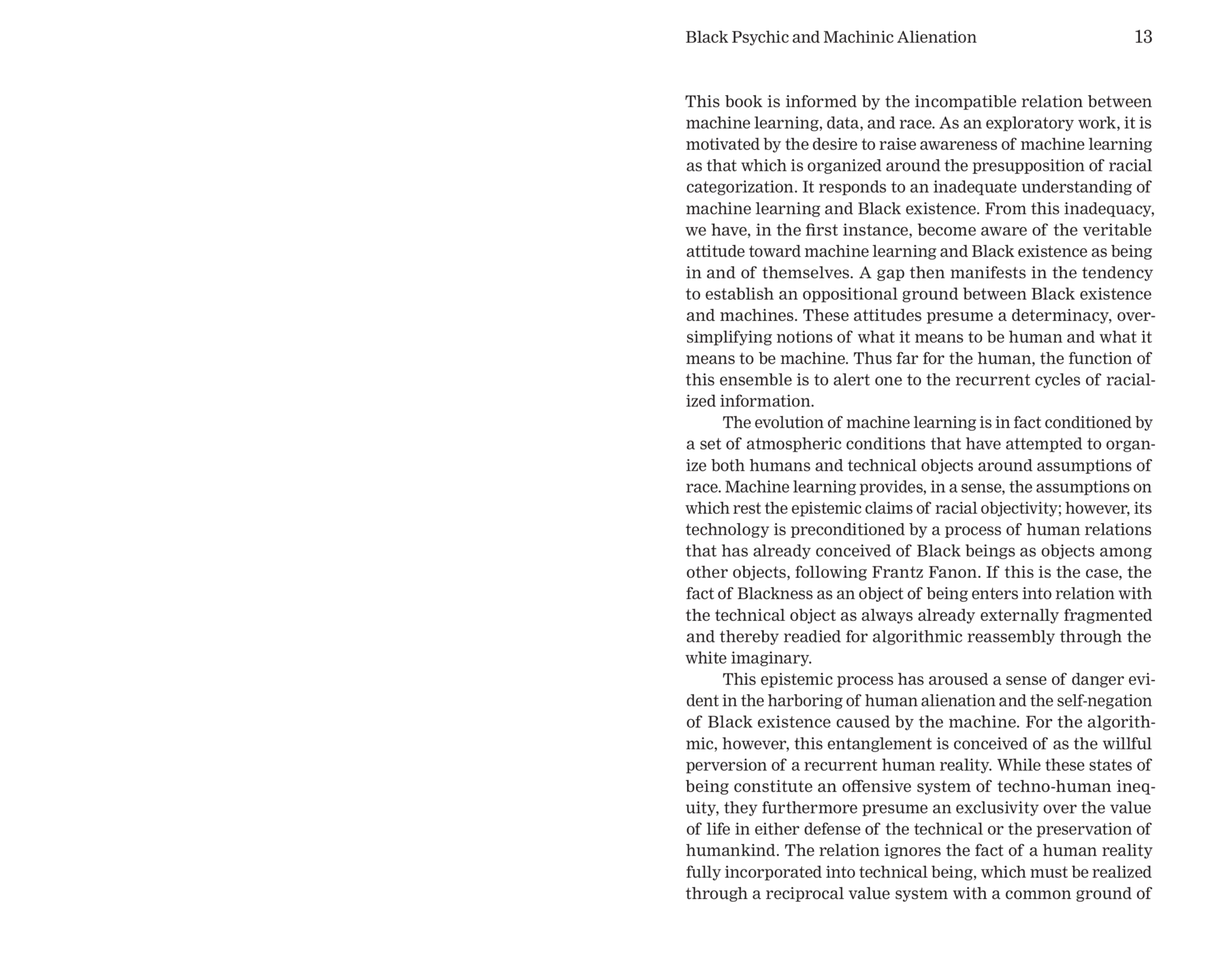 To impair the racial ordering of the world, The Black Technical Object introduces the history of statistical analysis and “scientific” racism into research on machine learning. Computer programming designed for taxonomic patterning, machine learning offers useful insights into racism and racist behavior, but its connection to the racial history of science and the Black lived experience has yet to be developed. In this book, Ramon Amaro explores how the history of data and statistical analysis informs the complex relationship between race and machine learning. He juxtaposes a practical analysis of this type of computerized learning with a theory of Black alienation in order to inspire alternative approaches to contemporary algorithmic practice. In doing so, Amaro contemplates the abstruse nature of programming and mathematics, as well as the deep incursion of racial hierarchies.