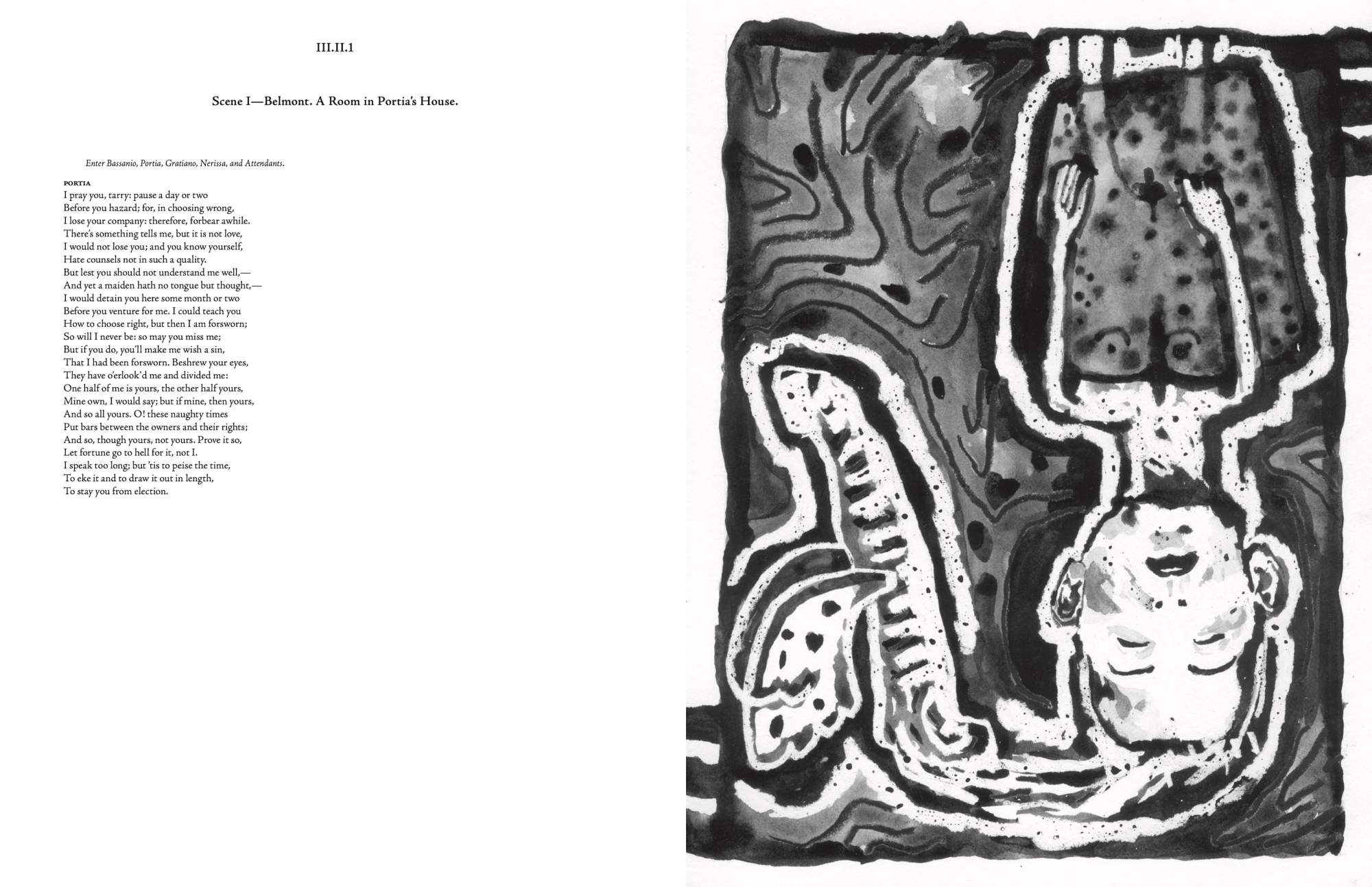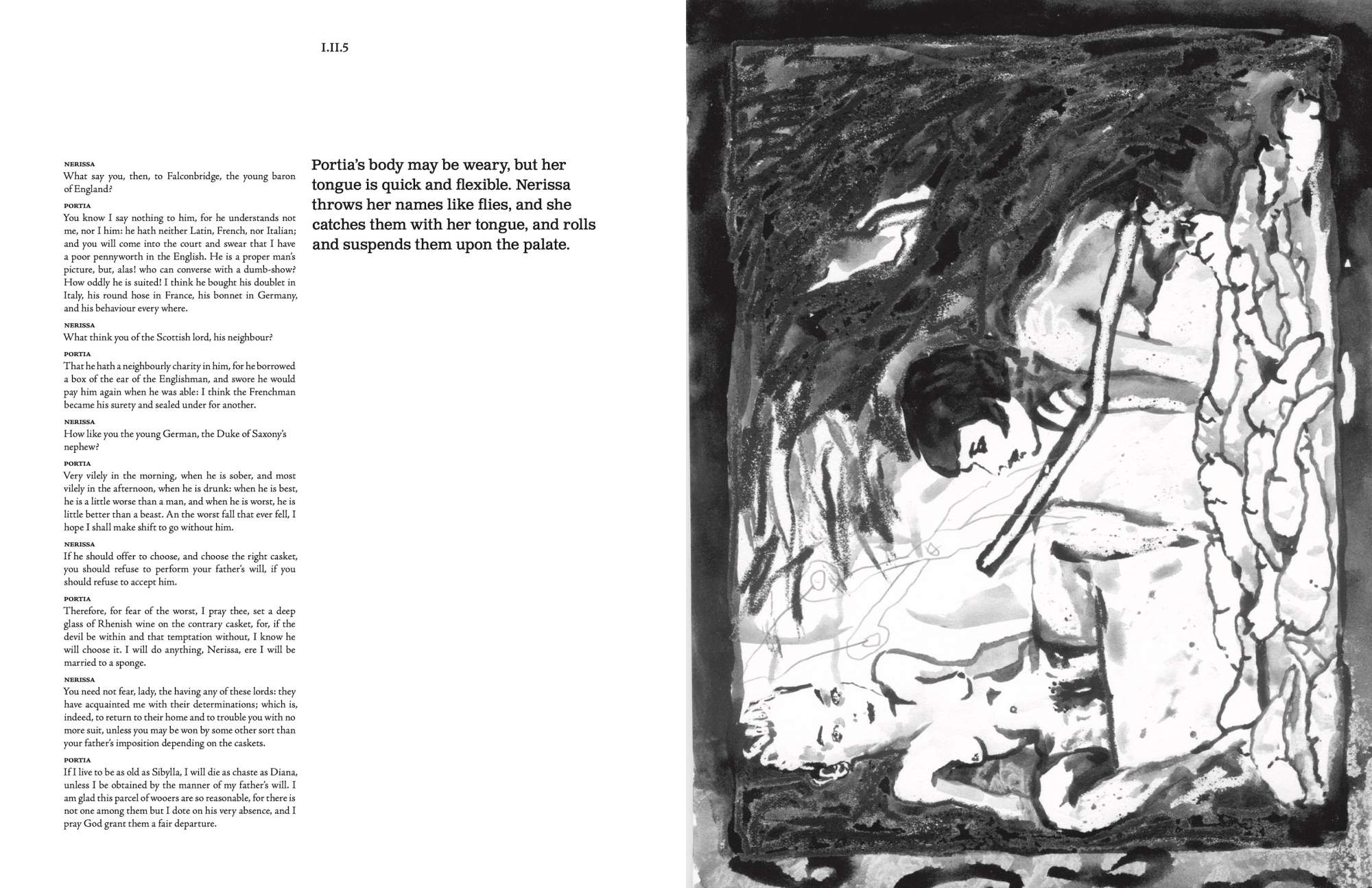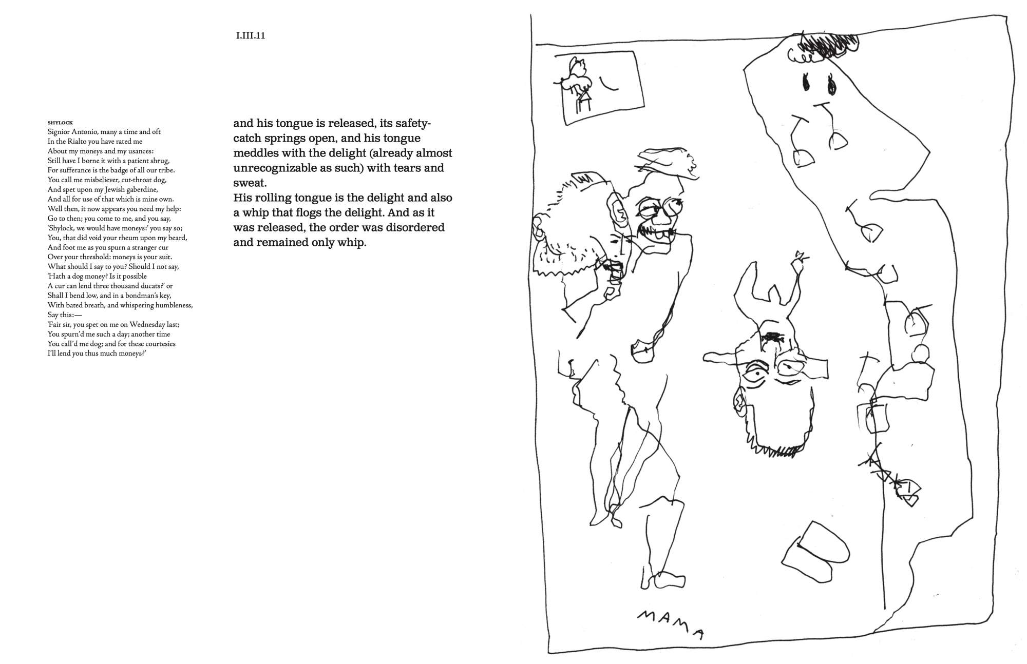 An artist book juxtaposing text and image, history and its revision, The Blind Merchant was produced from 1989 to 1991. The work is composed of three elements: the complete text of Shakespeare’s The Merchant of Venice; a “parasitical” text written by Roee Rosen that runs alongside the play, adopting the perspective of the principal antagonist Shylock, the Jewish moneylender; and 145 drawings that present an alternative approach to the drama’s staging and casting of characters—Shylock is depicted as the blind merchant with drawings made by the artist while blindfolded.