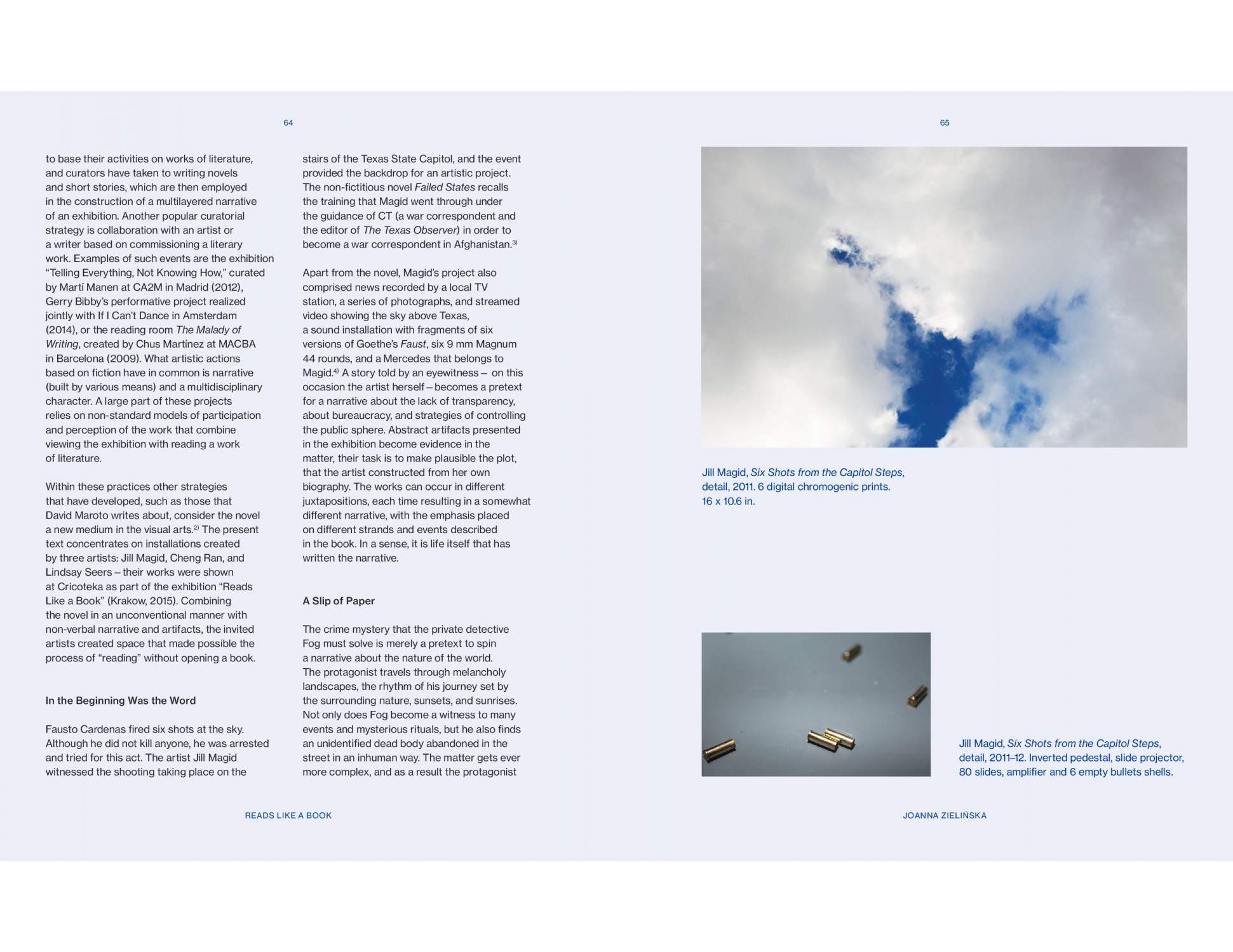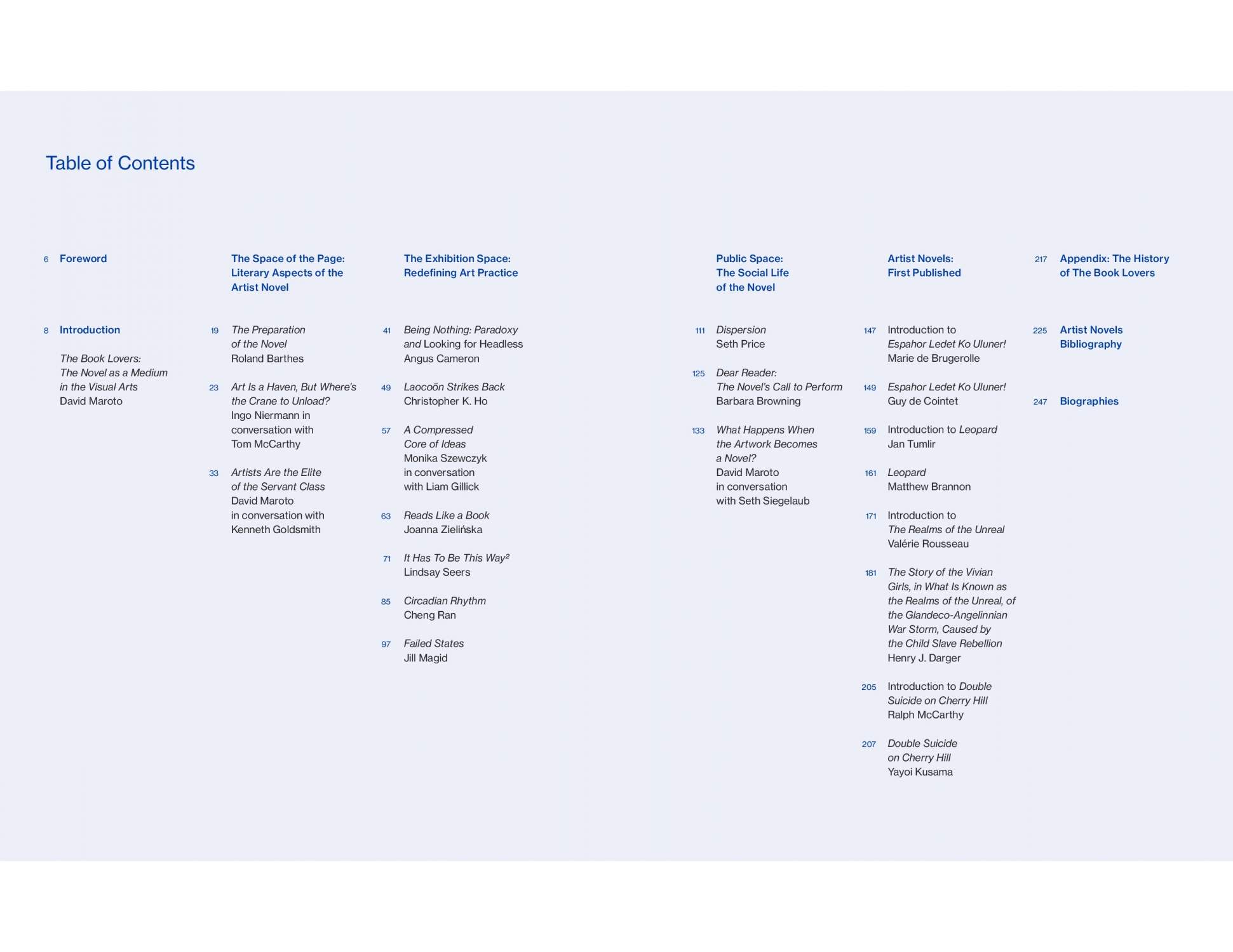 This publication is devoted to the phenomenon of the artist novel, and whether it can be considered to be a medium in its own right within the visual arts. Visual artists create different strategies to integrate their novels into their practice. Introducing traits that are particular to narrative literature into the visual arts implies the accentuation of some features over others, such as narration, fiction, identification, and the act of reading and its protracted engagement, as well as distribution in public space. An artist’s approach comes fundamentally from the visual arts. The creation of an artist novel doesn’t differ from any other artwork. Both processes feed into each other as they evolve within the same body of works. Thanks to the contributions of a selected group of artists, writers, curators, and scholars this publication strives to demonstrate that literature, when treated by visual artists, can take place well beyond the space of the book.