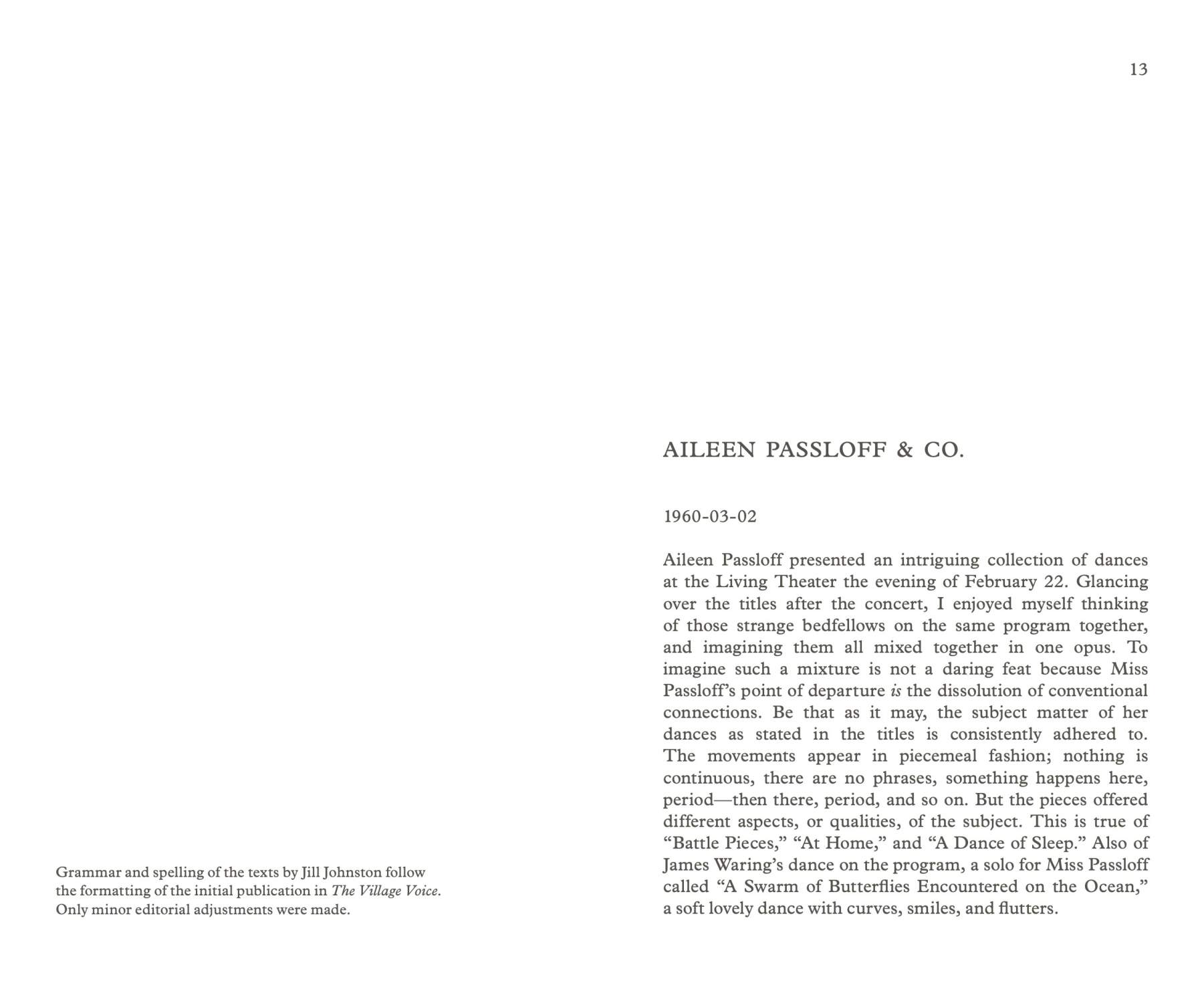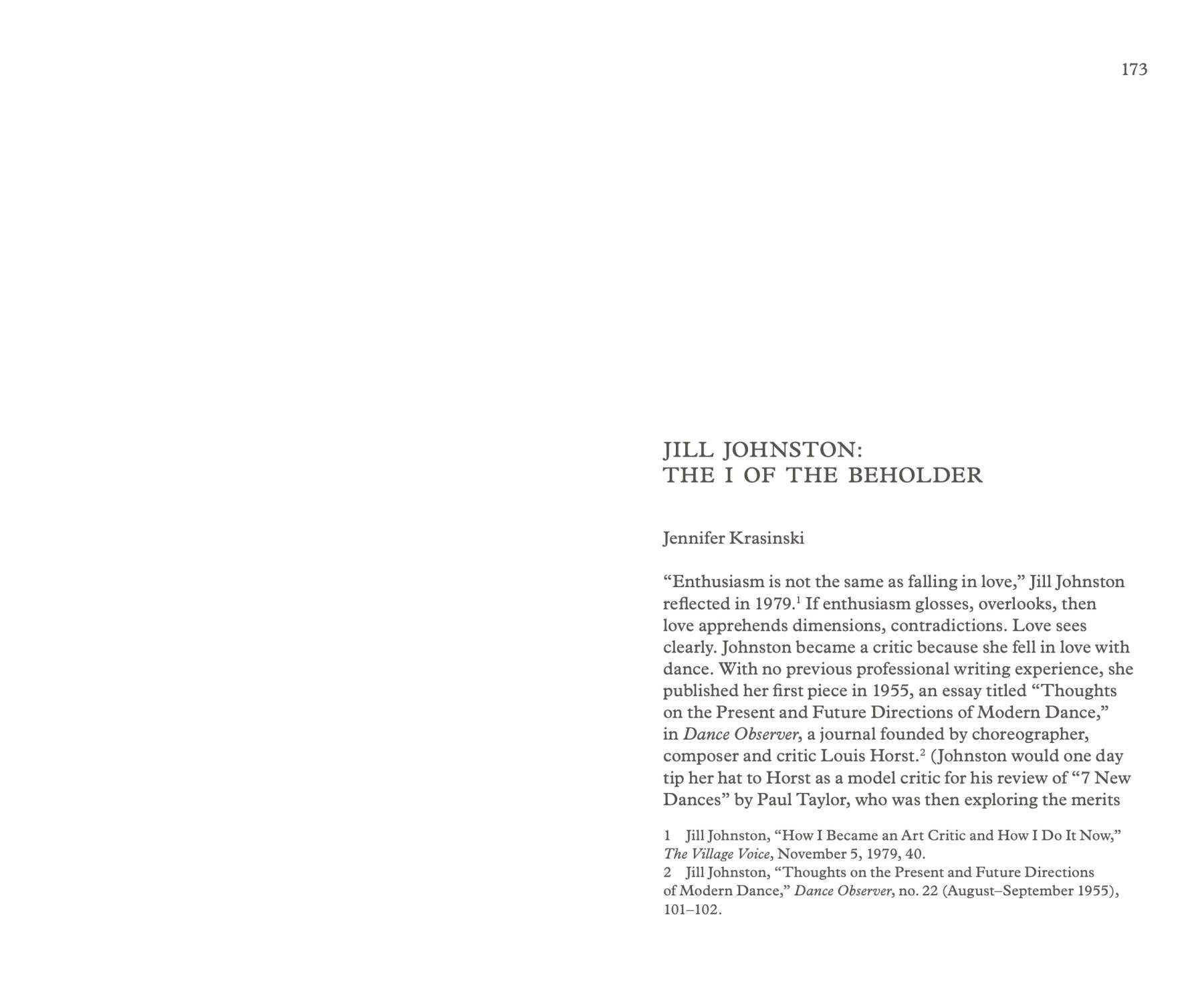Johnston’s original texts are accompanied by three new contributions by Ingrid Nyeboe, Bruce Hainley, and Jennifer Krasinski, as well as an appendix with archival material related to a panel Johnston organized in 1969, titled “The Disintegration of a Critic: An Analysis of Jill Johnston.”