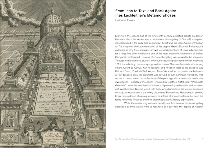 The Imagines is based on the texts of four writers that each engage with a recent project by Ines Lechleitner. In response to each critical contribution, Lechleitner develops a visual section where elements and fragments of the selected projects build up their own narrative in relation to the specific space of this book. The title borrows from a pedagogical text by Philostratus, a Greek sophist. The purpose of the original text was to act as a guide for Roman students on the paintings of their culture. The paintings are described in such a detailed and sensory manner that the reader can imagine standing in front of them. Paradoxically, it is not known if these paintings ever existed.