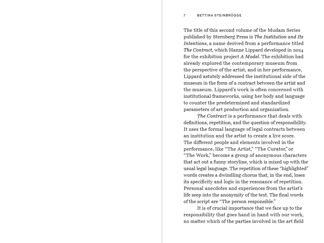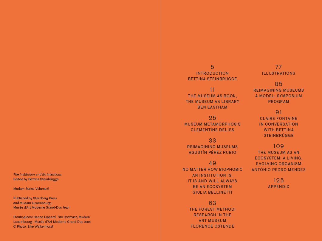 The Institution and Its Intentions is the second book in the Mudam Series. This series is an edited collection of interventions, symposiums, and lectures by artists, critics, writers, curators, art historians, and thinkers that have taken place at Mudam – The contemporary art museum of Luxembourg. Each volume is dedicated to a specific artist or theme, following the museum’s exhibition program. The series is meant as a collection of working documents that open up a dialogue beyond institutional walls—a gentle nod to books still being the greatest of meeting places. Mudam Series is conceived and edited by Bettina Steinbrügge and Mudam’s editorial team.