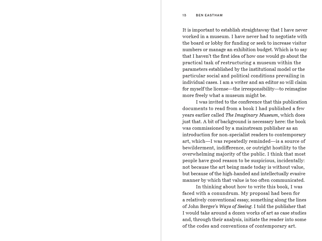 This publication collects and preserves the ideas put forward during the symposium “A Model: Reimagining Museums,” which took place at Mudam – The Contemporary Art Museum of Luxembourg, in June 2024. The convening explored the mission of museums today and examined how contemporary institutions can continue to serve as sources of culture, preservation, education, and community in the future.