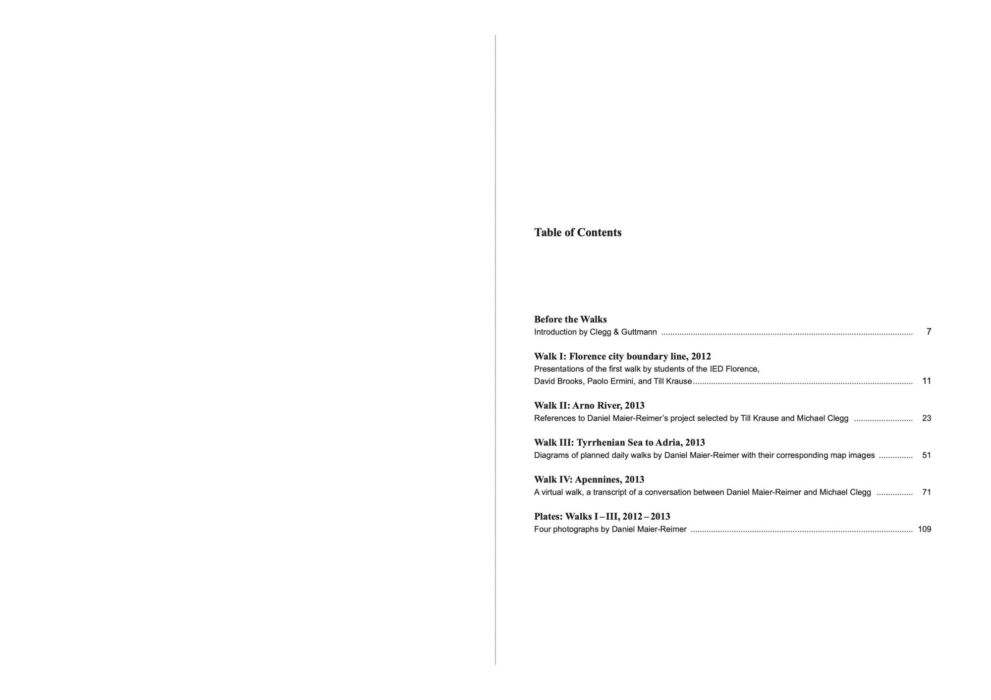 The publication, conceived by Clegg & Guttmann, is a response to Maier-Reimer’s invitation to present his recent body of work for his contribution to the exhibition “Villa Romana 1905–2013: Das Künstlerhaus in Florenz” at the Bundeskunsthalle, Bonn. It features an introduction by Clegg & Guttmann, works by the students of IED Florence, David Brooks, Paolo Ermini, and Till Krause, a conversation between Maier-Reimer and Clegg, as well as a photo series Plates: Walks I – III, 2012–2013, four photographs selected by Maier-Reimer of his first three walks.
