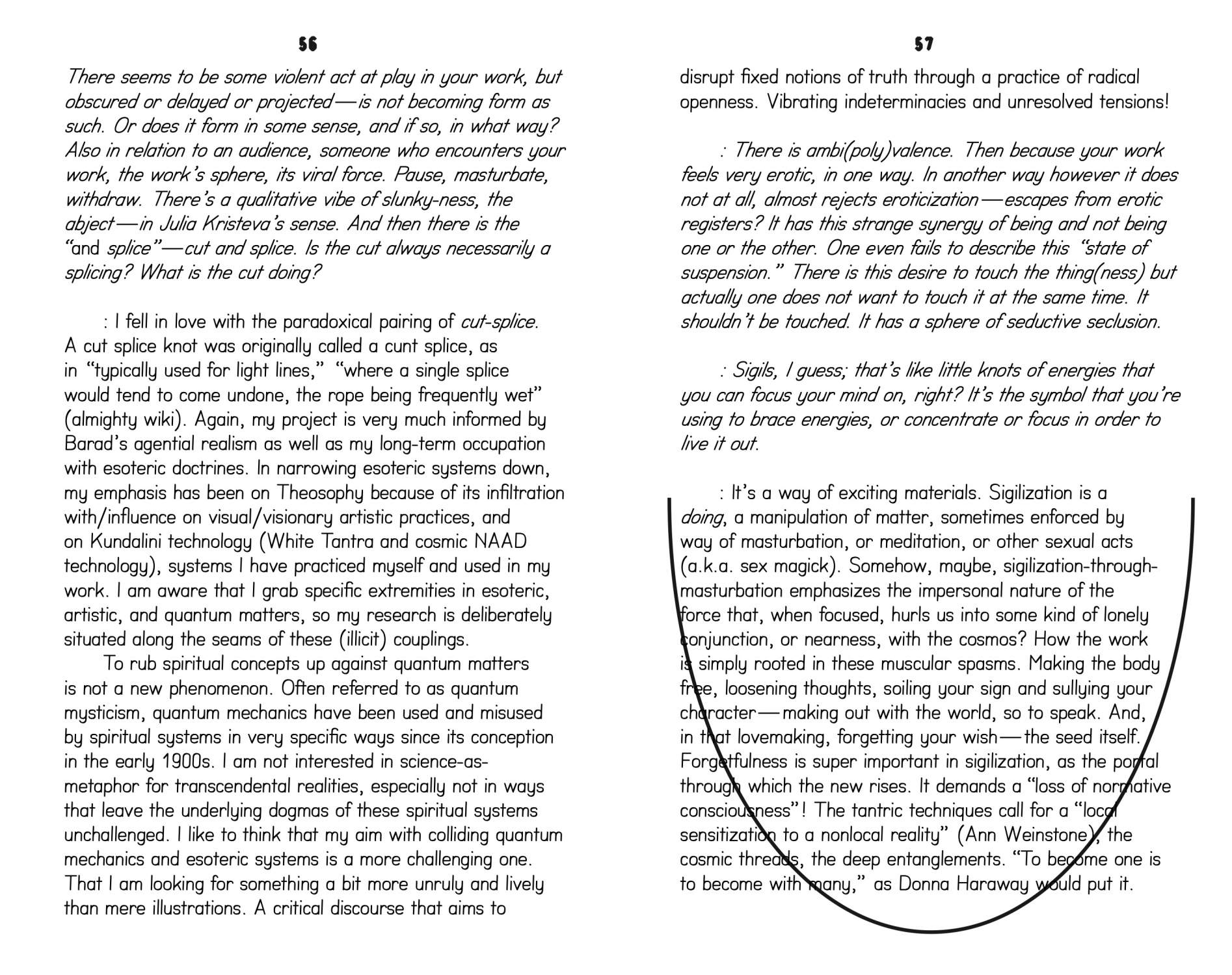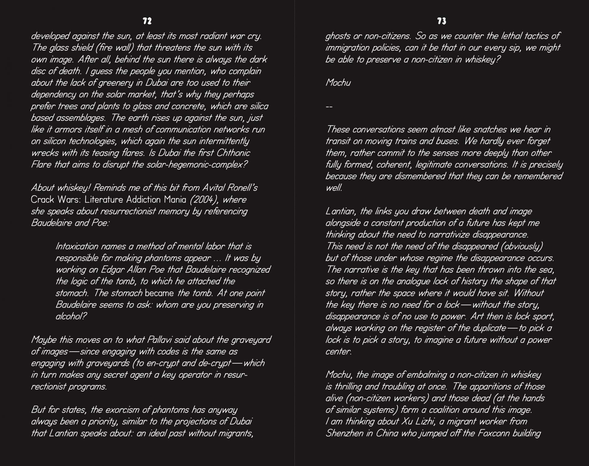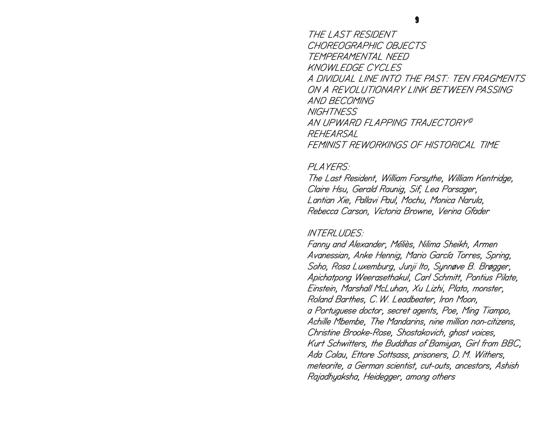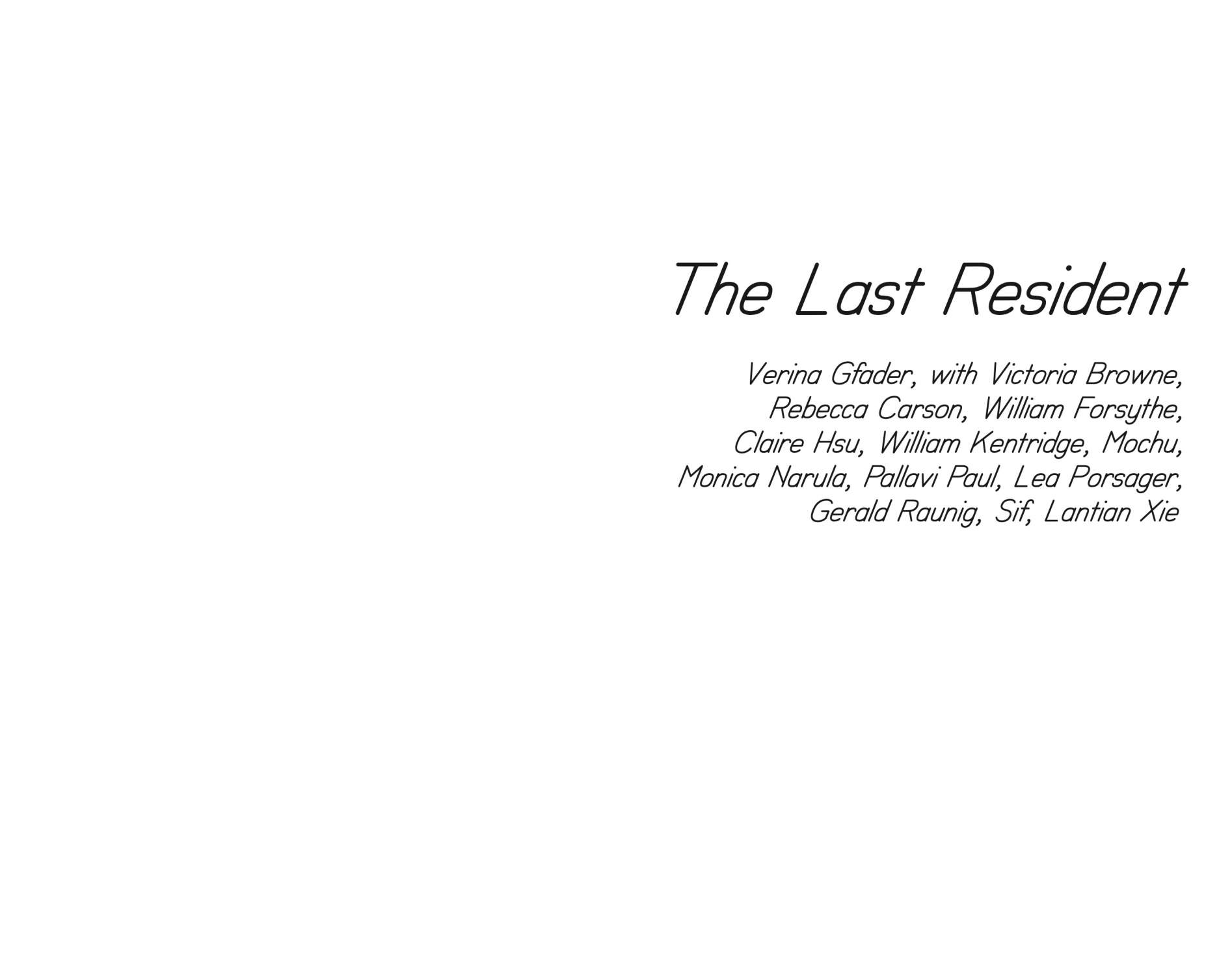 Hardly a gray matter of catching the spirit of our present. From the sun-drenched-ness of the Dubaian atmosphere, to the feathery encounter in a secret printing workshop, words and materials are discreetly—spectrally, outspokenly—put forward: a bunch of residents cruising the seas of nine temporary realities, the result of an ongoing swapping of facts and speculations from the earthly realm. At one end of the spectrum, players, voyagers, entering the machinery (cacophony) of thought processing. At the other, the anchoring point, The Last Resident, one who opens a possible scene.