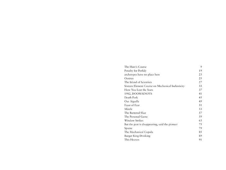The Mechanical Copula is the first collection of short stories by Maria Fusco. Stripping bare the accord of culture and commodity, this sequence of stories tracks the slimy path of social mobility with serious playfulness and an eye for the absurd. Tales of Donald Sutherland fucking a doll, two men eating a clown, and how the obsessive searching of bins can transform trash into meaning, this is a book about the porous relationship between the extramundane and the average.