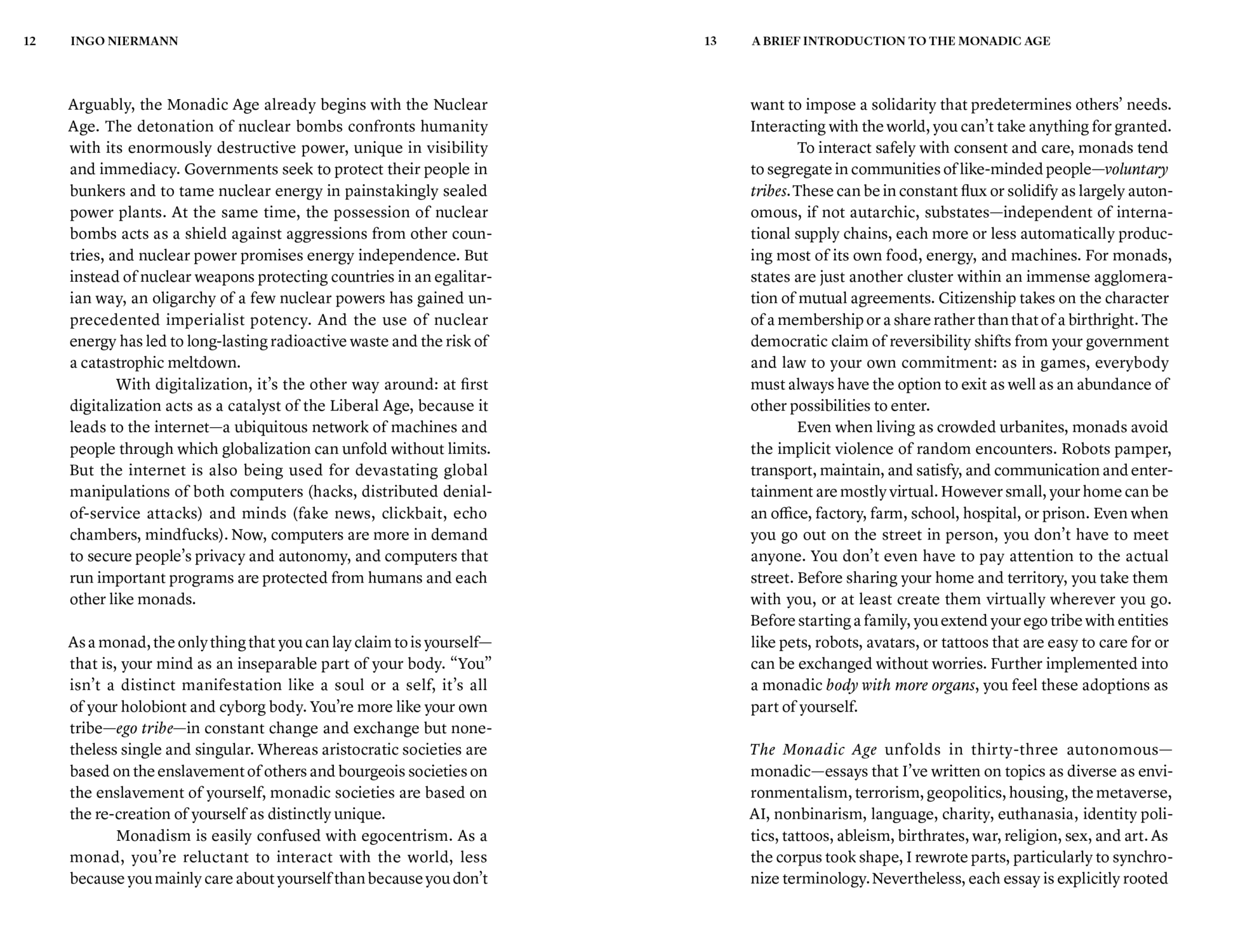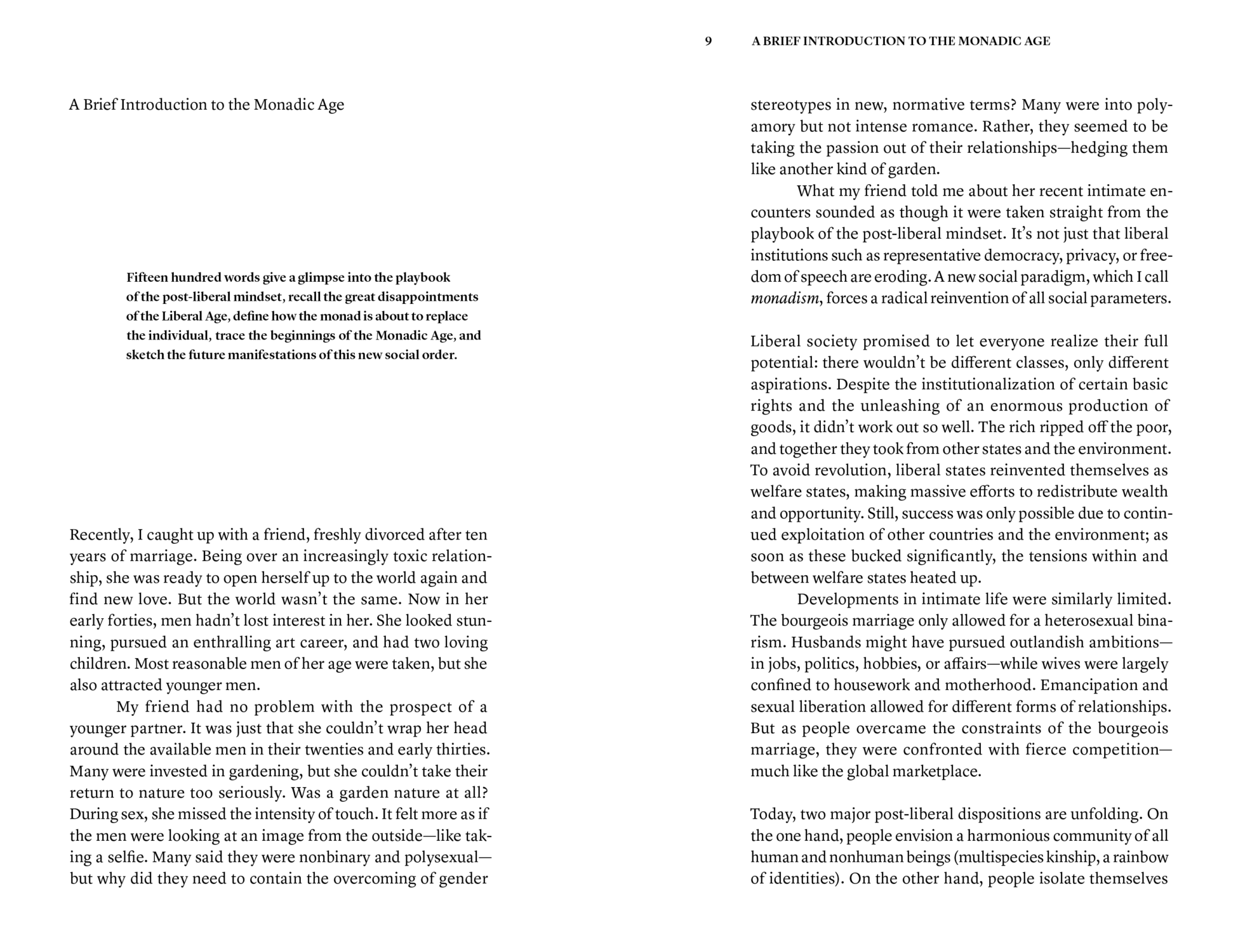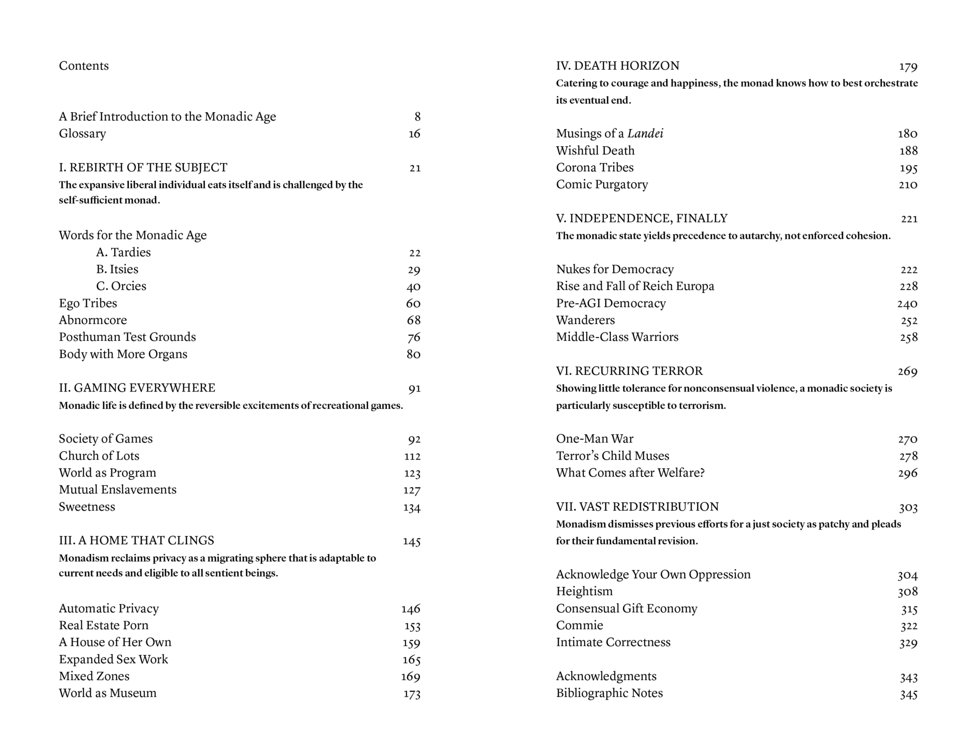 The Monadic Age unfolds in thirty-three autonomous—monadic—essays on topics as diverse as environmentalism, terrorism, geopolitics, housing, the metaverse, nonbinarism, language, charity, euthanasia, identity politics, tattoos, ableism, AI, birthrates, war, religion, sex, and art.