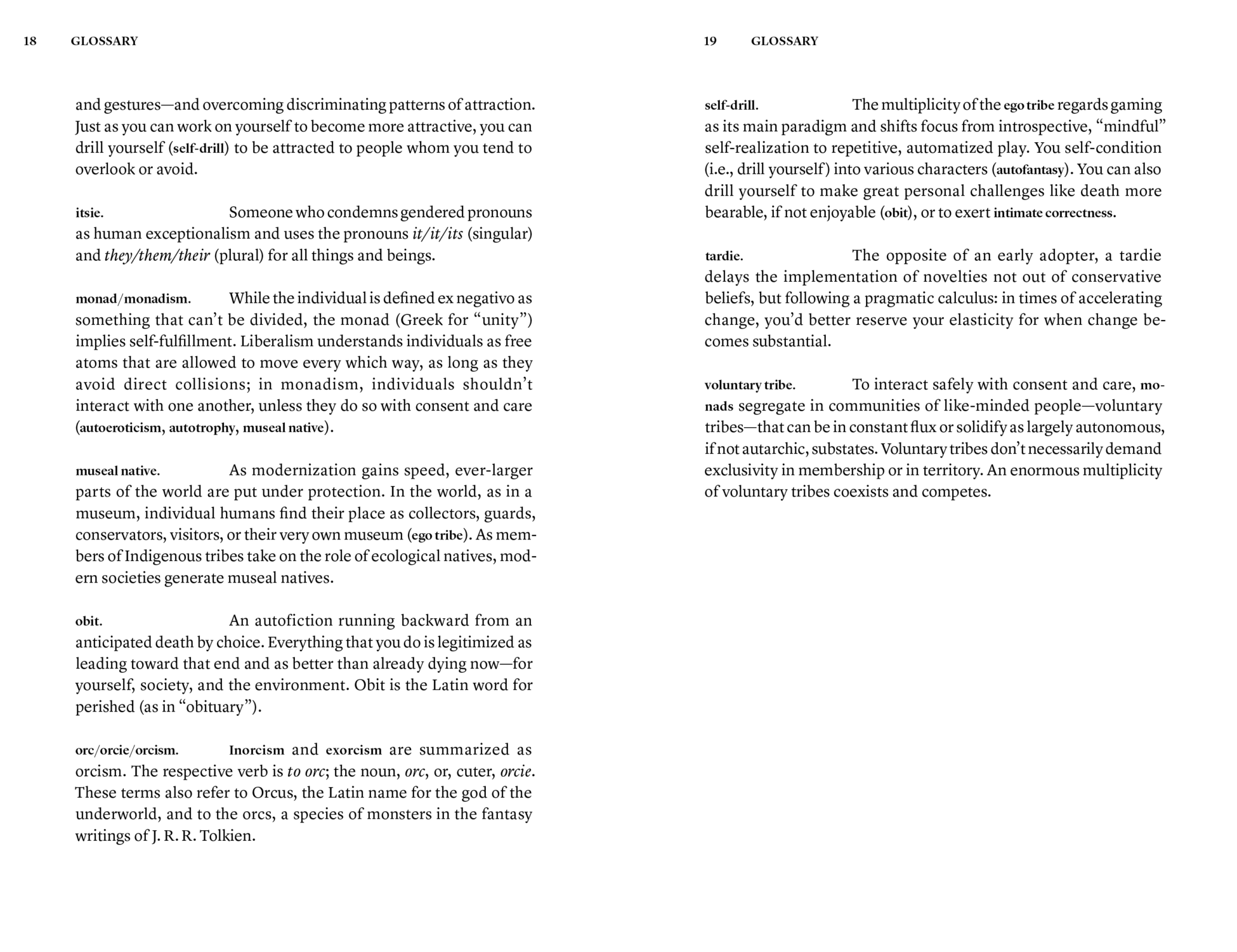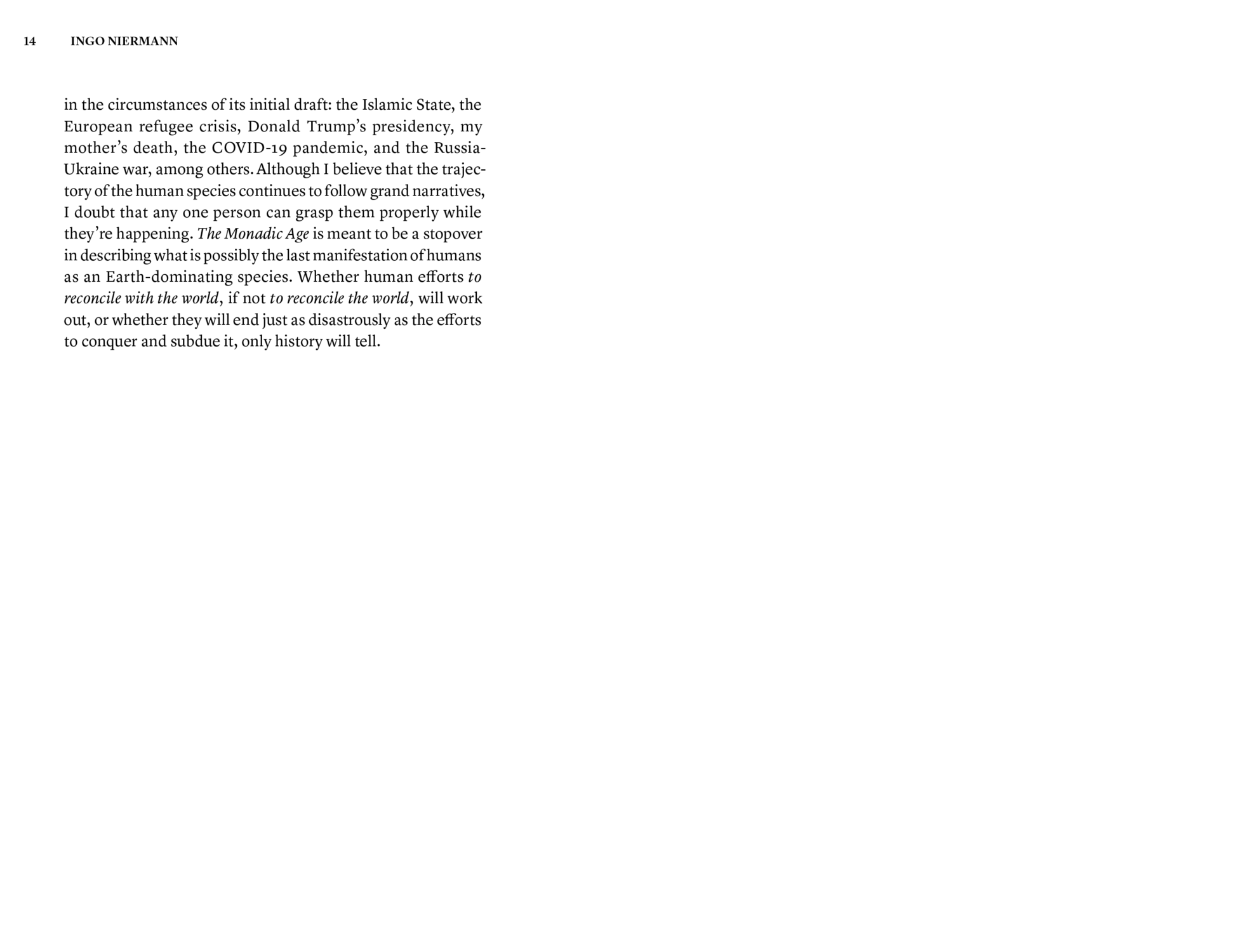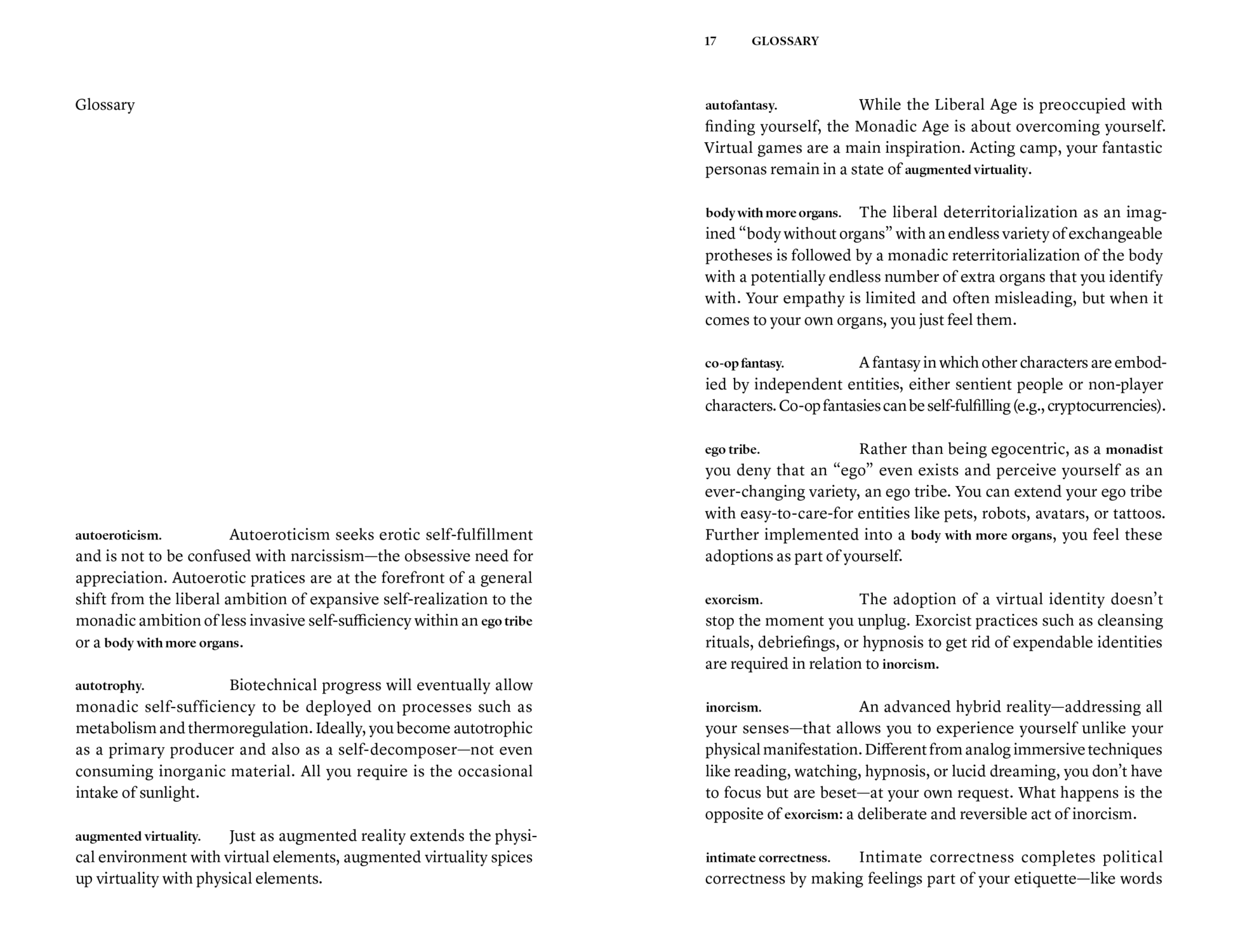 The Monadic Age unfolds in thirty-three autonomous—monadic—essays on topics as diverse as environmentalism, terrorism, geopolitics, housing, the metaverse, nonbinarism, language, charity, euthanasia, identity politics, tattoos, ableism, AI, birthrates, war, religion, sex, and art.