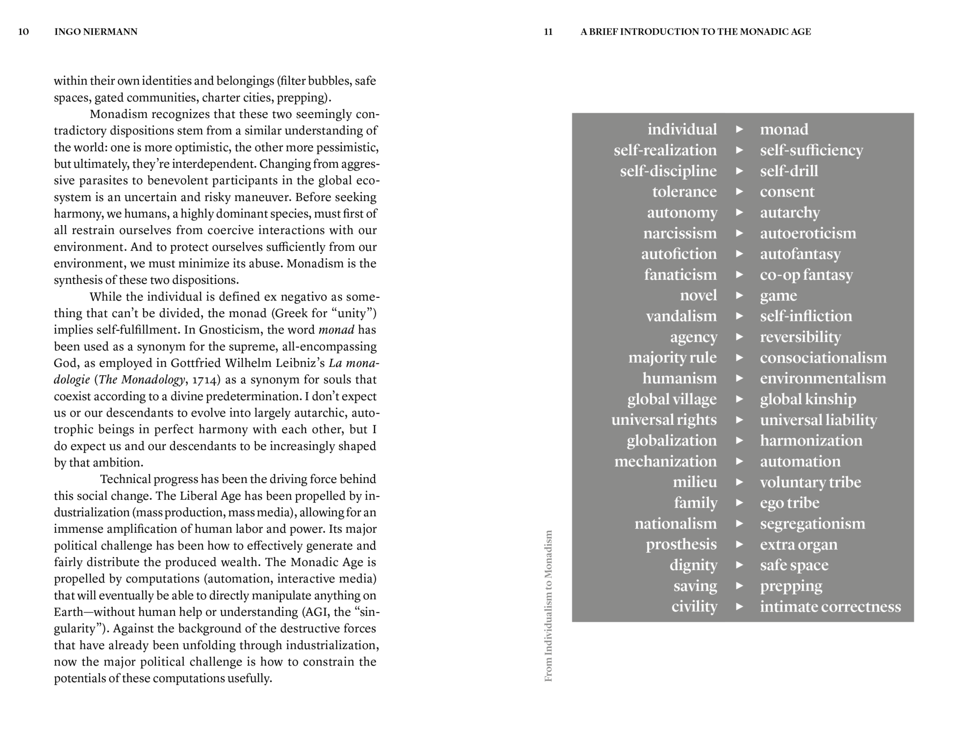 The world is marked by deepening conflicts—between democracies and autocracies, woke and populist identity politics, rich and poor, continued environmental exploitation and harsh complications like climate change. In The Monadic Age, Ingo Niermann argues that, stirred by rapid developments in automation and AI, these manifold crises are about to culminate in a new paradigm of self-sufficiency—monadism—that overturns the liberal era and forces a reinvention of all social parameters.