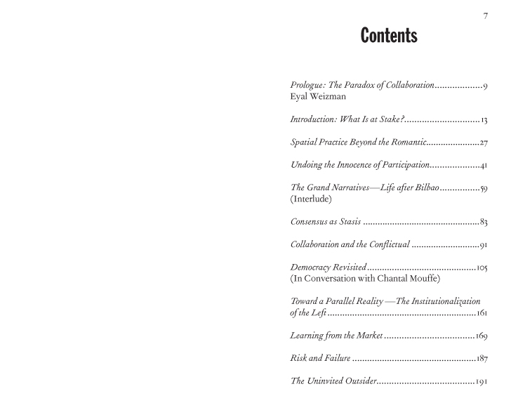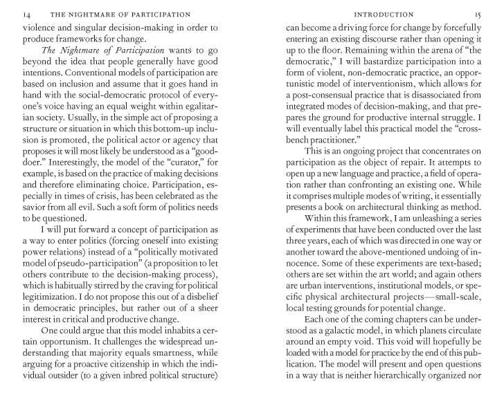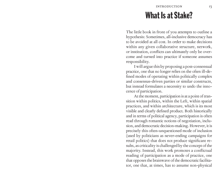 Miessen argues for an urgent inversion of participation, a model beyond modes of consensus. Instead of reading participation as the charitable savior of political struggle, Miessen candidly reflects on the limits and traps of its real motivations. Rather than breading the next generation of consensual facilitators and mediators, he argues for conflict as an enabling, instead of disabling, force. The book calls for a format of conflictual participation—no longer a process by which others are invited “in,” but a means of acting without mandate, as uninvited irritant: a forced entry into fields of knowledge that arguably benefit from exterior thinking. Sometimes, democracy has to be avoided at all costs.