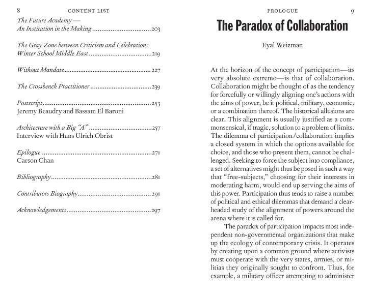 Welcome to Harmonistan! Over the last decade, the term “participation” has become increasingly overused. When everyone has been turned into a participant, the often uncritical, innocent, and romantic use of the term has become frightening. Supported by a repeatedly nostalgic veneer of worthiness, phony solidarity, and political correctness, participation has become the default of politicians withdrawing from responsibility. Similar to the notion of an independent politician dissociated from a specific party, this third part of Miessen’s “Participation” trilogy encourages the role of what he calls the “crossbench practitioner,” an “uninterested outsider” and “uncalled participator” who is not limited by existing protocols, and who enters the arena with nothing but creative intellect and the will to generate change.