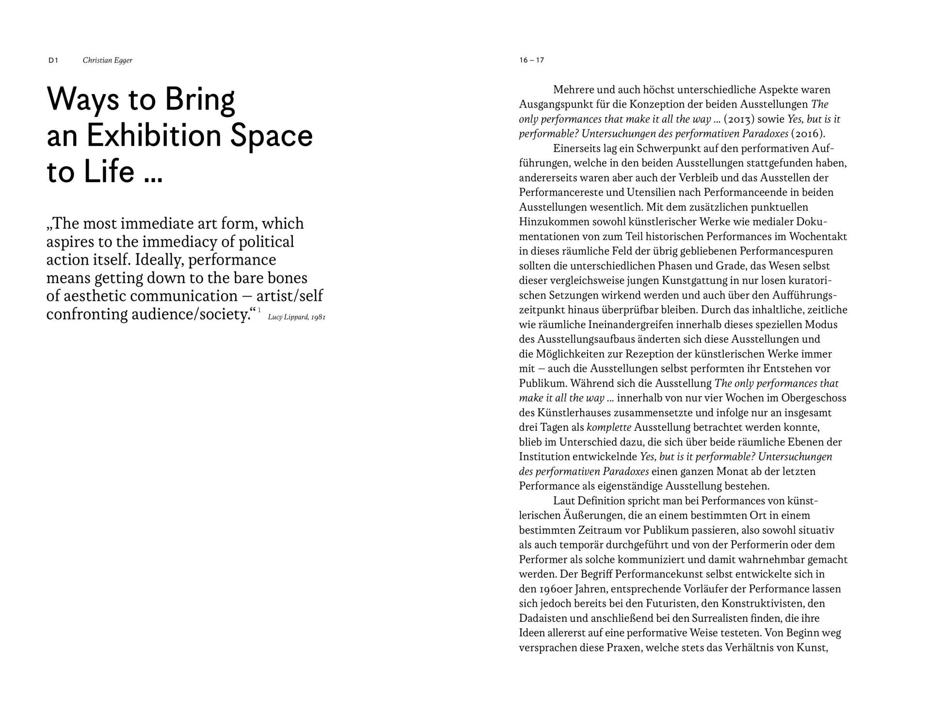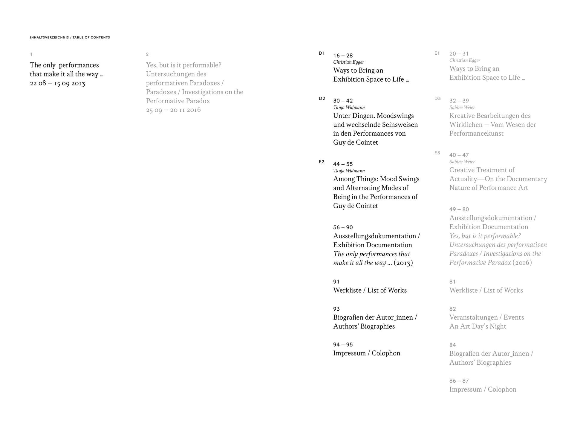 This catalogue is published on the occasion of the two group exhibitions “The only performances that make it all the way...” and “Yes, but is it performable? Investigations on the Performative Paradox” which were shown at Künstlerhaus, Halle für Kunst & Medien in 2013 and 2016.