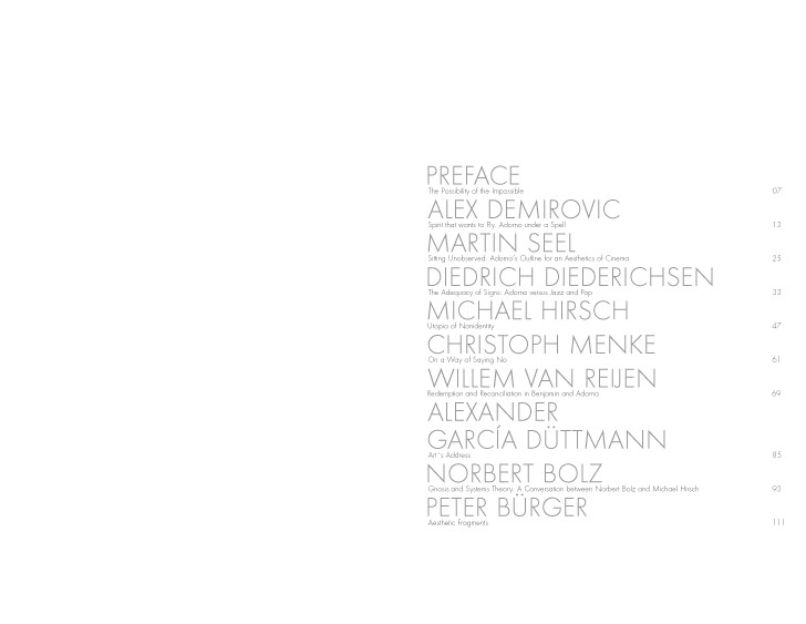The first volume of Adorno: The Possibility of the Impossible comprises theoretical essays which investigate the relevance of Adorno’s critical theory for the present. The tight connection between individual observations in aesthetics and cultural criticism, on the one hand, and the large speculations of social theory and the history of philosophy, on the other, that is found in Adorno’s own work is taken as a point of departure in many passages. The difference – disparity, even – in the varied attitudes toward the content of Adorno’s theory is evident. Seen from the perspective of the present, this multiple rereading is directed at fragments of a thought that has preserved its radicality even when abstracted from its immediate historical context. Both publications – Adorno: The Impossibility of the Impossible Vol. I and Vol. II – accompany an exhibition at the Frankfurter Kunstverein on the occasion of the 100th birthday of Theodor W. Adorno.