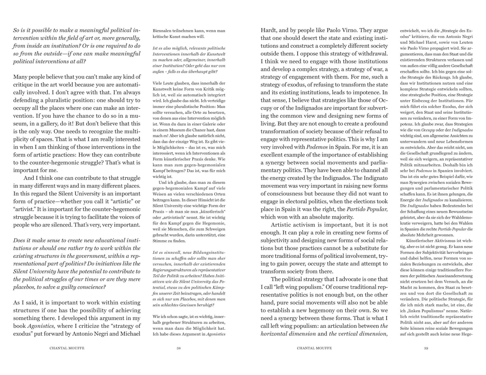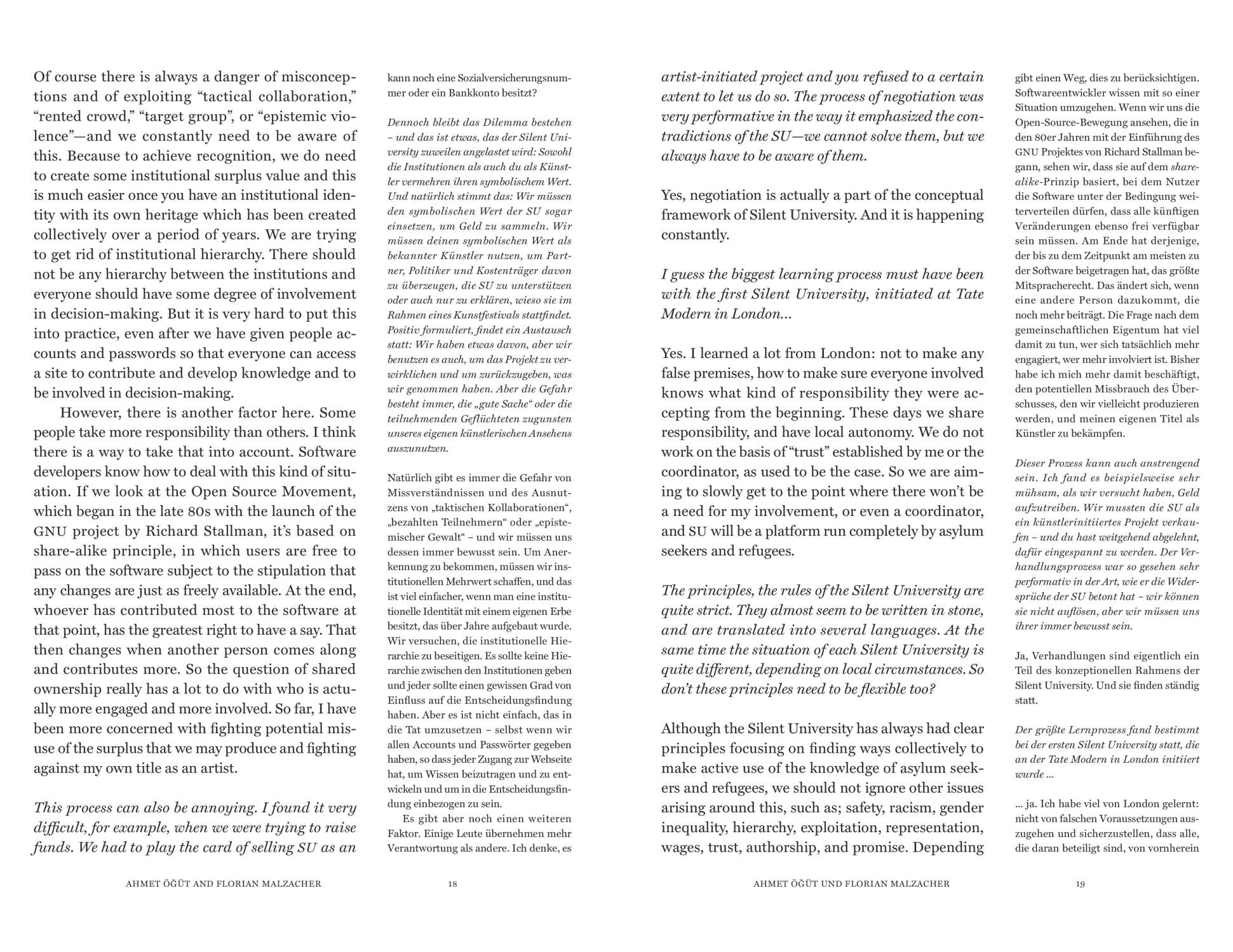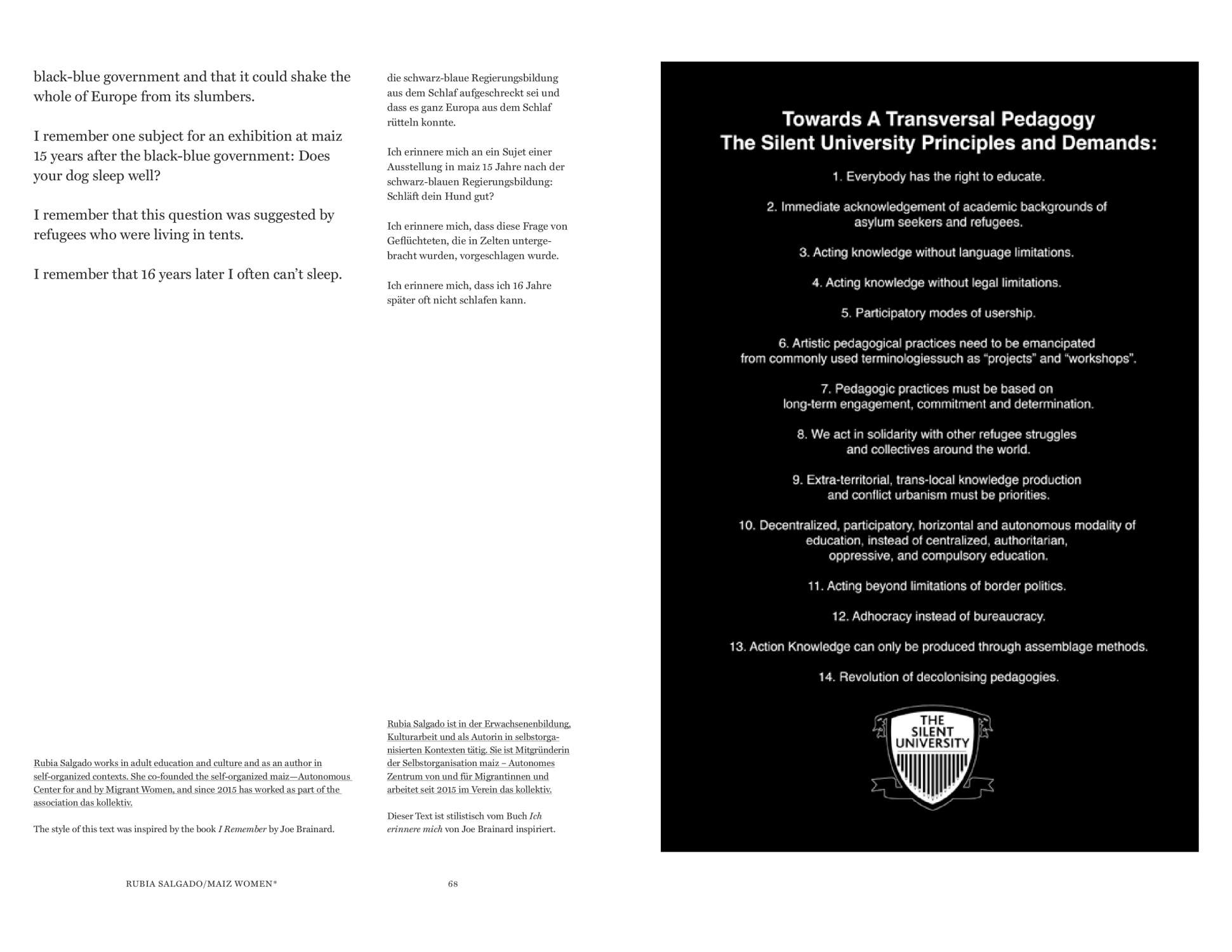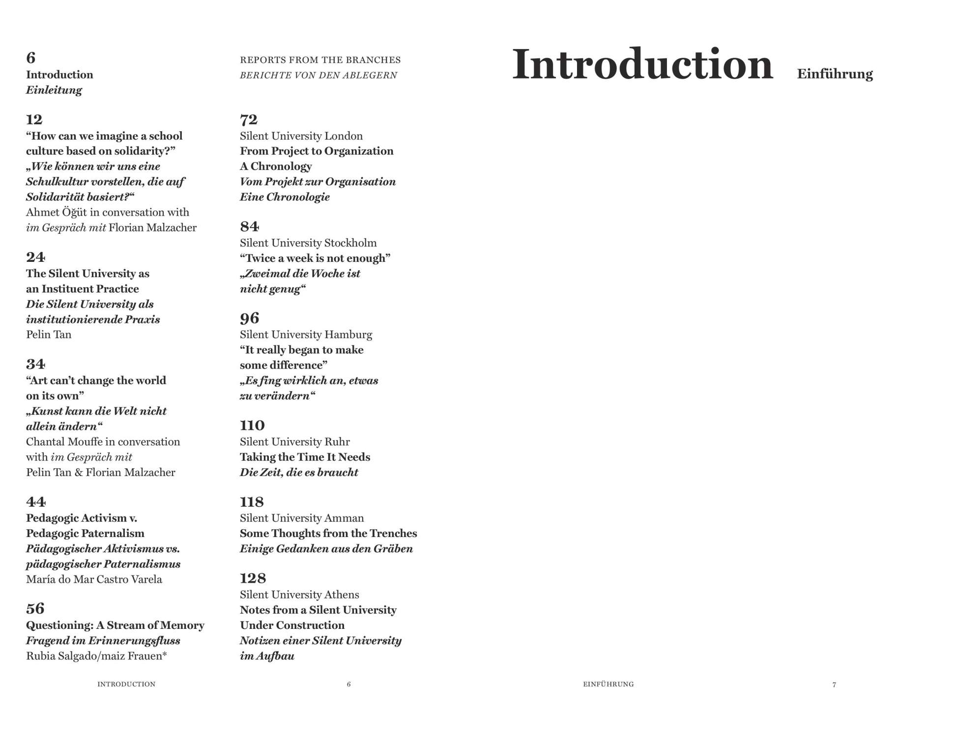 The book contextualizes this initiative within a broader picture of migration policies, critical pedagogy, artistic involvement and institutional engagement. It also hopes to be an introduction for all those who might want to get involved in the Silent University—as contributors, lecturers, students in the existing branches, or by initiating new SUs wherever they are needed: a need which is becoming urgent in more and more cities and countries all around the world.