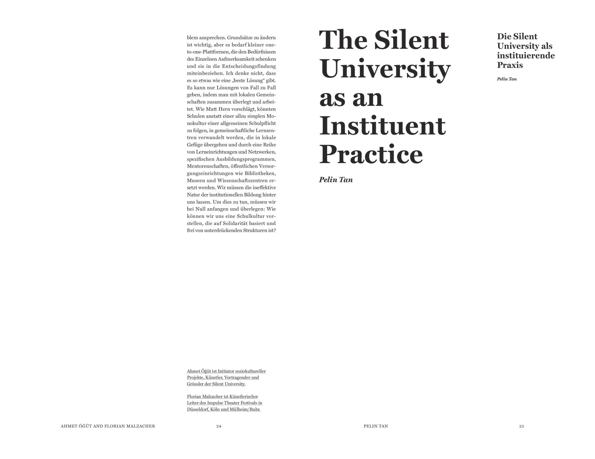 The Silent University, initiated by artist Ahmet Öğüt in 2012, is an autonomous platform for academics who cannot share their knowledge due to their status of residence, because their degrees are not recognized or regaining access to academia is blocked for other reasons. It is a solidary school by refugees, asylum seekers and migrants who contribute to the program as lecturers, consultants and researchers.