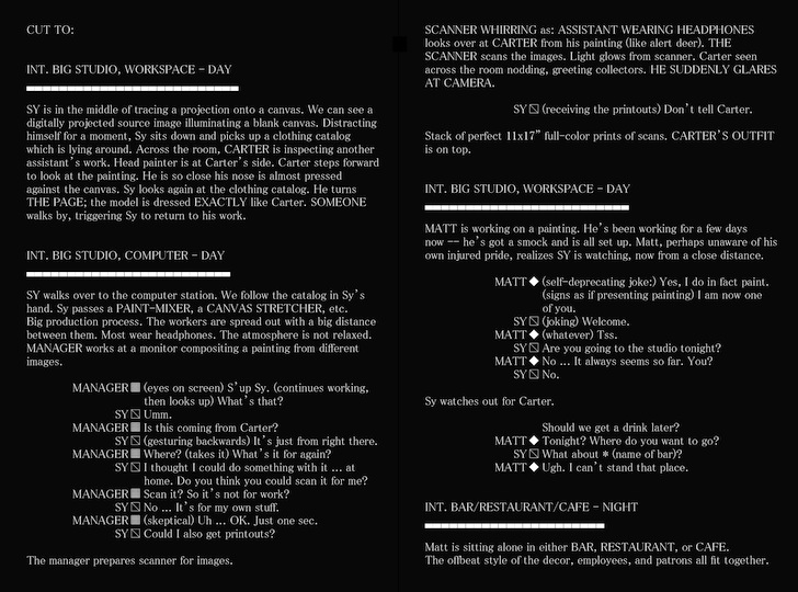 A great number of artists made contributions that vary widely in form and scale: from acting, screenwriting, directing, and cinematography, to providing artworks as props or material for the script. The screenplay is based on interviews with artists, curators, gallerists, collectors, and art advisors, and their opinions, anecdotes, and gossip.