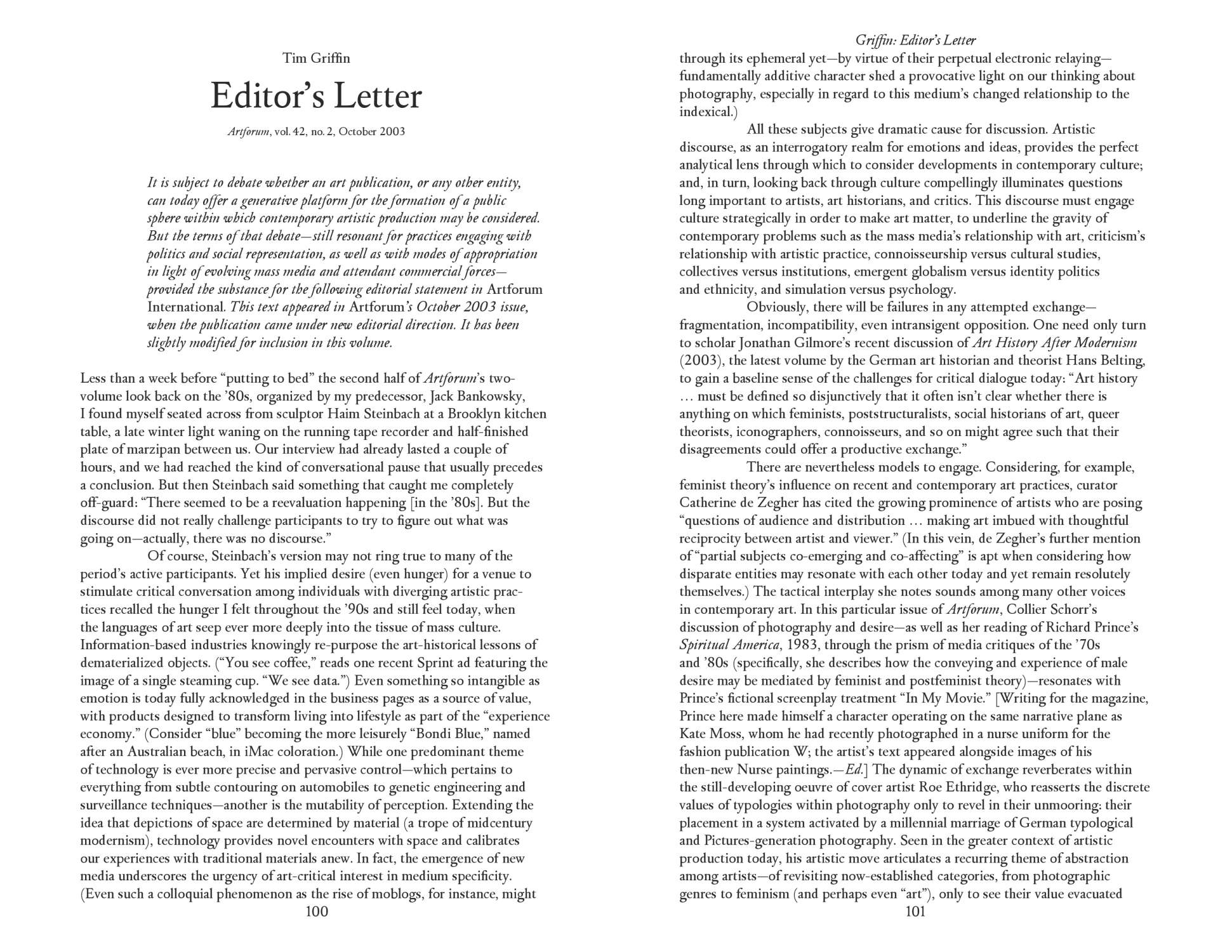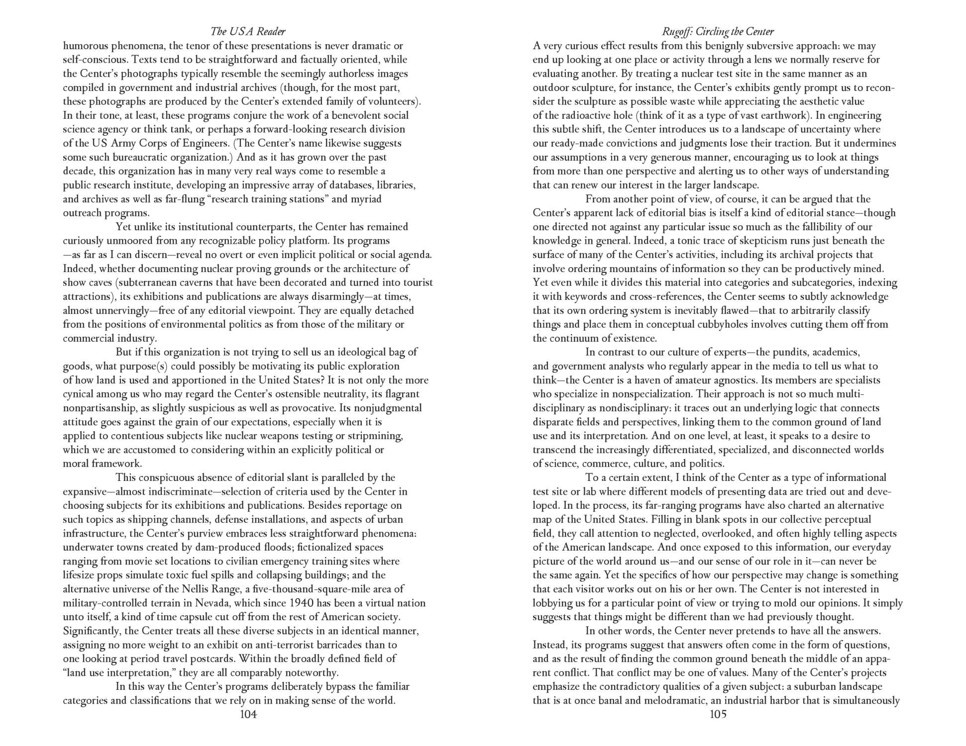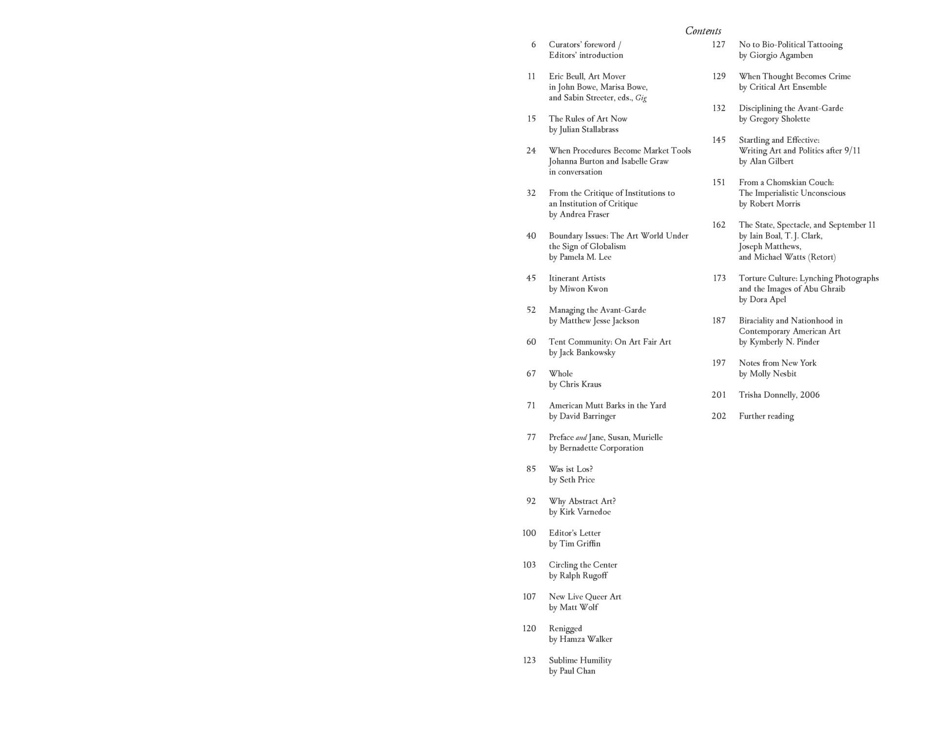 “This is undoubtedly a moment marked by a serious interest in the actions America is taking on the world stage—actions that have been described as a cause for ‘grave concern.’ We do not attempt to authoritatively engage these concerns here nor do we wish to insinuate that elevated interest in America’s cultural affairs is somehow unique to our present historical moment. We do, however, think that this sampling of discourse by and about a country’s visual artists leads to insights about its politics and society not gained elsewhere. […] At the very least, it gives a sense of what it is like to live in the United States today, and results in some inspired debate. We hope that this book serves not only as a valuable compendium of recent writing about contemporary art, but also as inspiration to seek further understanding of these ‘Uncertain States.’”