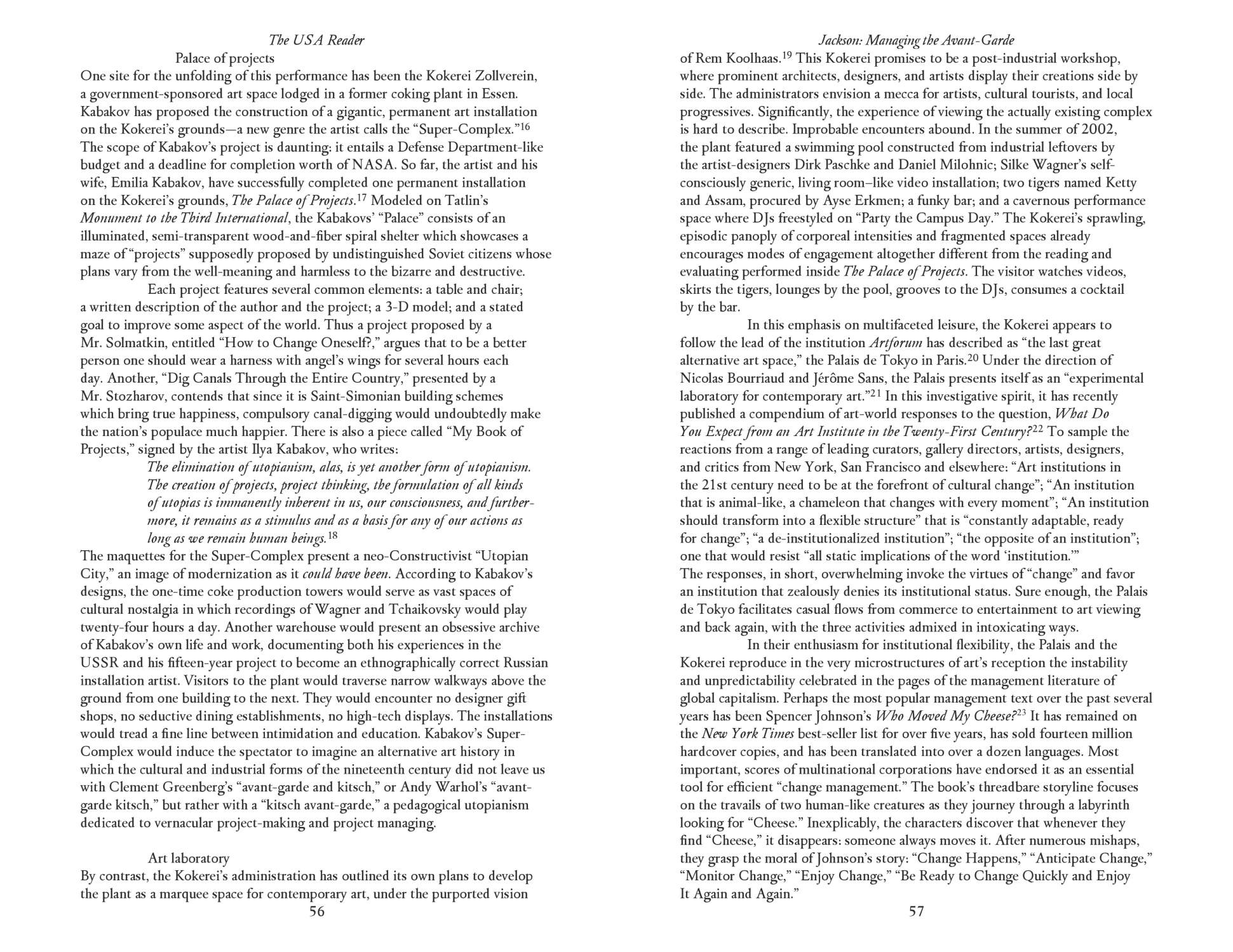 So Noah Horowitz and Brian Sholis note in the introduction to this unique compilation of writing around art and cultural politics in America since 2000. Published in collaboration with the Serpentine Gallery, London, and the Astrup Fearnley Museum of Modern Art, Oslo, as an addendum to the traveling exhibition Uncertain States of America, curated by Daniel Birnbaum, Gunnar Kvaran, and Hans Ulrich Obrist, the USA Reader was designed by Dexter Sinister. It is a thought-provoking collection that will become an important sourcebook on American culture at the start of the new millennium.