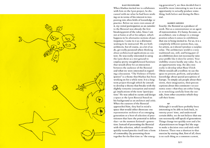 This book, edited by London-based architect and author Markus Miessen, marks an extension of the discursive space he has produced as contribution to the 2007 Lyon Biennial. He has pulled together a heterogeneous group of interlocutors to lead conversations on alternative notions of participation, the inconsistence between democratic concepts, and what it means to live in Europe today.