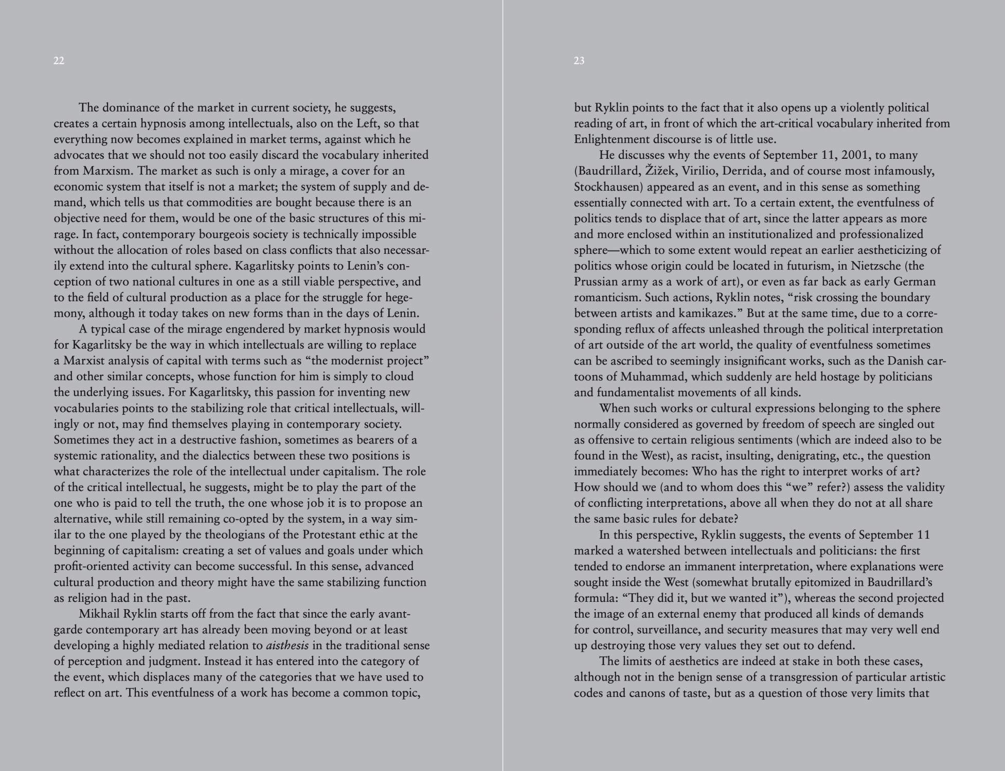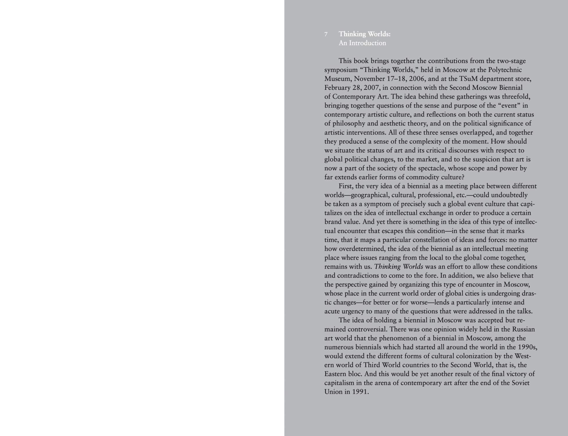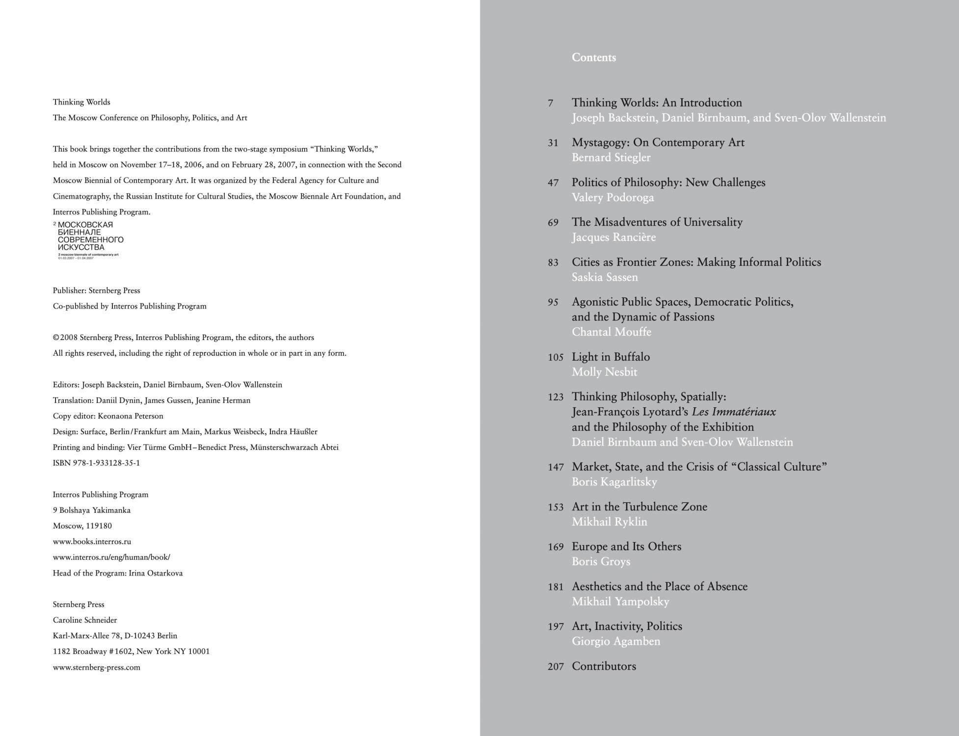 Thinking Worlds brings together contributions from a two-stage symposium organized in connection with the 2nd Moscow Biennale of Contemporary Art. These essays address questions of the sense and purpose of the “event” in contemporary artistic culture, of the current status of philosophy and aesthetic theory, and of the political significance of artistic interventions. How should we situate the status of art and its critical discourses with respect to global political changes, to the market, and to the suspicion that art is now a part of the society of the spectacle, whose scope and power by far extends earlier forms of commodity culture?