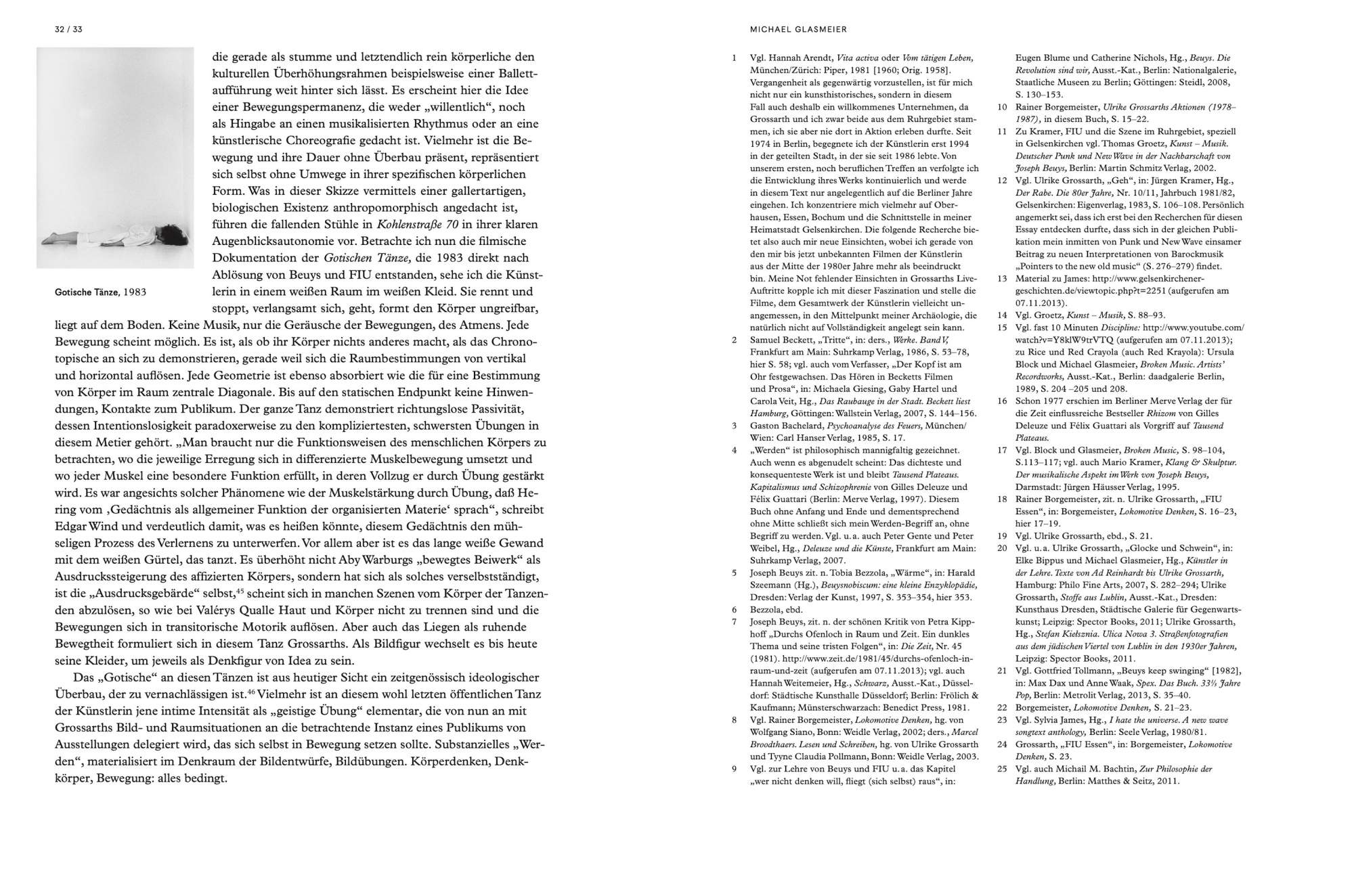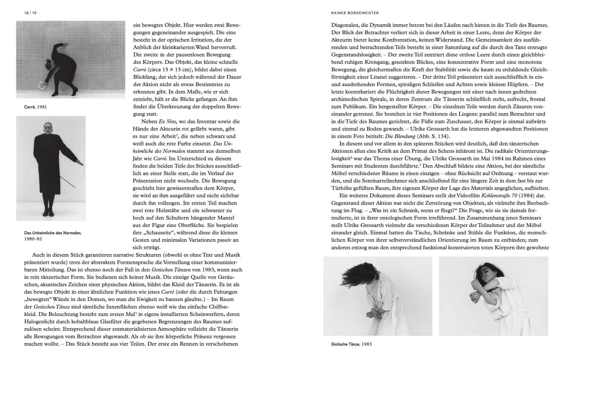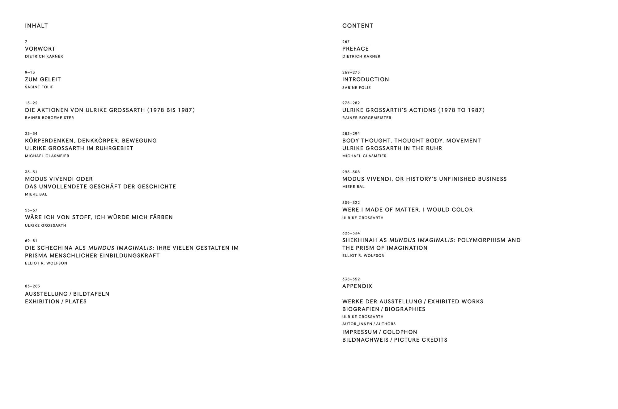 In her contributing essay, Ulrike Gossarth states that the title—Were I Made of Matter, I Would Color—is a counter-model to the fundamental Descartian formula “I think therefore I am,” a position which exists between consciousness and disembodiment, in a state of incompleteness. Rainer Borgemeister discusses the artist’s actions from 1978 to 1987, which were preceded by her critical engagement with modern dance. Further contributions from Mieke Bal, Michael Glasmeier, and Elliot R. Wolfson discuss Grossarth’s practice in relation to history, the body, and polymorphism.