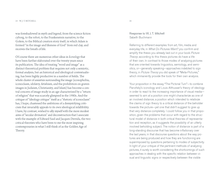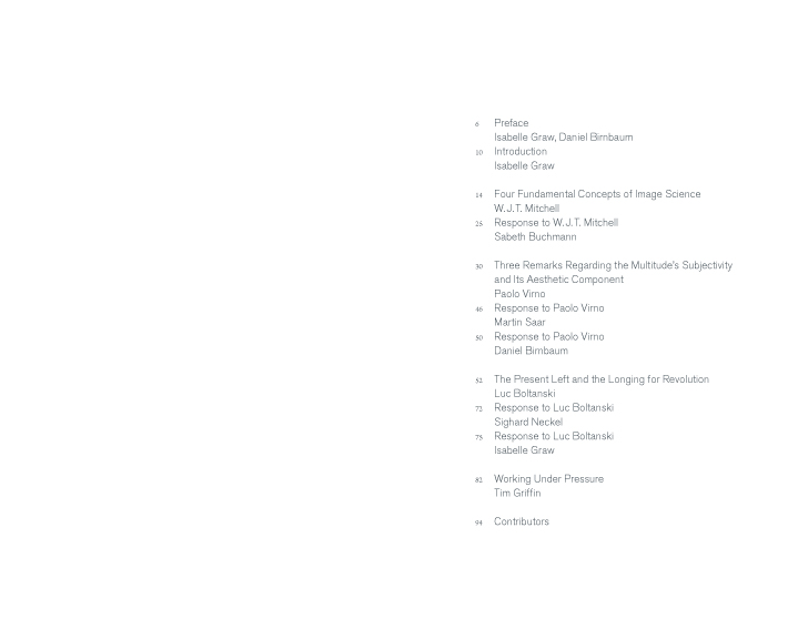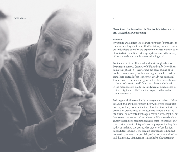 Can “exit” and “disobedience,” as envisioned by Virno, be considered as options from an artistic point of view? And what would an insistence on “status” or long-term projects as invoked by Boltanski/Chiapello look like if artists were to take on this strategy? How much can one count on pictures alone, as Mitchell seems to do—and, can pictures really change the “ways of worldmaking”?