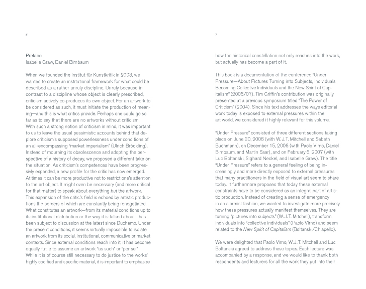 Starting from the premise that cultural producers are currently more exposed to external pressures, the conferences proposed that today these external constraints have to be considered as an integral part of artistic production. The aim was to discuss the value system resulting from the “New Spirit of Capitalism” and to confront theoretical models with ad-hoc conditions of production.