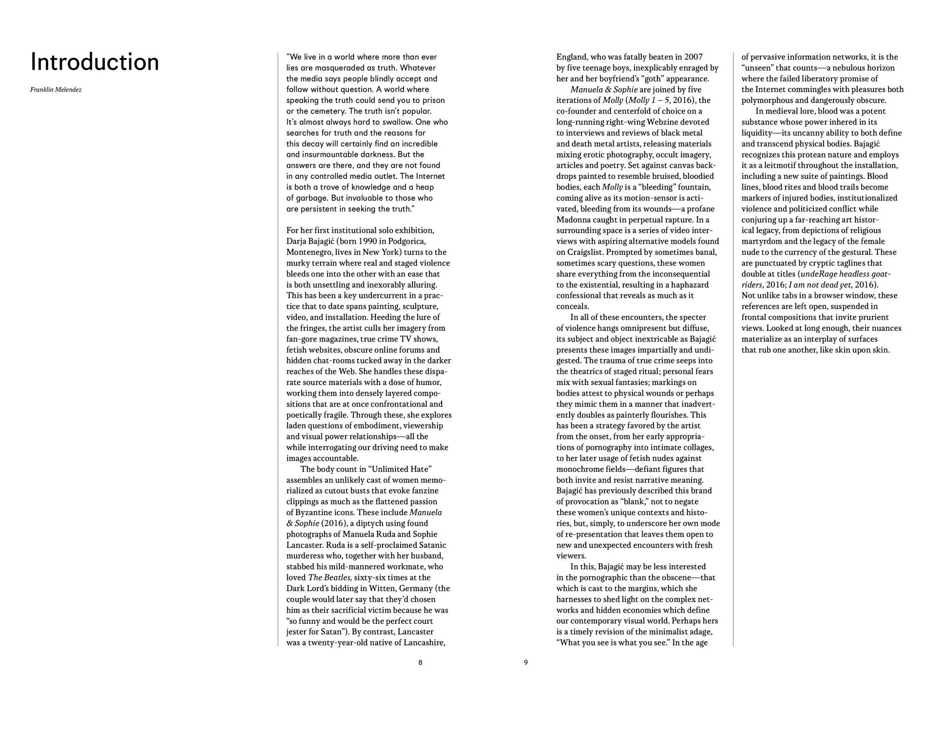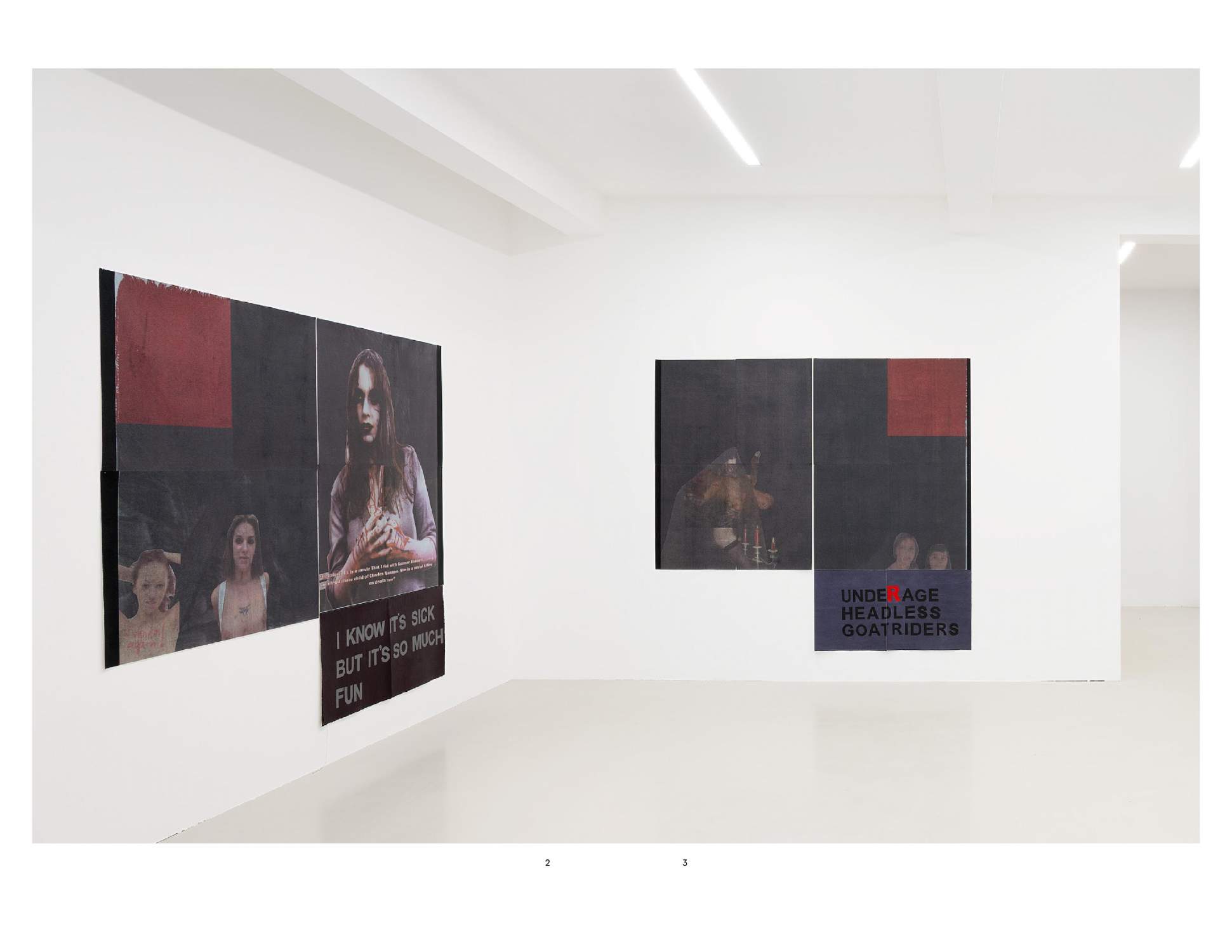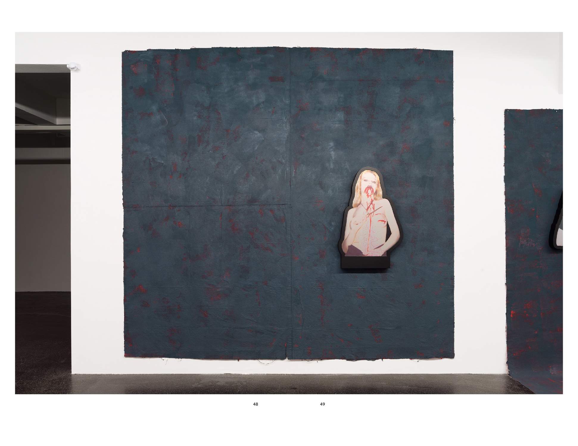 For her first institutional solo Darja Bajagić turns to the murky terrain where real and staged violence bleed into each other with an ease both unsettling and alluring. This has been a key undercurrent to a practice that spans painting, sculpture, video, and installation. Following the lure of the fringes, the artist culls her imagery from fan-gore magazines, true-crime TV shows, fetish websites, obscure online forums, and hidden chat rooms tucked away in the darker reaches of the Web. She handles these disparate source materials with a dose of humor, working them into densely layered compositions that are at once confrontational and poetically fragile. Bajagić explores loaded questions of embodiment, viewership, and power relations, all the while interrogating our need to hold images accountable.