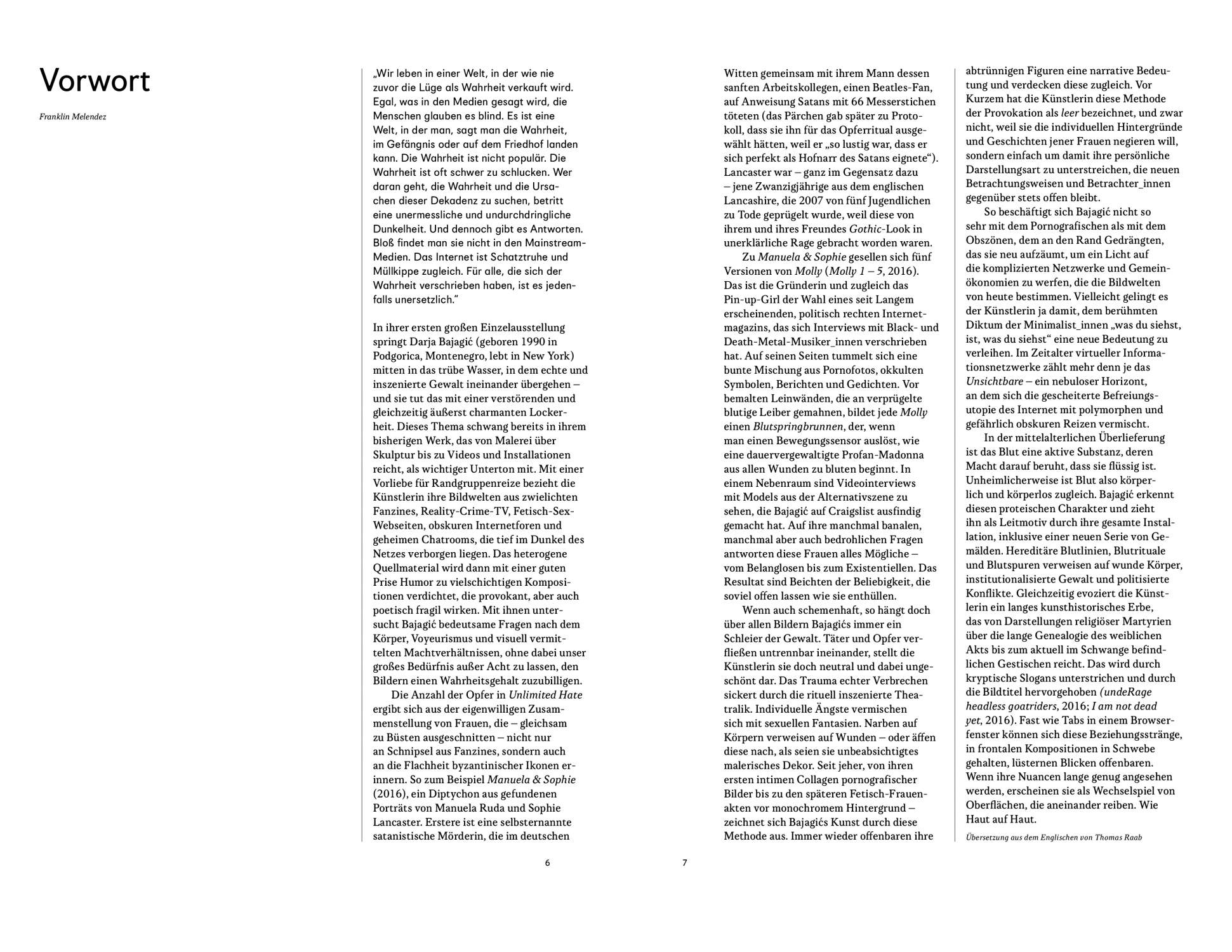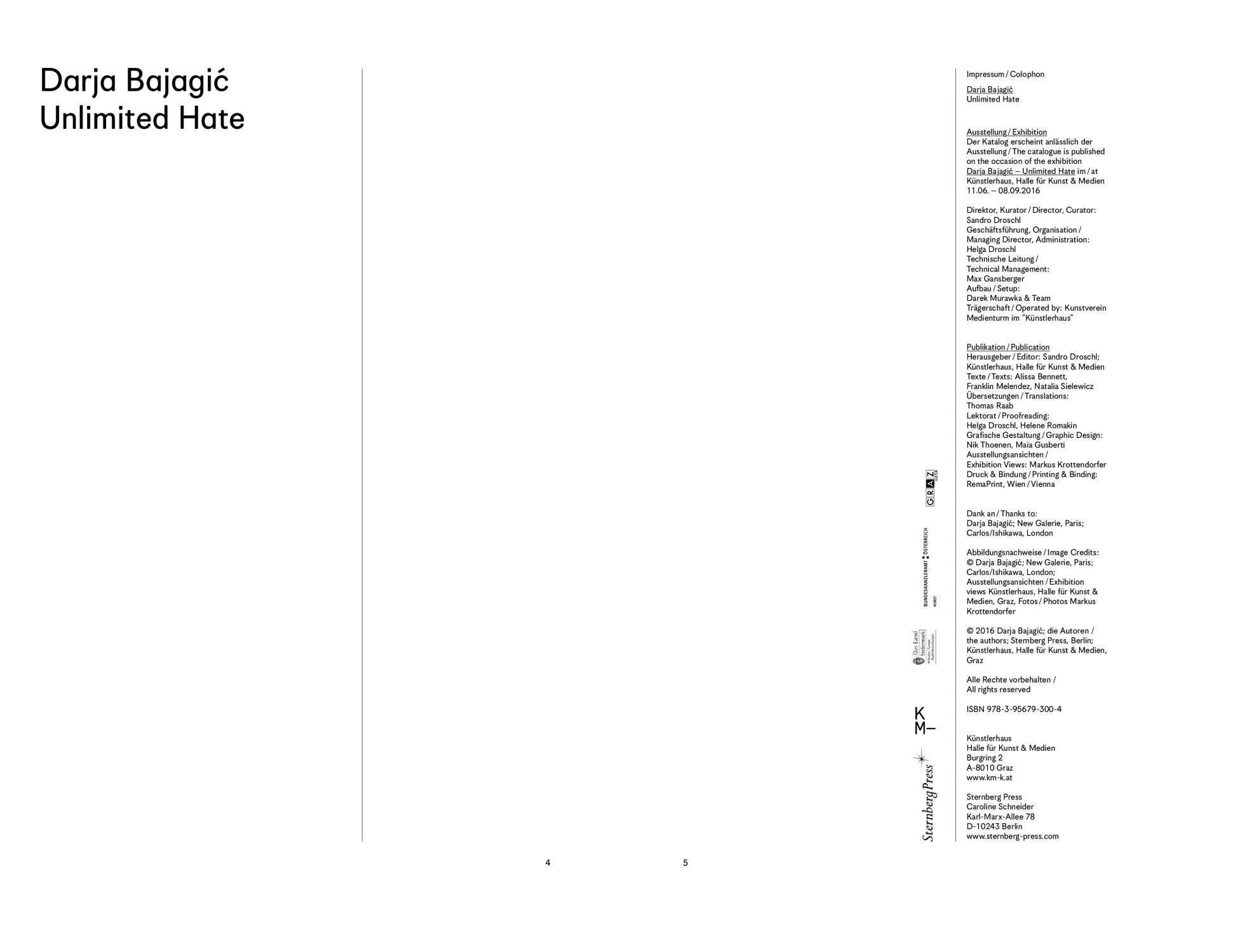 The catalogue is published on the occasion of the artist’s first institutional exhibition, “Unlimited Hate,” which was shown at Künstlerhaus, Halle für Kunst & Medien in the summer of 2016.