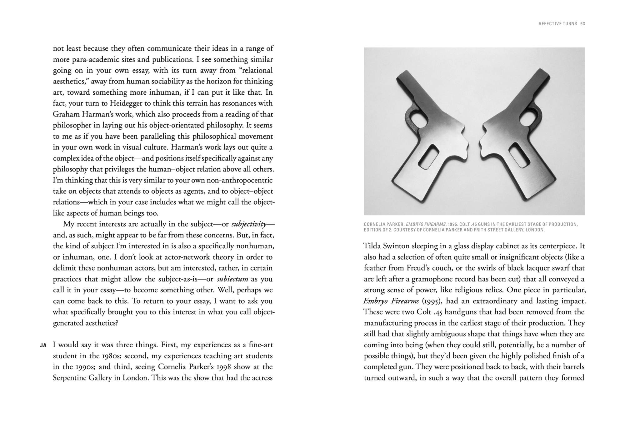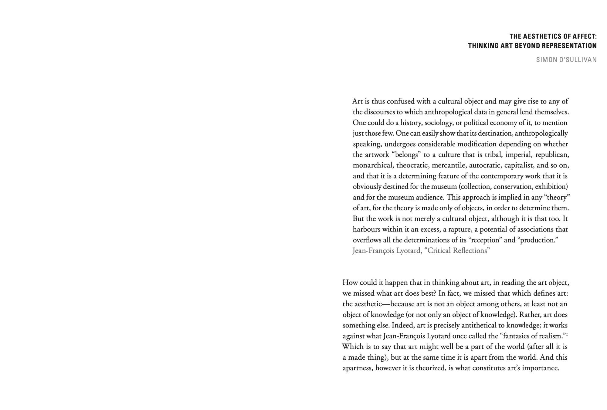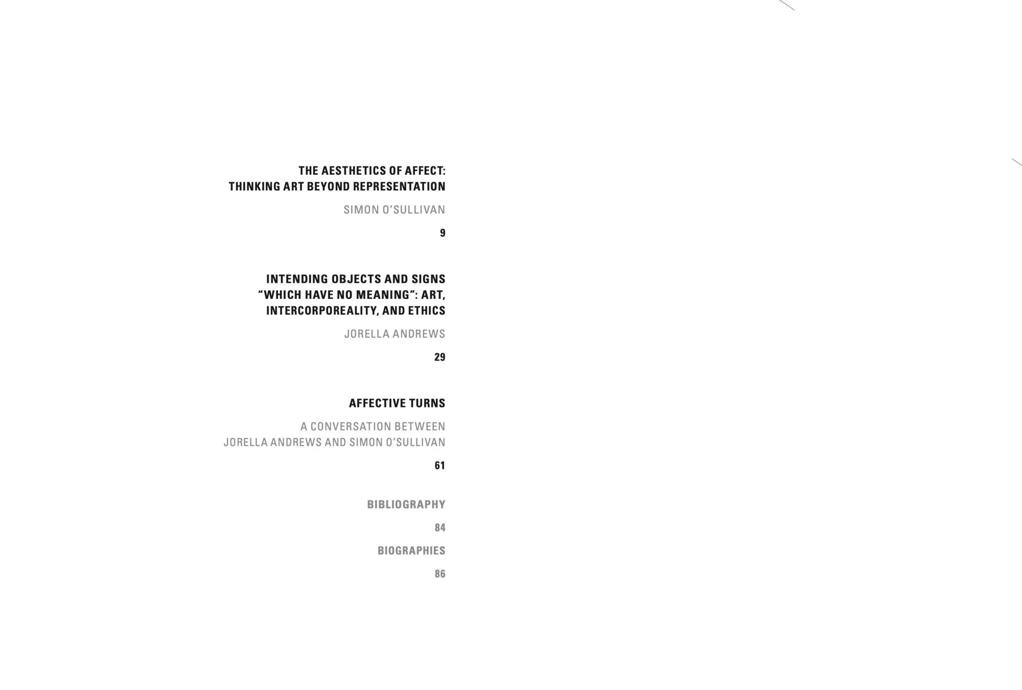 Within this quest to consider art differently, Jorella Andrews and Simon O’Sullivan pay attention to the asignifying character of art, or simply its affective qualities. Drawing on the work of key thinkers (for O’Sullivan, the writings of Gilles Deleuze, Félix Guattari, and Jean-François Lyotard) and turning to paradigmatic works of art (for Andrews, film and video pieces by Rosalind Nashashibi and Jayne Parker), they contextualize these art-related matters in relation to a significant recent rise in new thinking about objects, objectness, and objectivity within philosophy, critical theory, and ethics.
