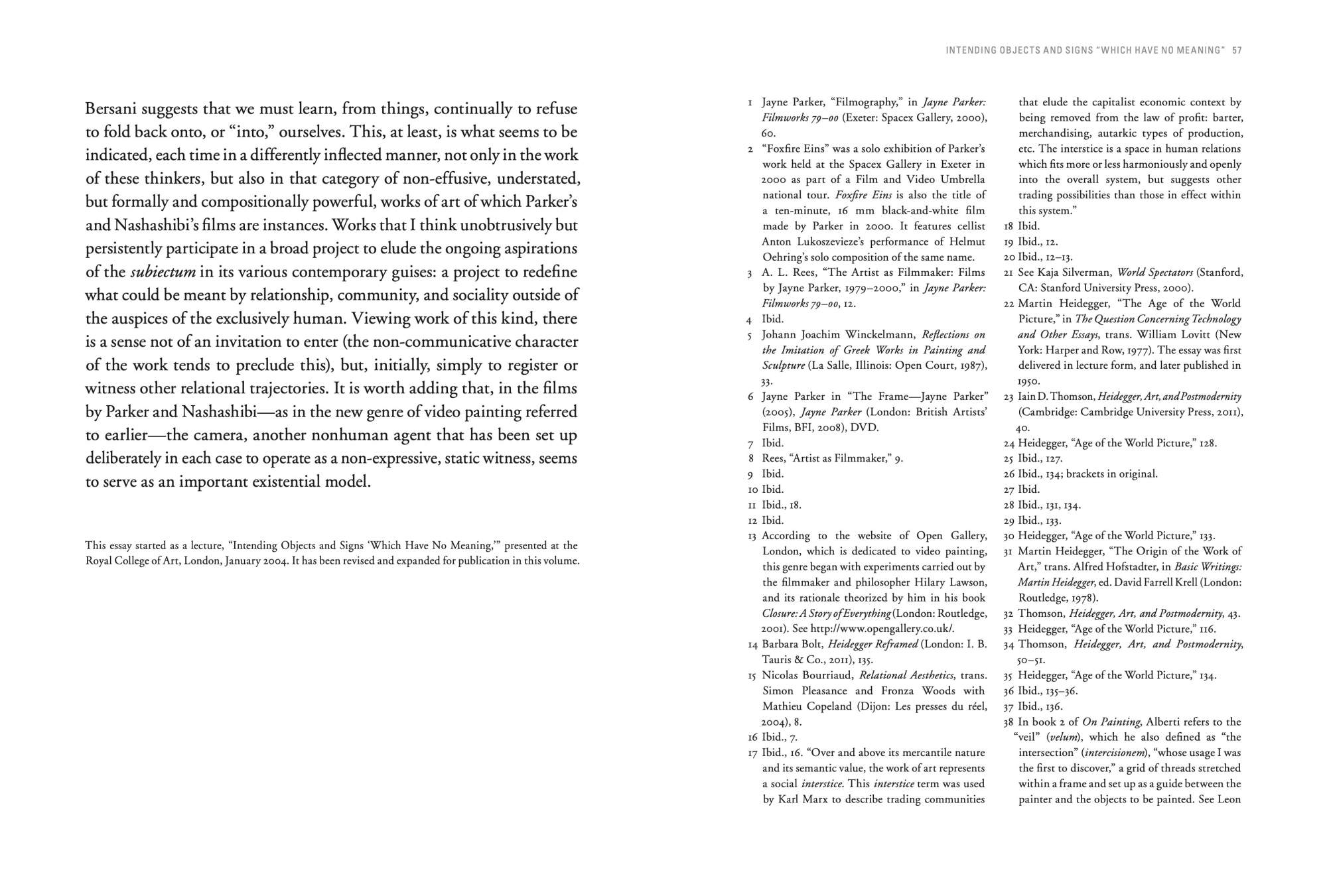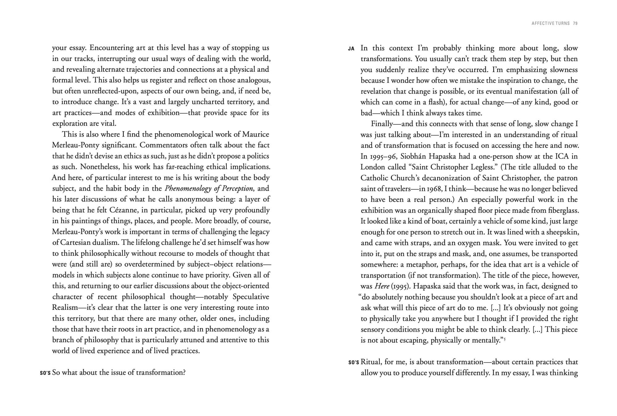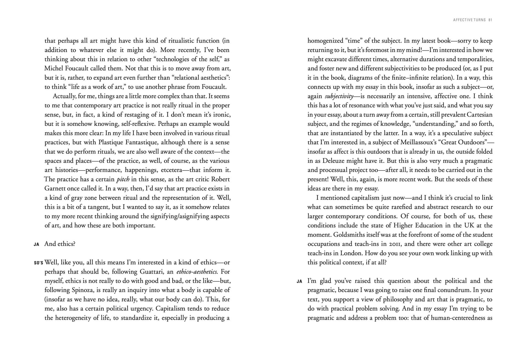 Within this quest to consider art differently, Jorella Andrews and Simon O’Sullivan pay attention to the asignifying character of art, or simply its affective qualities. Drawing on the work of key thinkers (for O’Sullivan, the writings of Gilles Deleuze, Félix Guattari, and Jean-François Lyotard) and turning to paradigmatic works of art (for Andrews, film and video pieces by Rosalind Nashashibi and Jayne Parker), they contextualize these art-related matters in relation to a significant recent rise in new thinking about objects, objectness, and objectivity within philosophy, critical theory, and ethics.