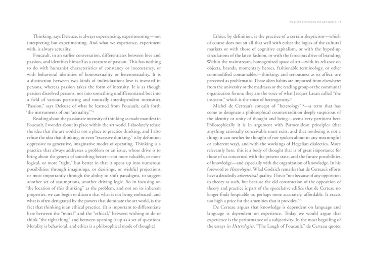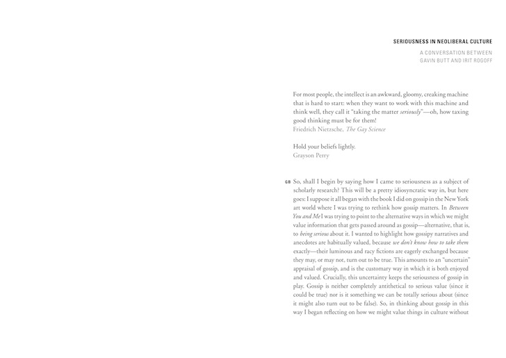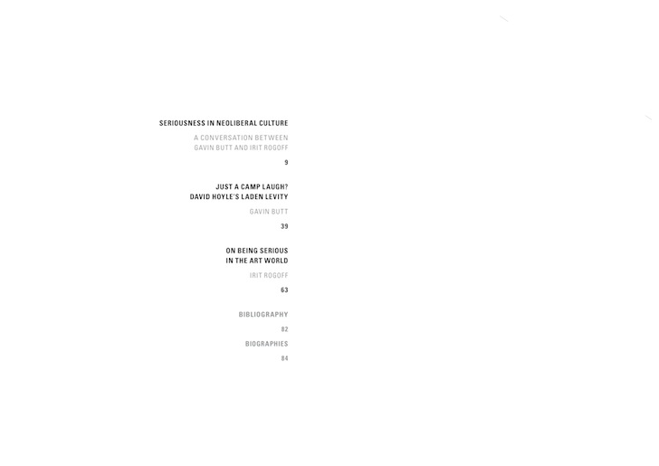 The contemporary art world has become more inhospitable to “serious” intellectual activity in recent years. Critical discourse has been increasingly instrumentalized in the service of neoliberal art markets and institutions, and artists are pressurized by the demands of popularity and funding bodies. Set against this context, Gavin Butt and Irit Rogoff raise the question of “seriousness” in art and culture. What is seriousness exactly, and where does it reside? Is it a desirable value in contemporary culture? Or is it bound up with elite class and institutional cultures? Butt and Rogoff reflect on such questions through historical and theoretical lenses, and explore whether or not it might be possible to pursue knowledge and value in contemporary culture without recourse to high-brow gravitas. Can certain art forms—such as performance art—suggest ways in which we might be intelligent without being serious? And can one be serious in the art world without returning to established assumptions about the high-mindedness of the public intellectual?