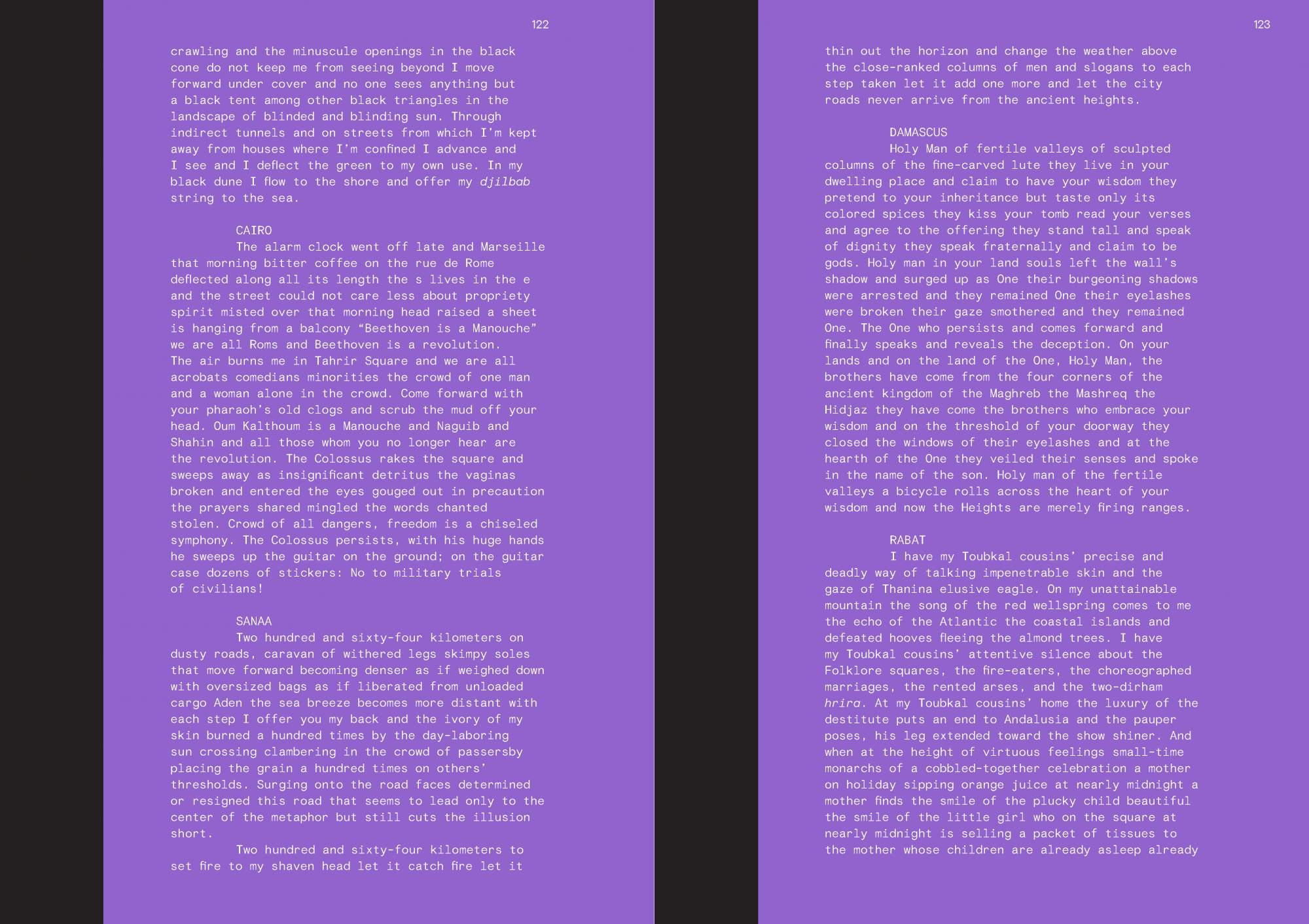 This publication includes the first English translations of texts by key theorists of contemporary art in Algeria on the evolving relationship between art and politics, as well as poetry by Samira Negrouche and a graphic essay by Nawel Louerrad. The book’s title comes from an essay by Wassyla Tamzali on Merzak Allouache’s 1977 film Omar Gatlato.
