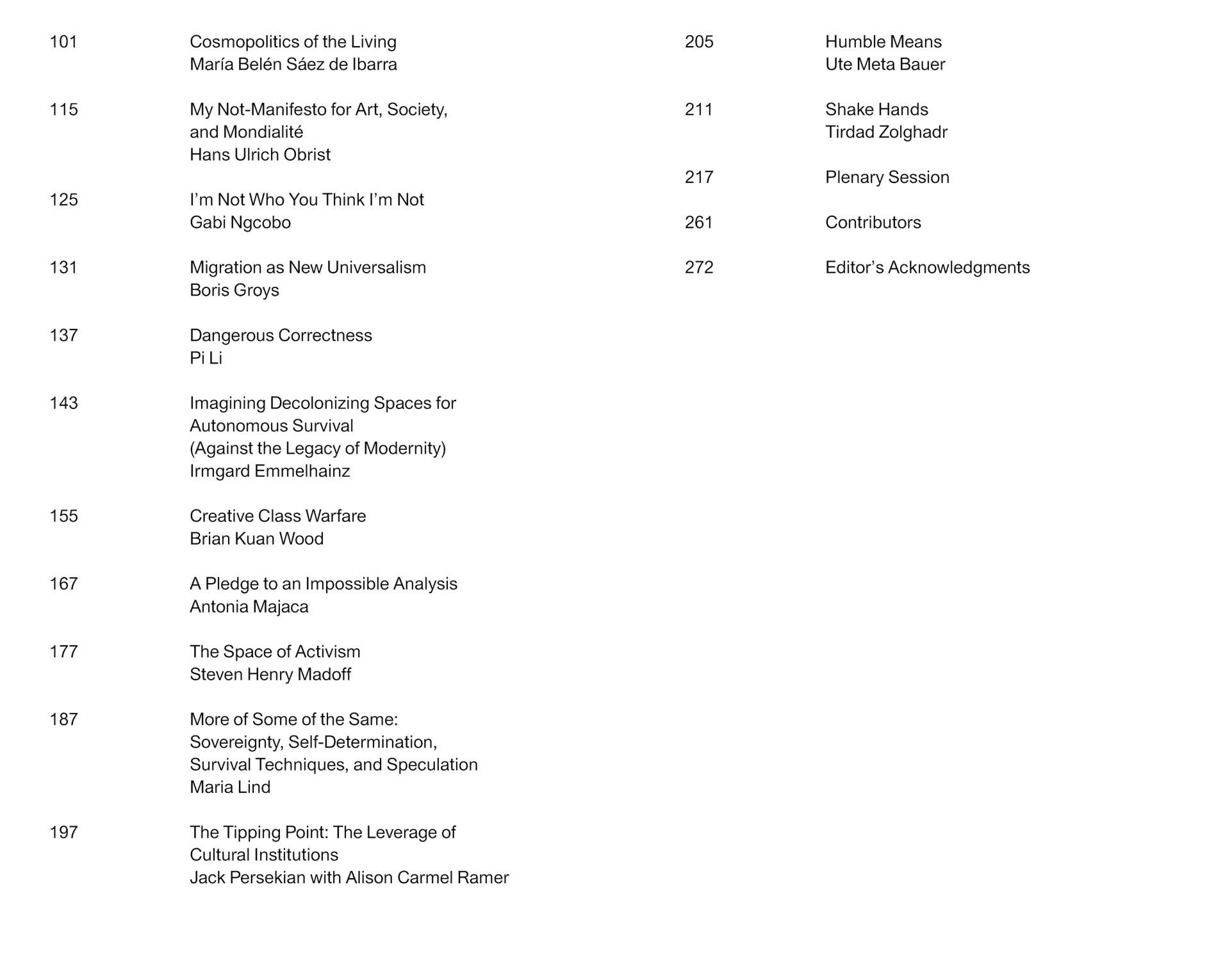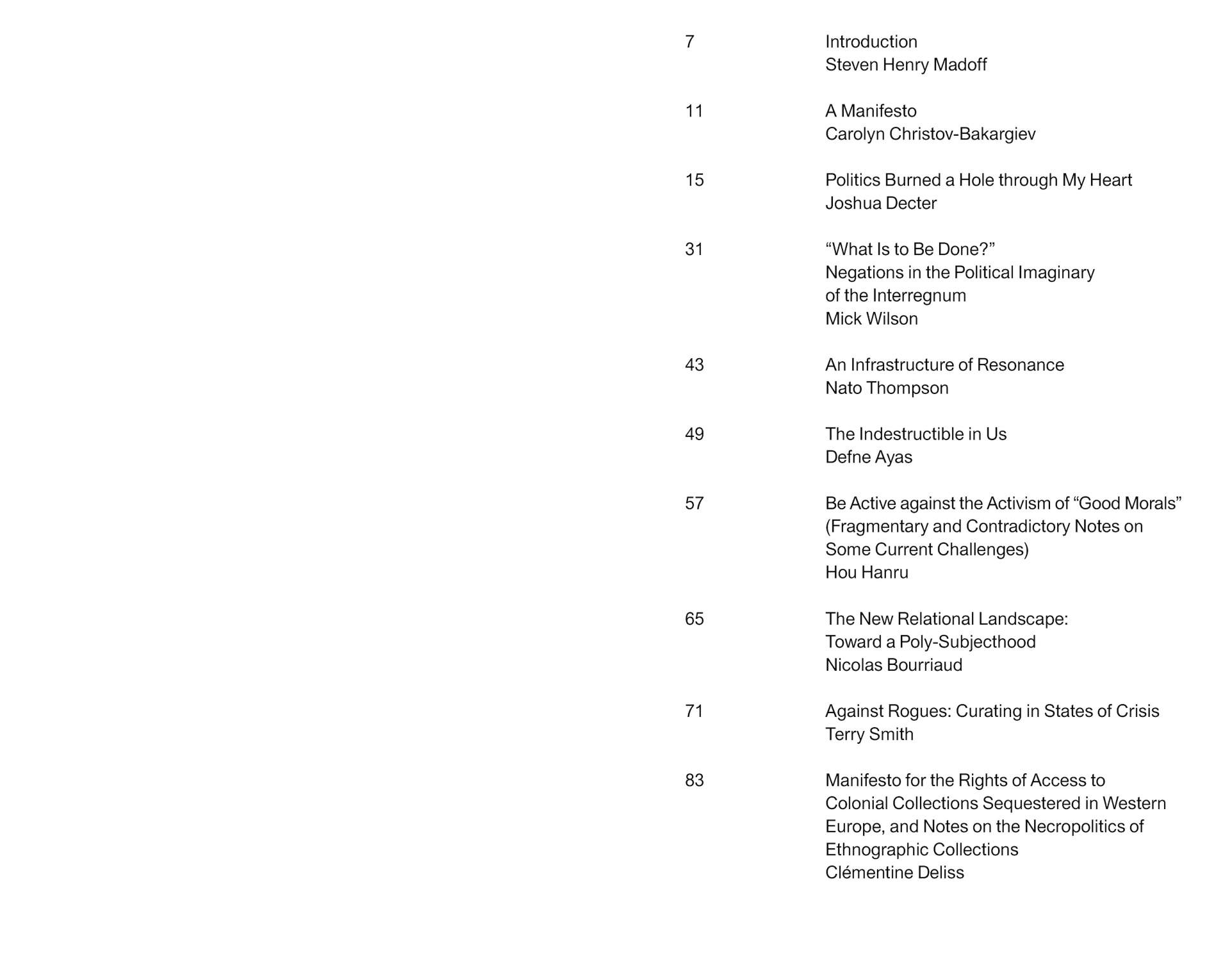 With the global rise of a politics of shock driven by authoritarian regimes that subvert the rule of law and civil liberties, what paths to resistance, sanctuary, and change can cultural institutions offer? What about activism in curatorial practice? In this book, more than twenty leading curators and thinkers about contemporary art present powerful case studies, historical analyses, and theoretical perspectives that address the dynamics of activism, protest, and advocacy. What unfolds in these pages is a vast range of ideas—a tool kit for cultural producers everywhere to engage audiences and face the fierce political challenges of today and tomorrow.