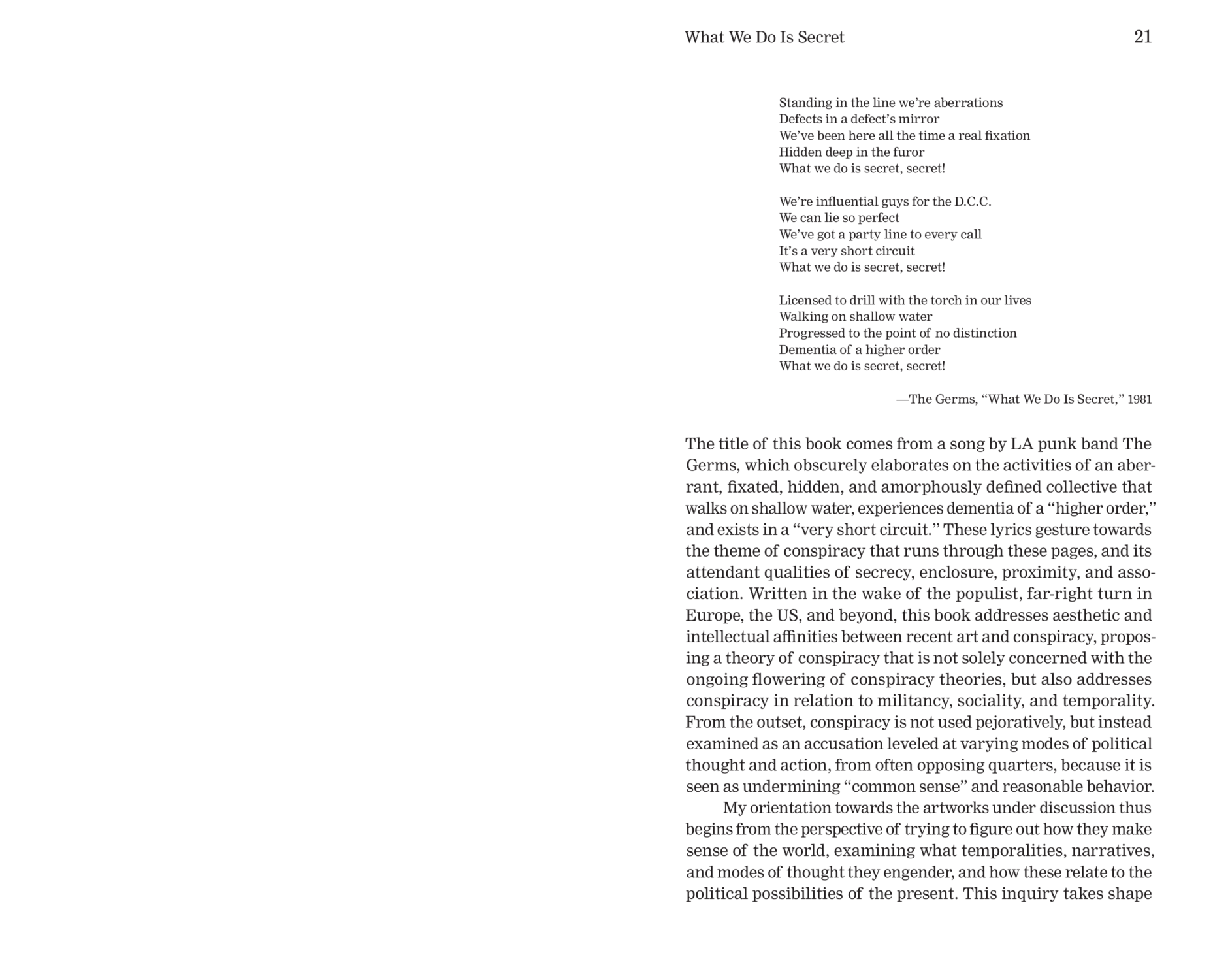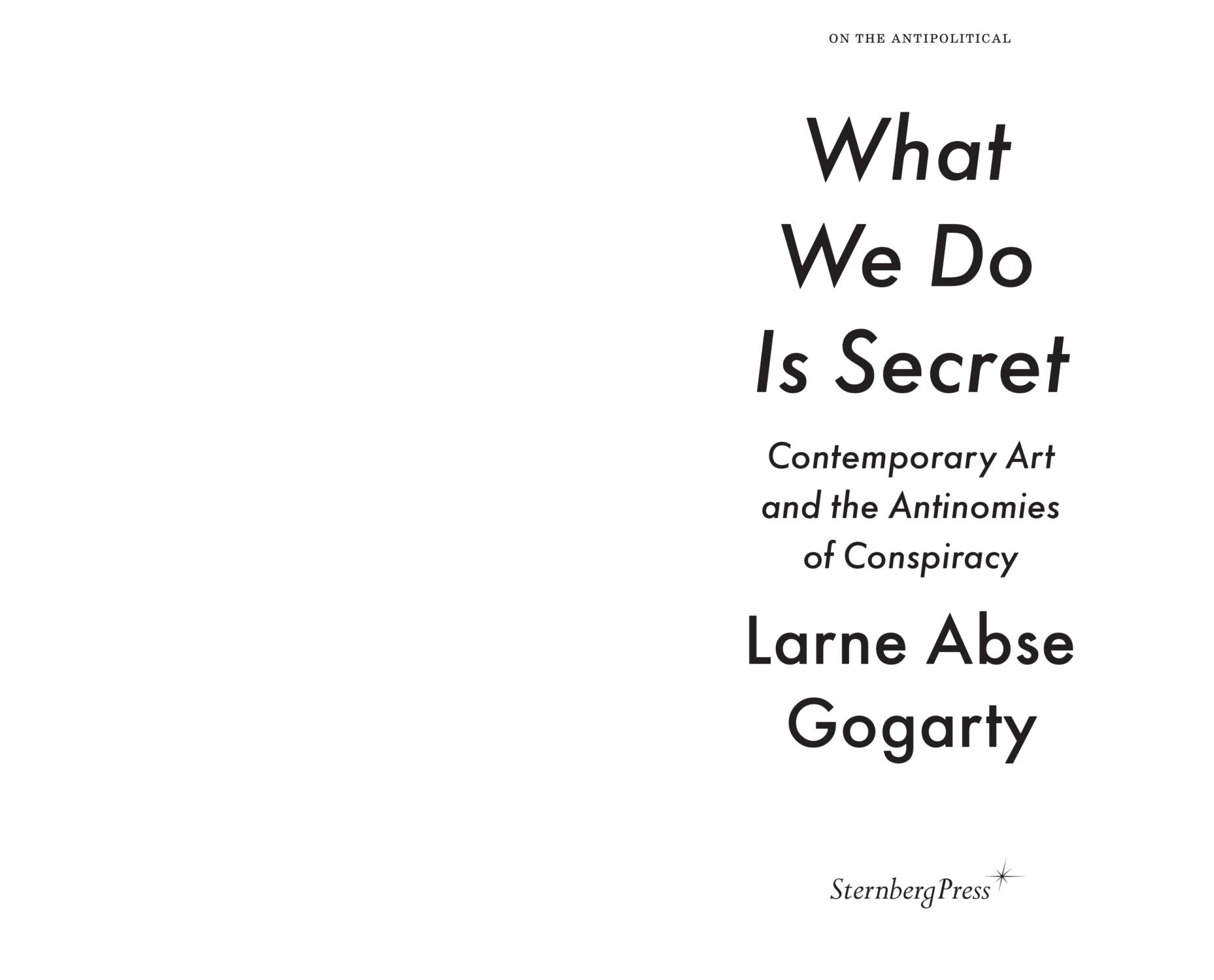 Written in the wake of the far-right populist turn in Europe, the US, and beyond, What We Do Is Secret addresses aesthetic and intellectual affinities between recent art and conspiracy, proposing a theory of conspiracy that is not primarily concerned with conspiracy theory. This inquiry takes shape across chapters on the politics of post-internet art aesthetics; the sublime and possessive individualism in recent “critical” art; Cady Noland’s security fences, and silkscreens of the Symbionese Liberation Army; and mutuality, secrecy, and improvisation in the work of Ima-Abasi Okon. Larne Abse Gogarty discusses the relationship between culture and contemporary politics, following on from David Lloyd’s proposition that through its compensatory qualities, the aesthetic sphere naturalizes forms of life lived under the rule of property. What kind of art can work against this? Can art exist as a conspiracy capable of corroding that rule?