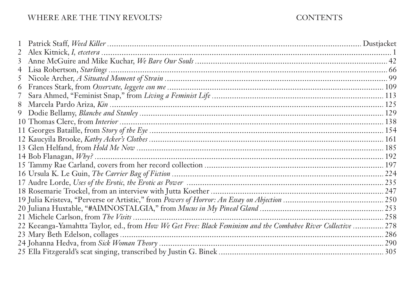Driven by the central question “What are we learning from artists today?” the first volume of the new series edited by Anthony Huberman and Jeanne Gerrity at the CCA Wattis, A Series of Open Questions, is informed by themes found in the work of Dodie Bellamy, such as contemporary forms of feminism and sexuality, the rebirth of the author, and ways in which vulnerability, perversion, vulgarity, and self-exposure can be forms of empowerment. Where are the tiny revolts? comprises a broad array of contributions, including memoir, theoretical essay, art-historical analysis, poetry, and fiction, as well as diverse visual elements, ranging from photographs by Anne McGuire and Mike Kuchar, among others, collages by Mary Beth Edelson, and drawings by Rosemarie Trockel.