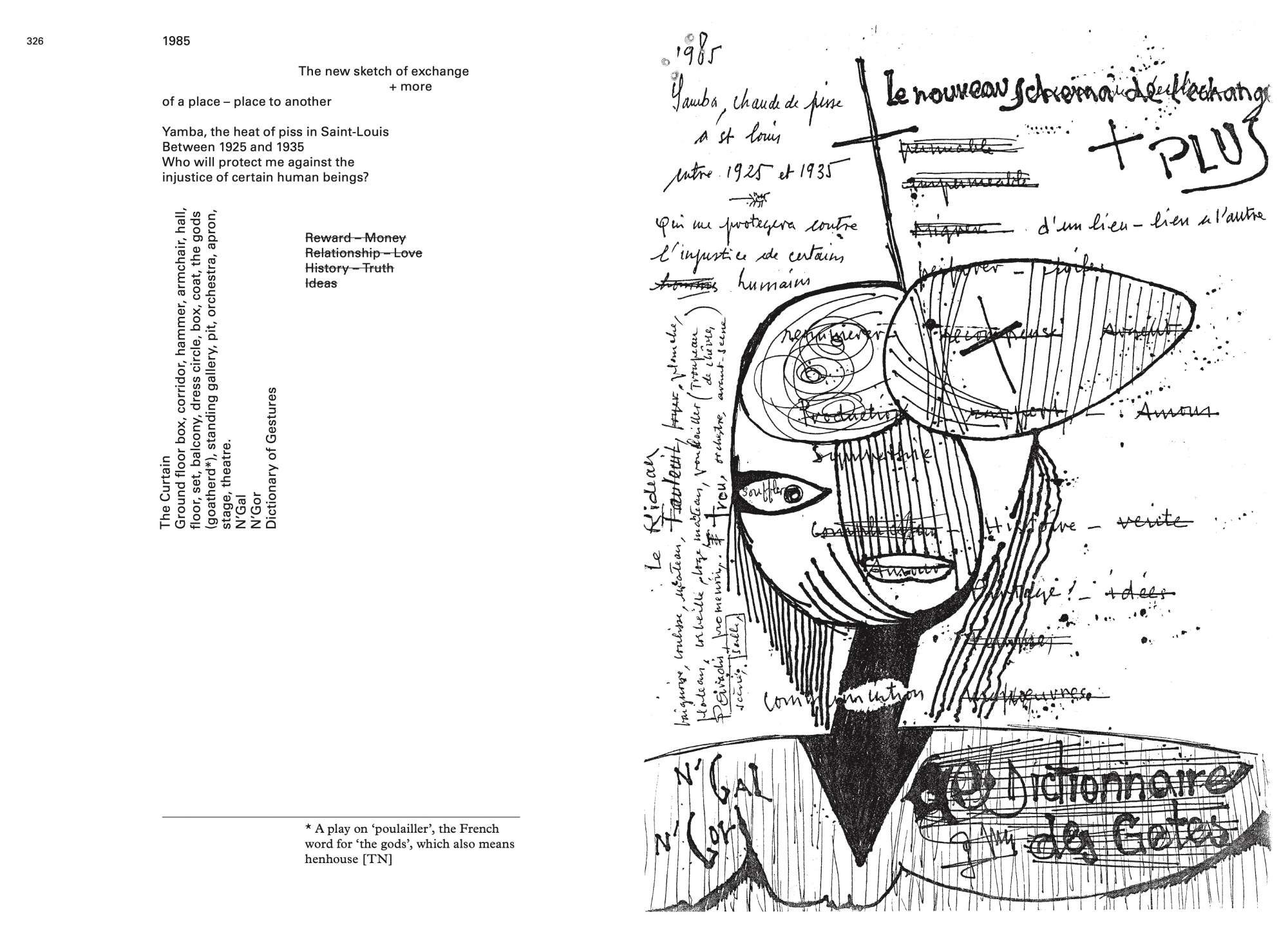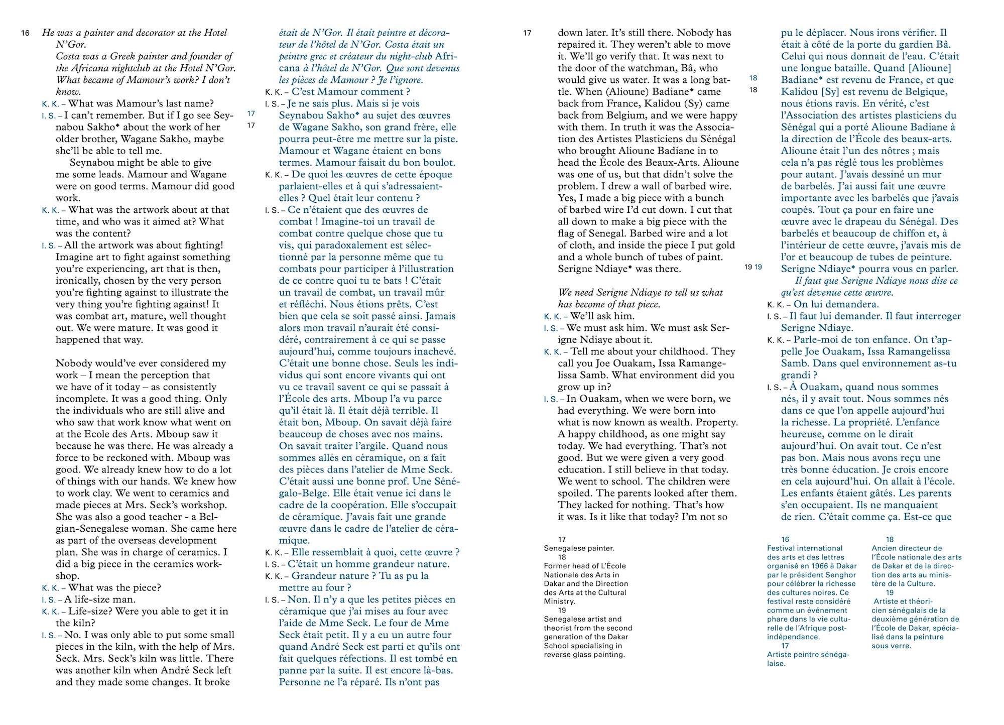 This comprehensive monograph contains a selection of emblematic works by Sengalese-born artist Issa Samb, aka Joe Ouakam. The publication follows Samb’s first solo exhibition in Europe, curated by Koyo Kouoh, entitled “WORD! WORD? WORD! Issa Samb and the Undecipherable Form,” at the Office for Contemporary Art Norway (OCA). The exhibition is organized in collaboration with Raw Material Company in Dakar, where it will travel to in late 2013. The exhibition focuses on Samb’s multifaceted practice, bringing together work from the past twenty-five years, including paintings, drawings, sculptures, performances, assemblages, and installations, as well as essays, plays, notes, and poems. The publication contains essays by independent curator and novelist Simon Njami and art historian Sylvette Maurin, and a conversation between the artist and Koyo Kouoh.