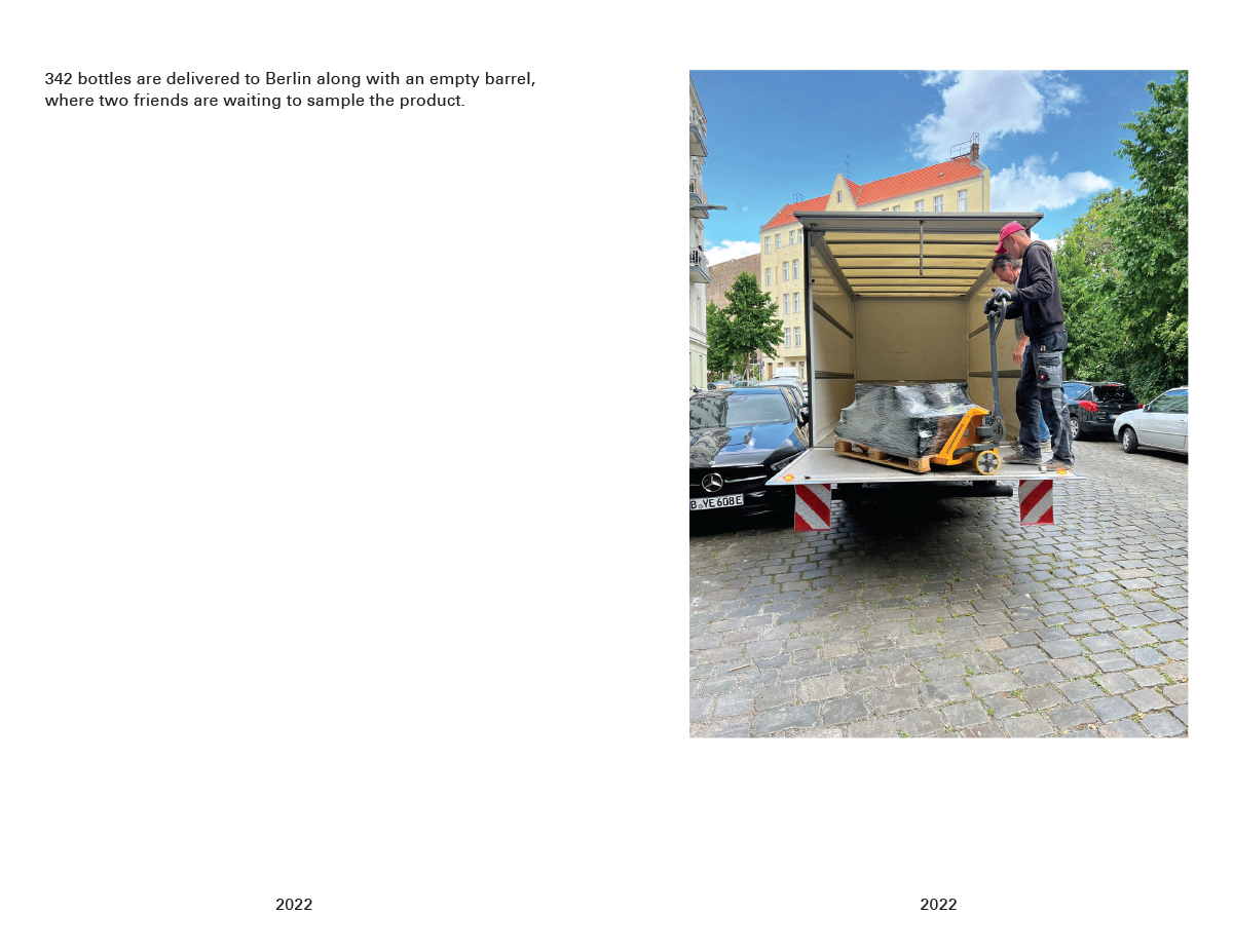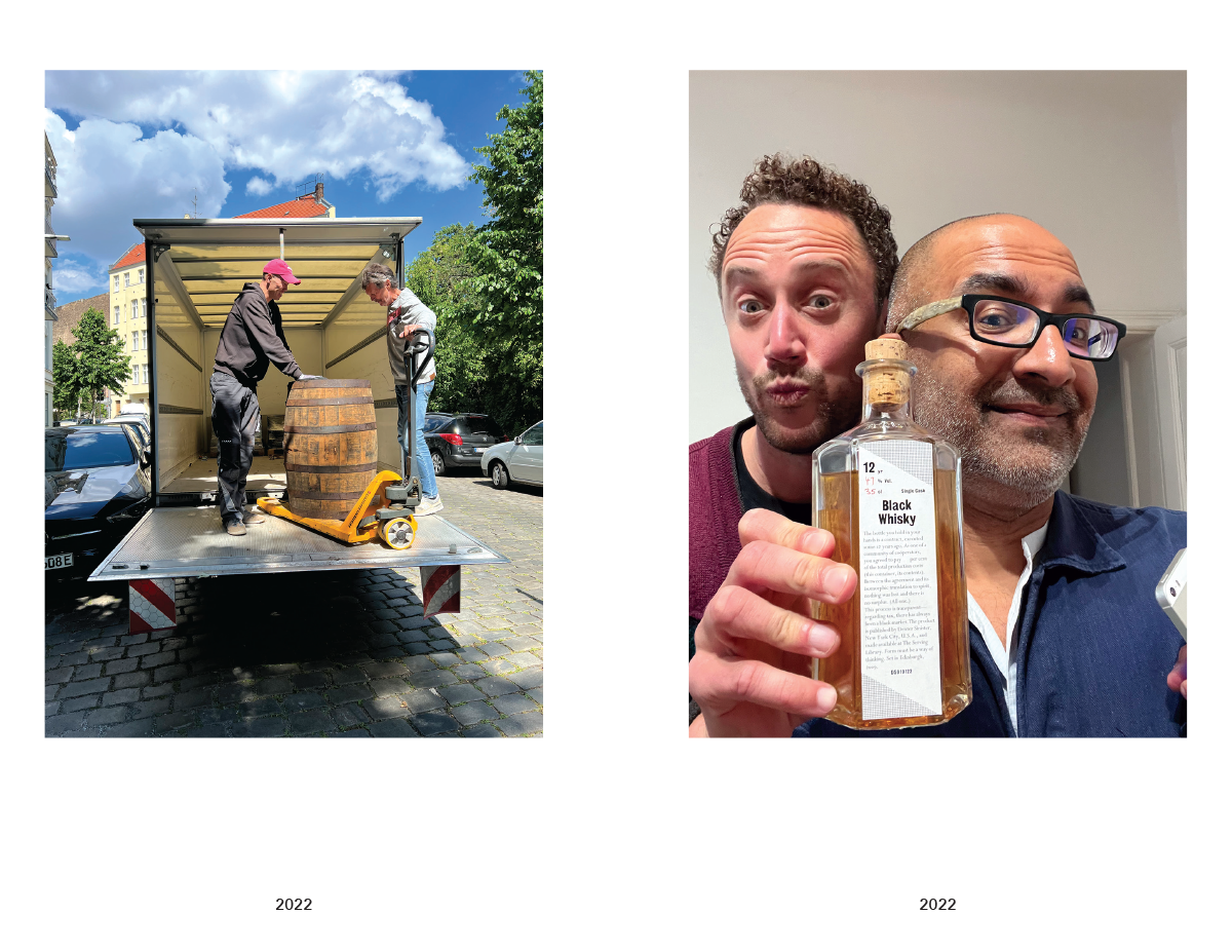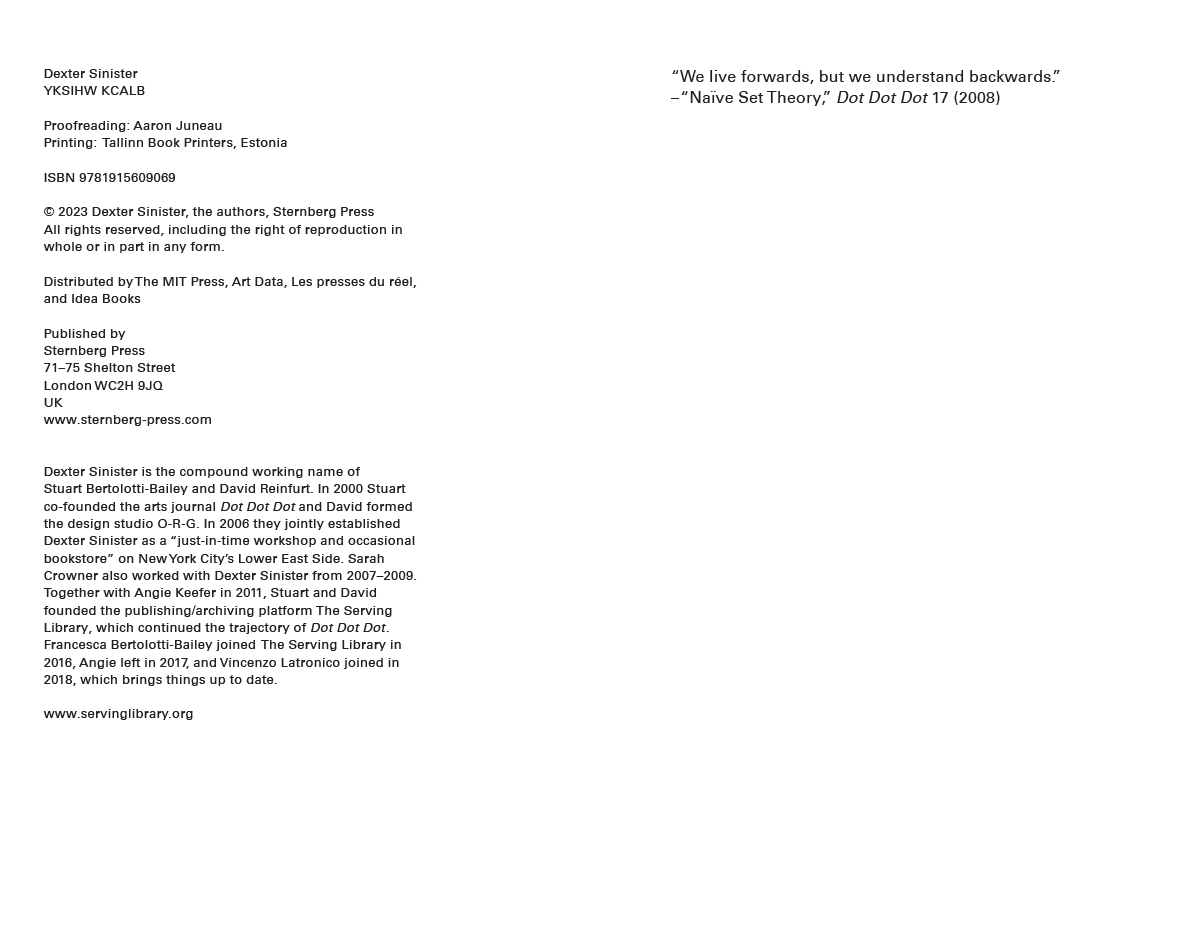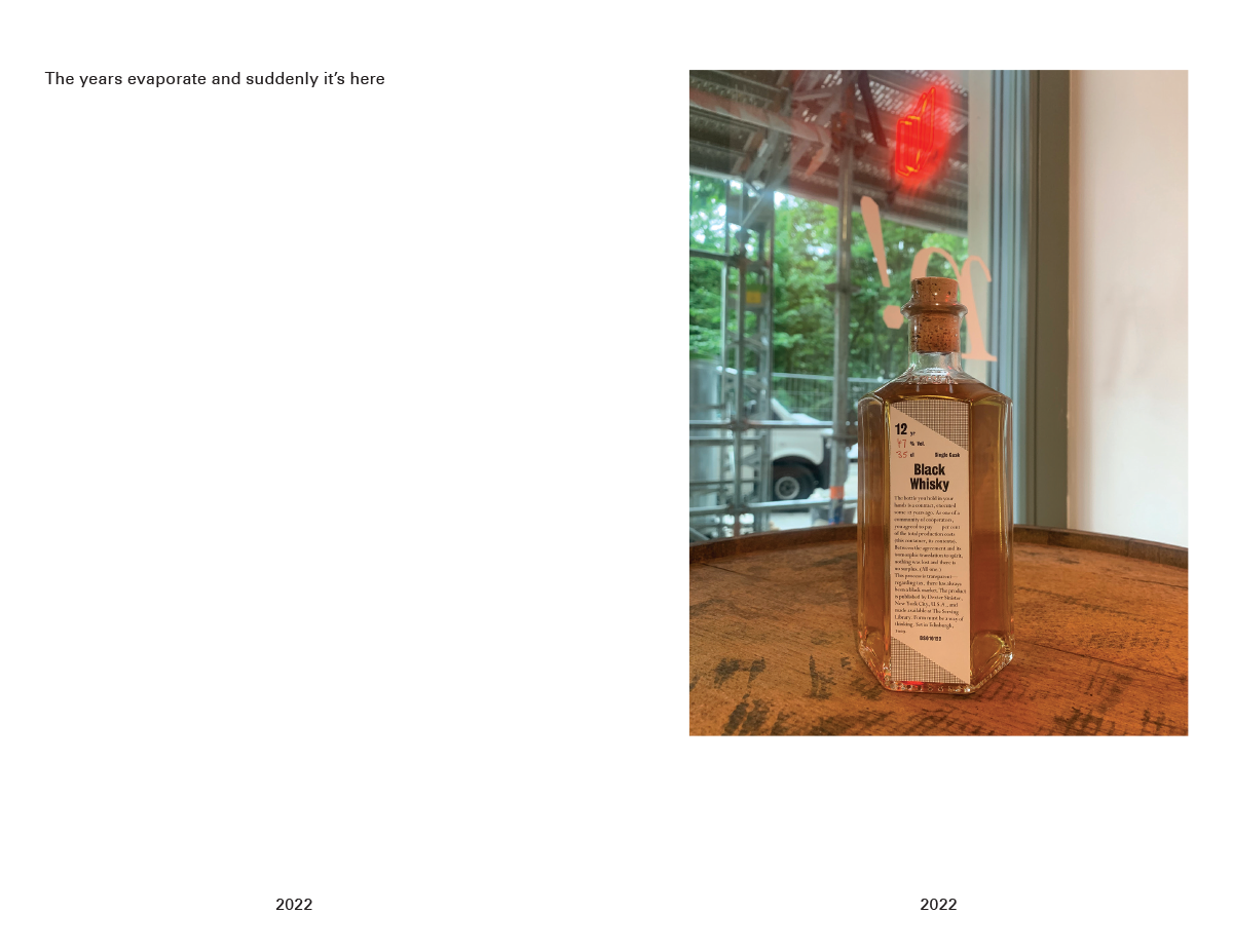 yksihW kcalB recounts the 15-year history of the production of a "German scotch" Black Whisky, made by Dexter Sinister together with Stahlemühle, a distillery set up by former publisher, Christoph Keller. The story is told in reverse, starting with the delivery of 342 bottles to Berlin in 2022, and ending with an interview with Christoph for the journal Dot Dot Dot in 2007, during which the idea began to germinate. A summary of the project is accompanied by photographs taken at the time, interspersed with five previously published texts (an essay, three conversations, and a statement of intent) written along the way.