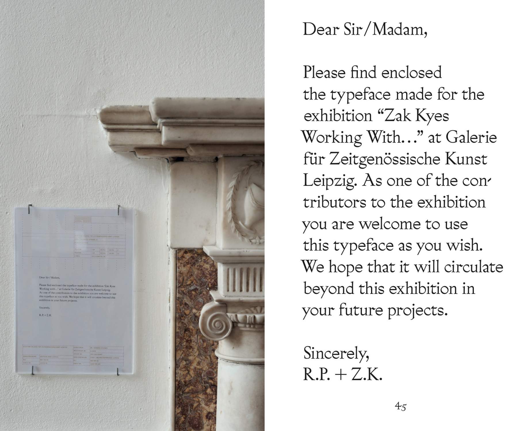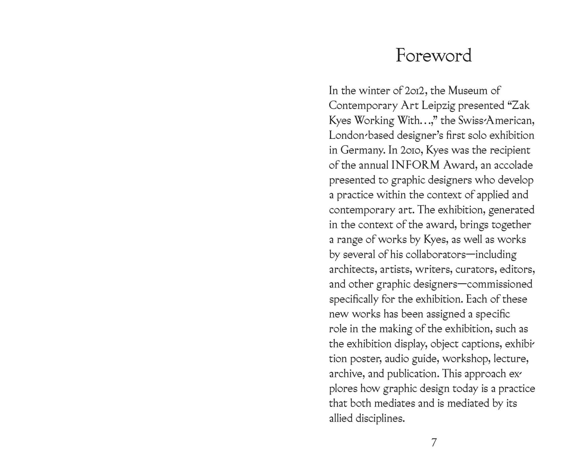 To accompany his exhibition at the Museum of Contemporary Art Leipzig, this book presents the work of the Swiss-American graphic designer Zak Kyes. In collaboration with the curator, Barbara Steiner, the exhibition and publication bring together a range of works by Kyes, as well as works by a host of collaborators that includes architects, artists, writers, curators, editors, and graphic designers, presenting contemporary graphic design as a practice that mediates, and is mediated by, its allied disciplines.