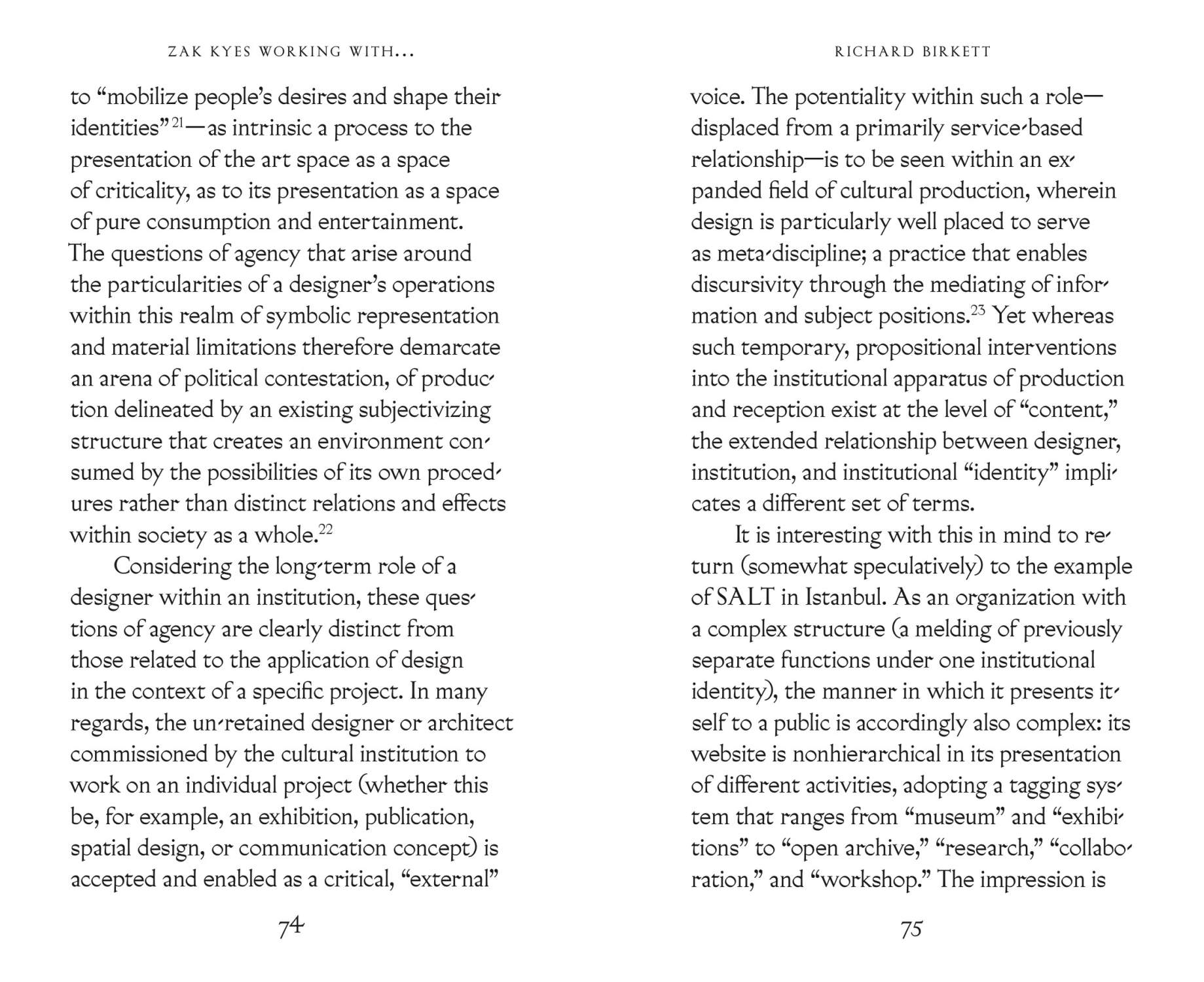 Kyes, who lives and works in London, is known for his critical approach to graphic design, which encompasses publishing, editing, and site-specific projects for and in collaboration with cultural institutions. In 2005, Kyes founded the design studio Zak Group, and, in 2006, he became Art Director of the Architectural Association (AA), London. Under the auspices of the AA, he organized the seminal touring exhibition “Forms of Inquiry: The Architecture of Critical Graphic Design,” and later cofounded Bedford Press, an imprint that seeks to develop new models for contemporary publishing. By broadening the highly specialized role of the designer, Kyes challenges and further develops today’s graphic design practice.
