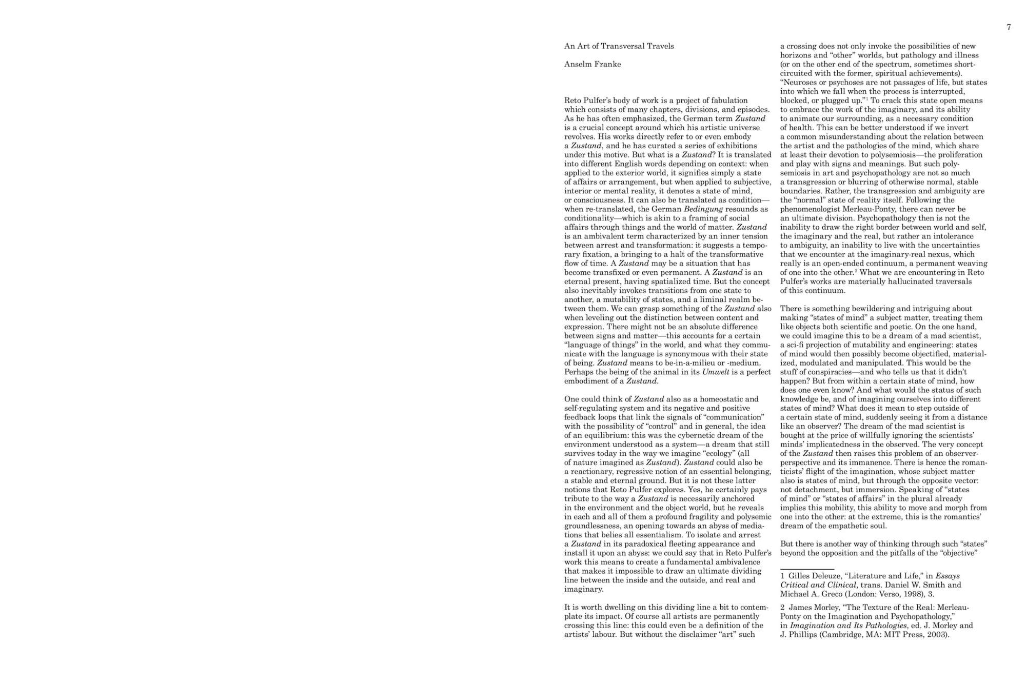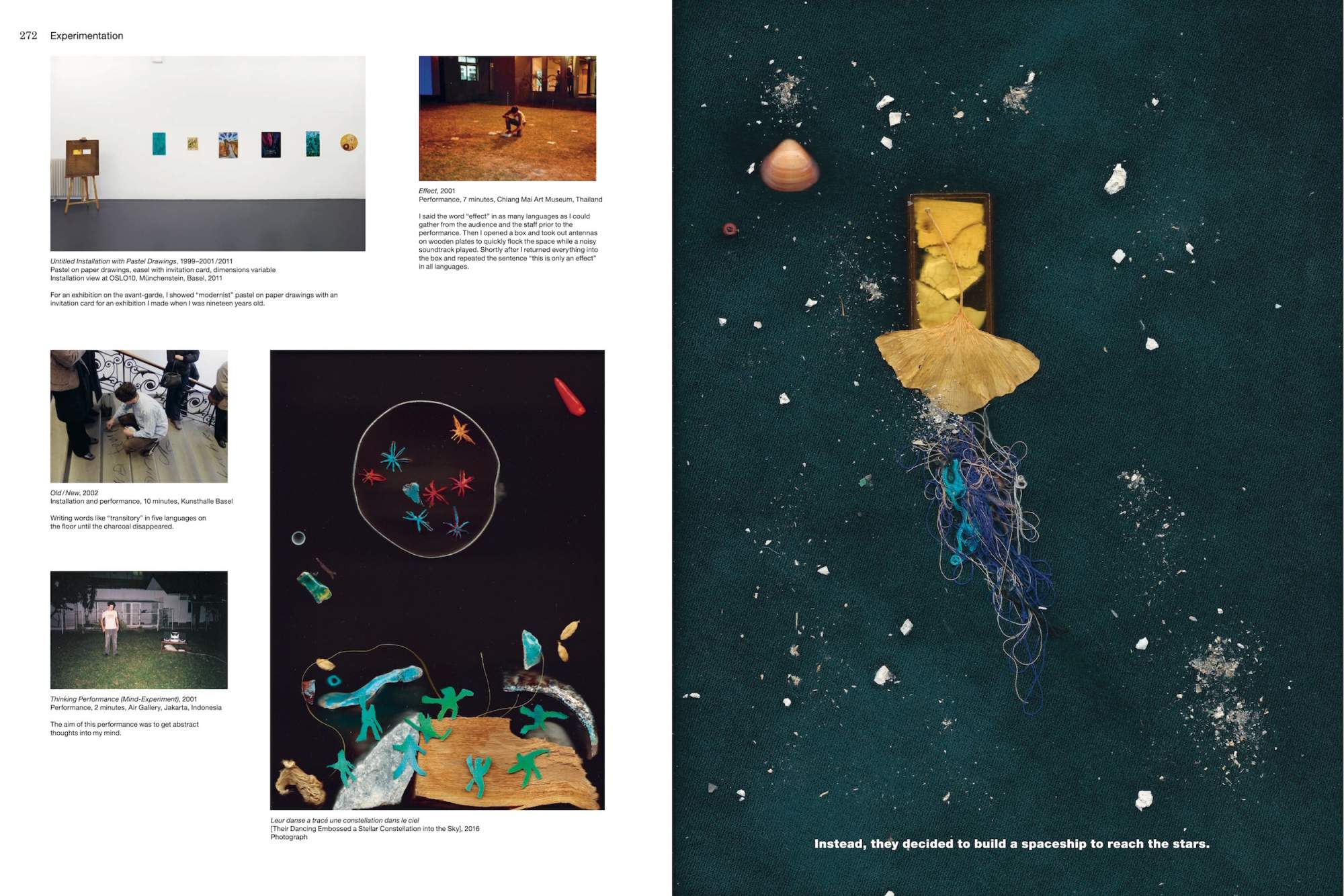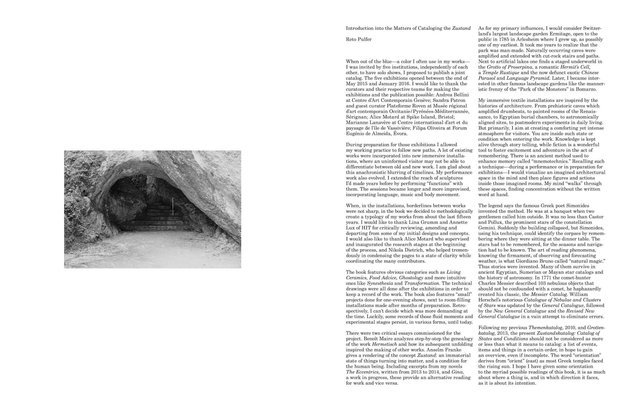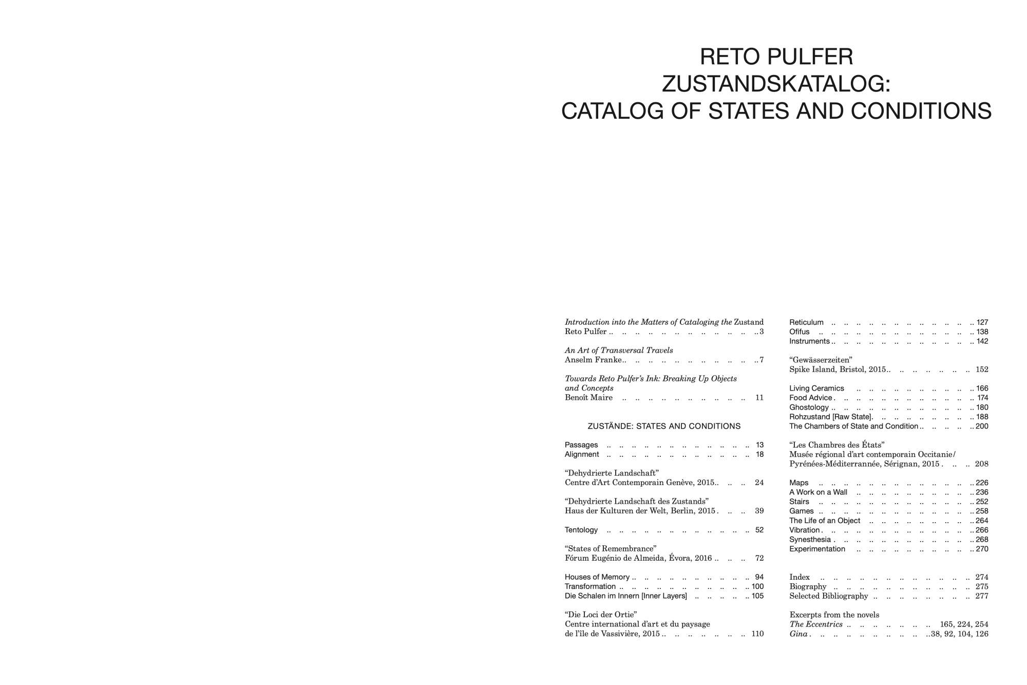 In the style of a catalogue raisonné, Reto Pulfer’s comprehensive monograph, Zustandskatalog: Catalog of States and Conditions, follows the artist’s work over the past fifteen years. Excerpts from the artist’s novels as well as insightful texts by Anselm Franke and Benoît Maire are juxtaposed with 475 documentary photographs of Pulfer’s technical drawings, one-off exhibitions, large-scale installations, and performances. Categories such as living ceramics, food advice, ghostology, synesthesia, and transformation are woven throughout the book, giving unique insight into the ideas and imagination that are part of the work itself.